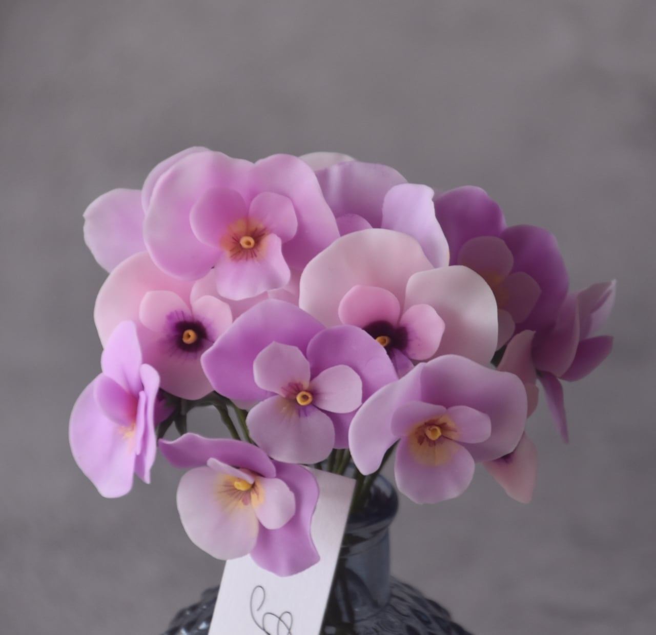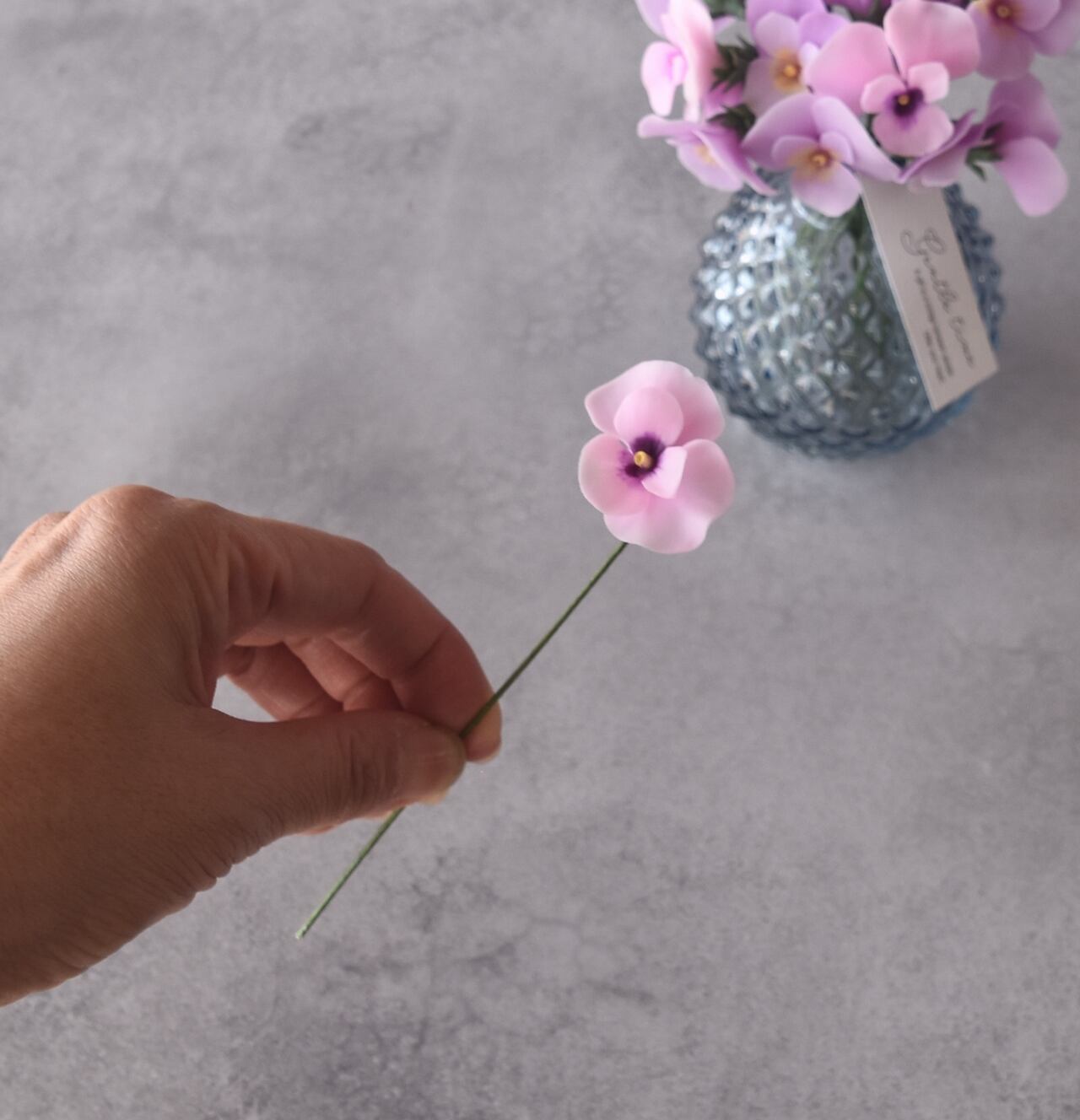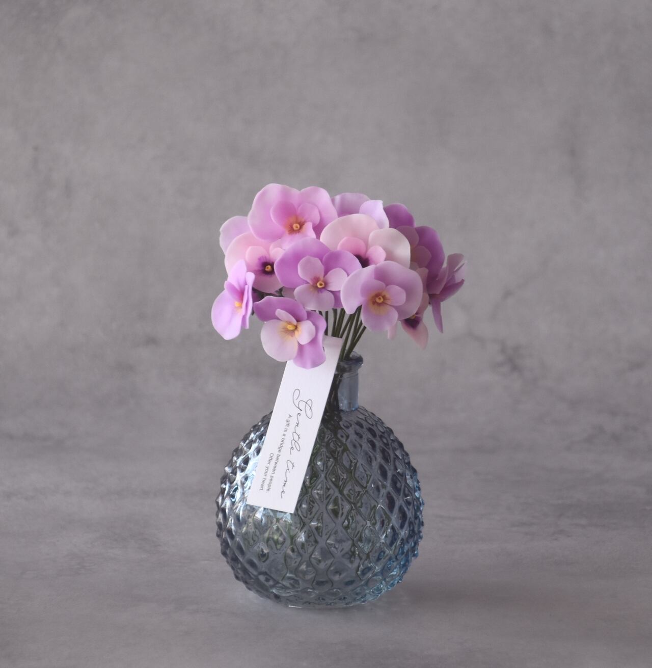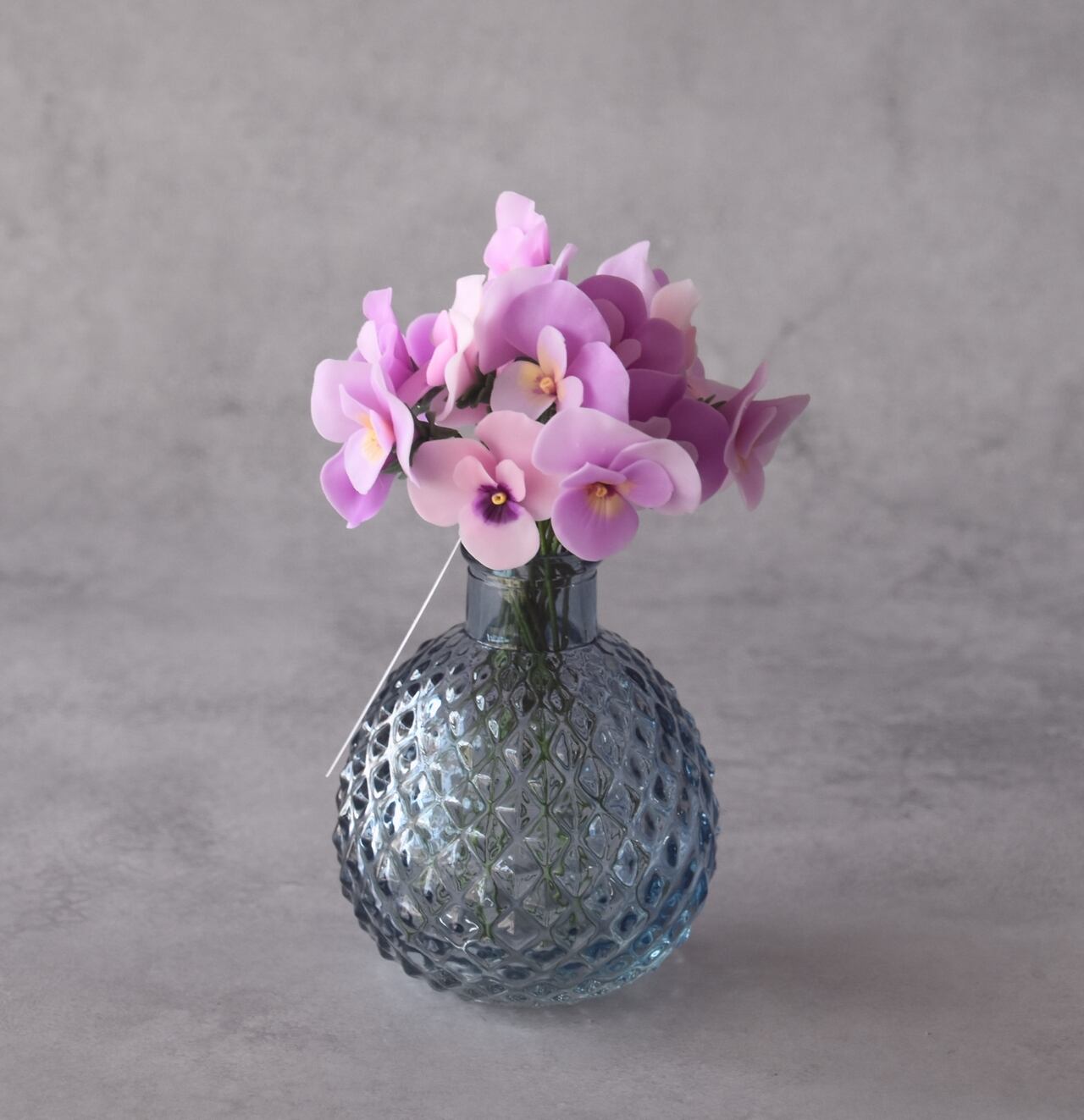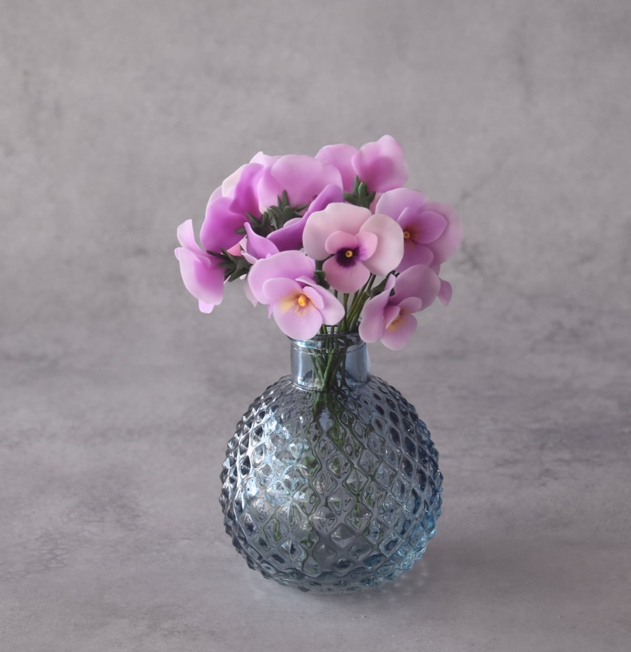 粘土でビオラを制作し、ぷっくりとふくらんだフォルムが可愛い花瓶にアレンジしました。