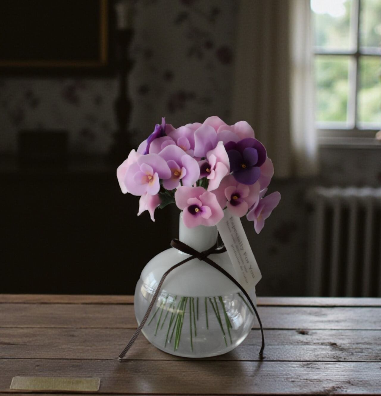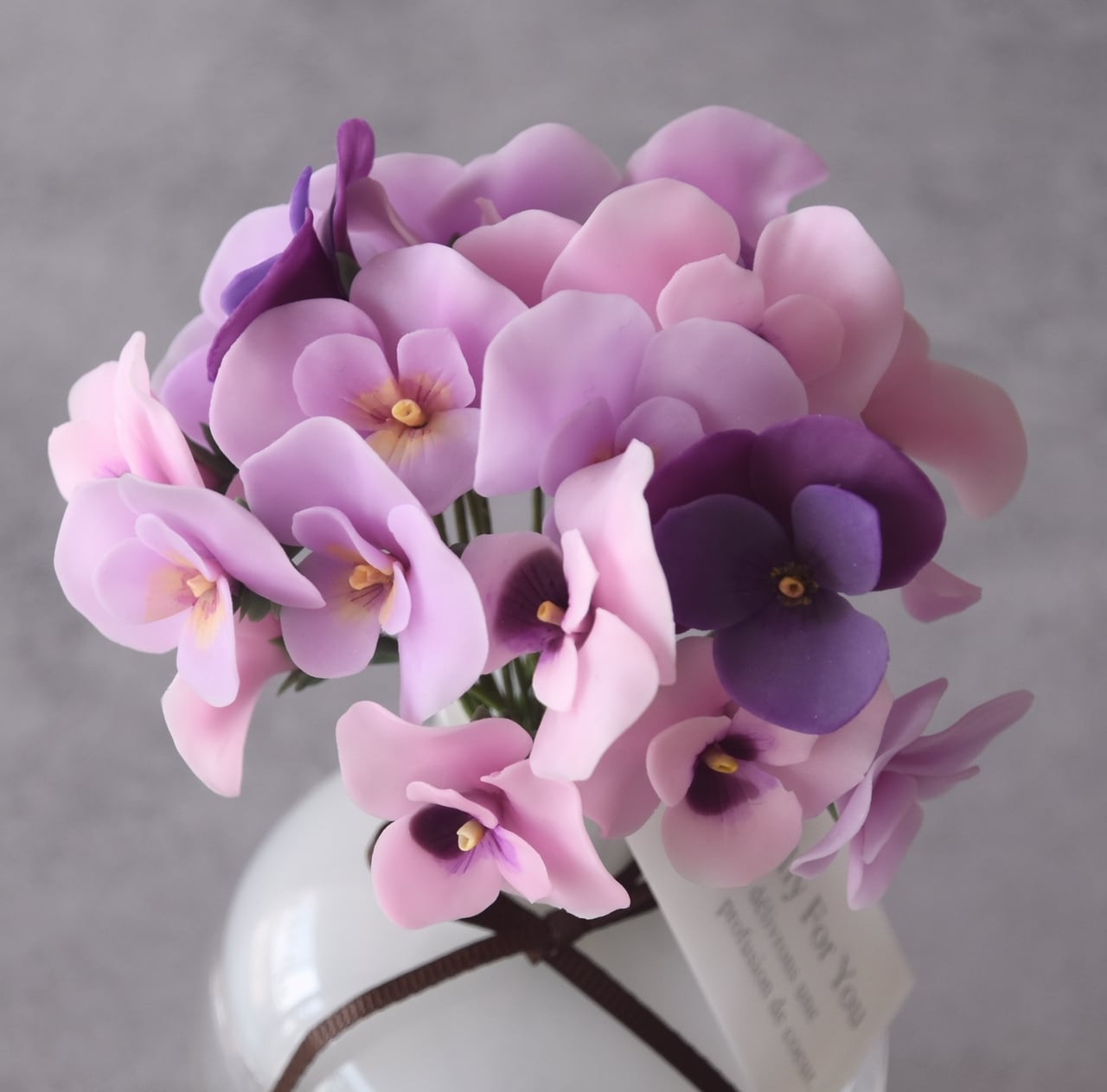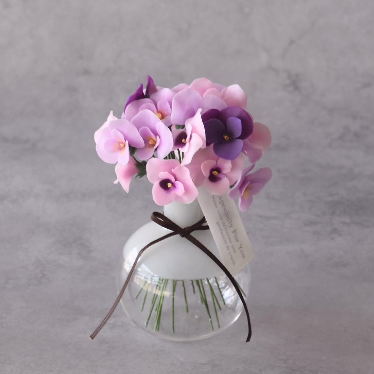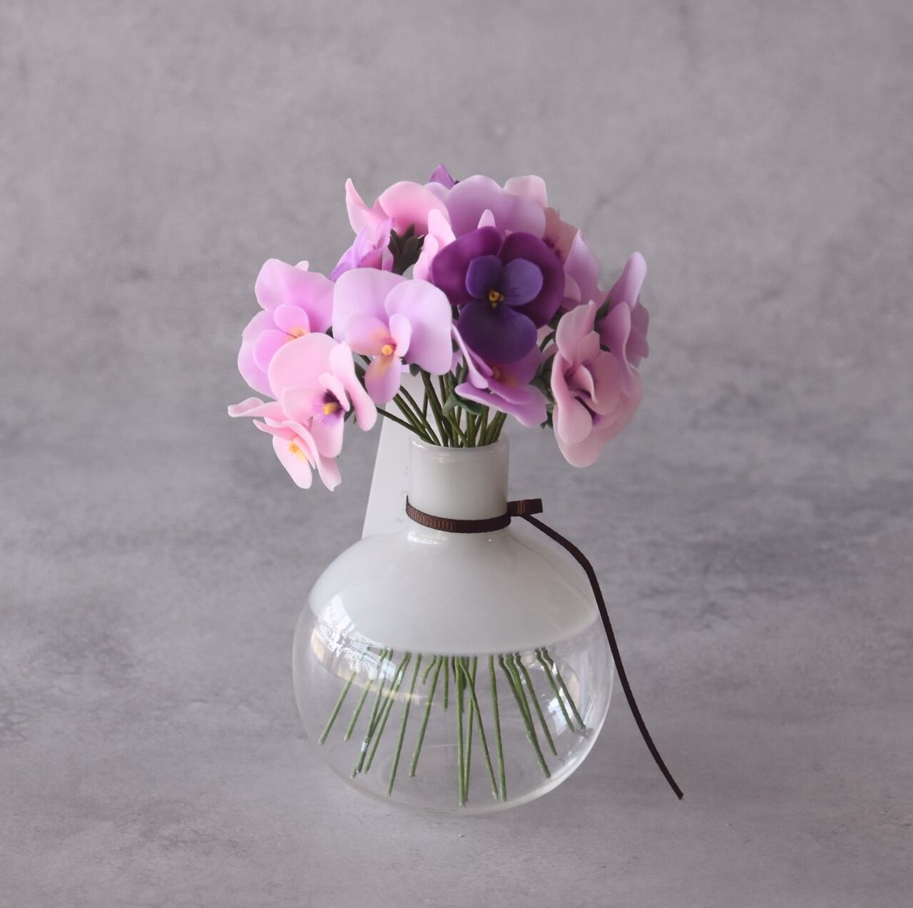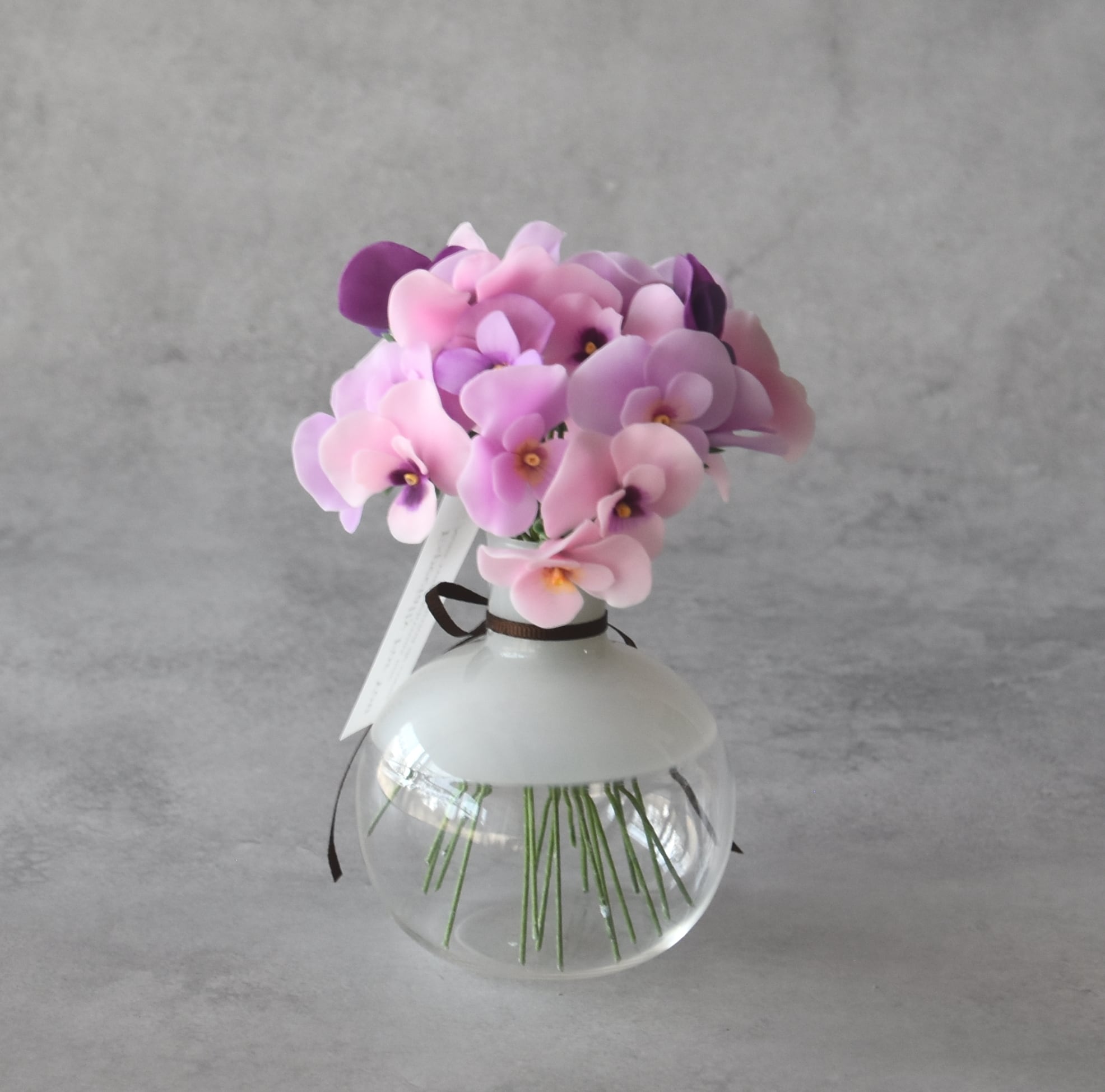 粘土でビオラを制作し、シンプルな花瓶にアレンジしました。