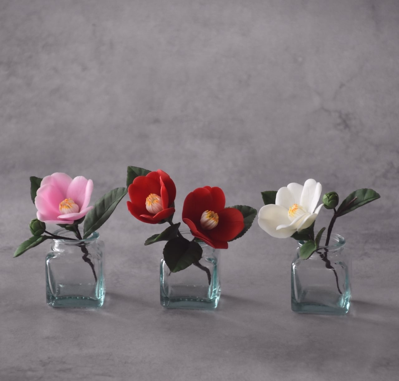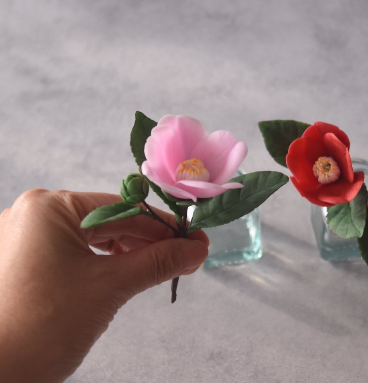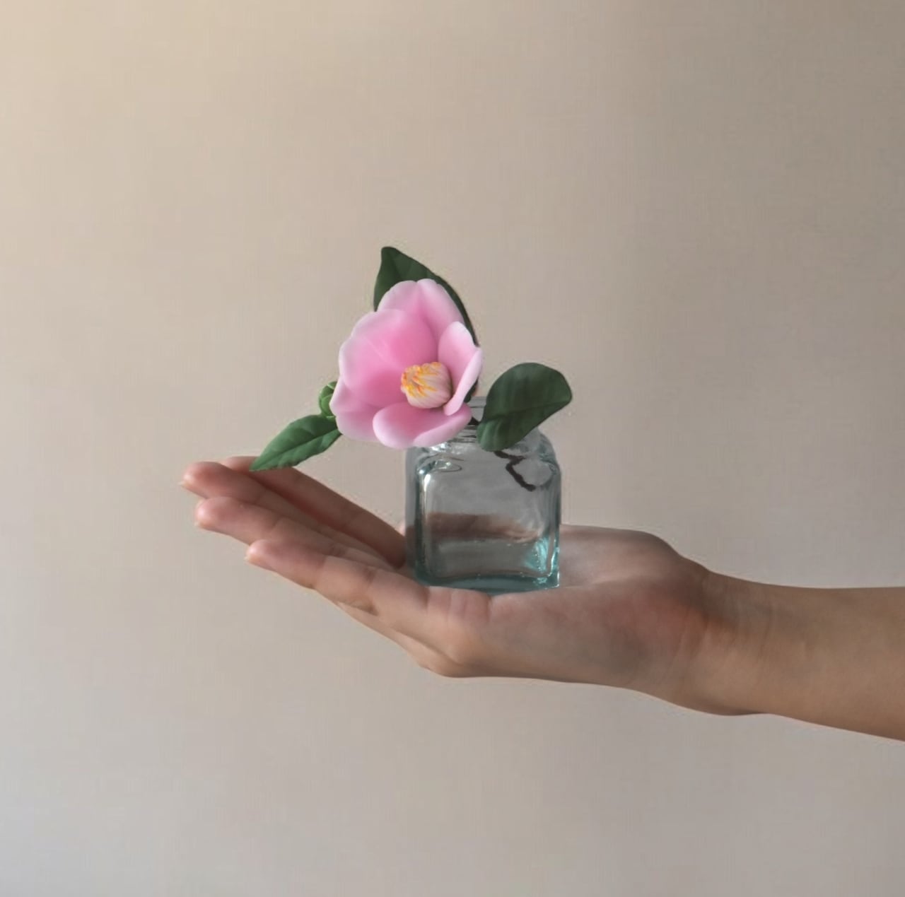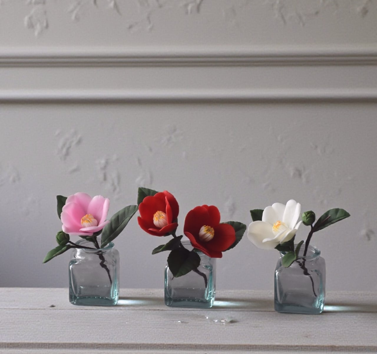 手のひらにちょこんと乗る小さなサイズで、椿がとても可愛らしい作品です。