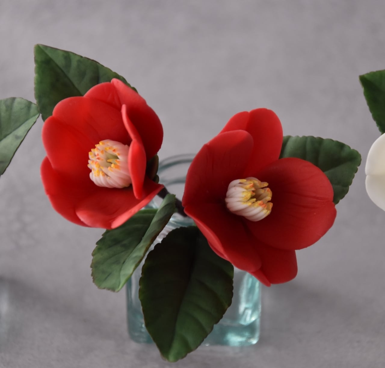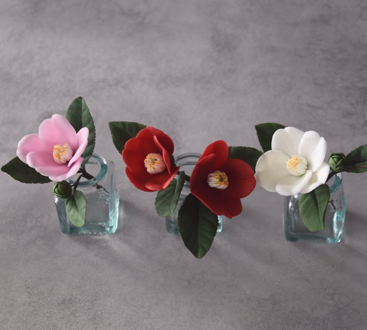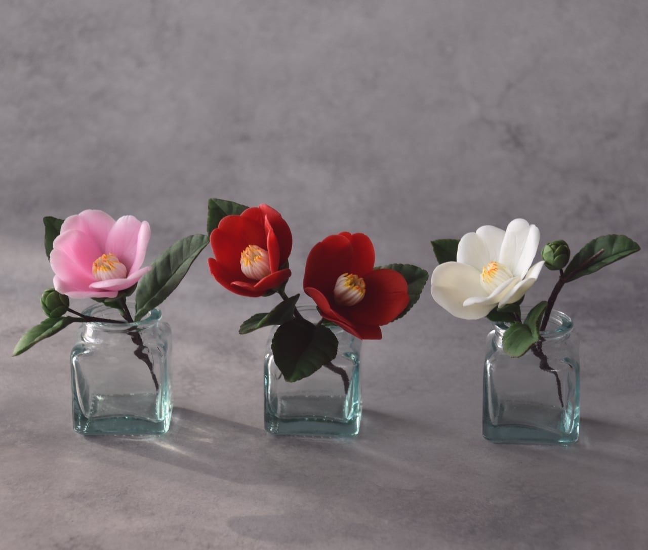 手のひらにちょこんと乗る小さなサイズで、椿がとても可愛らしい作品です。