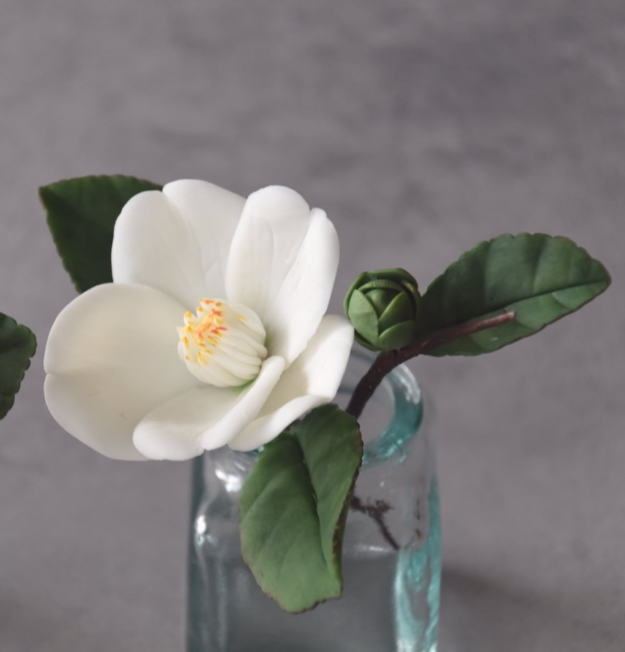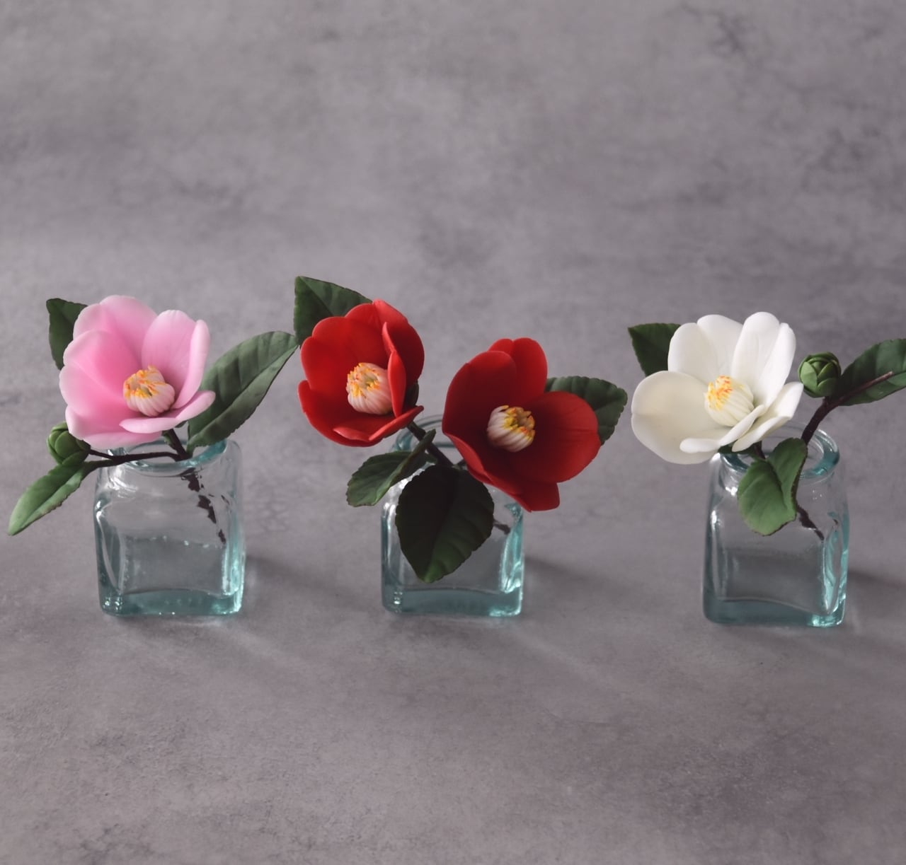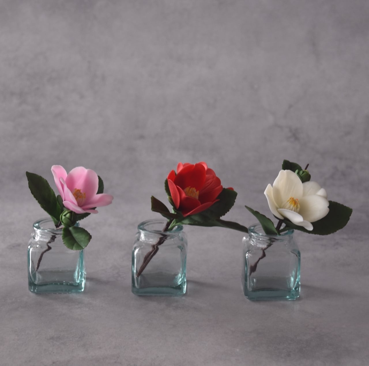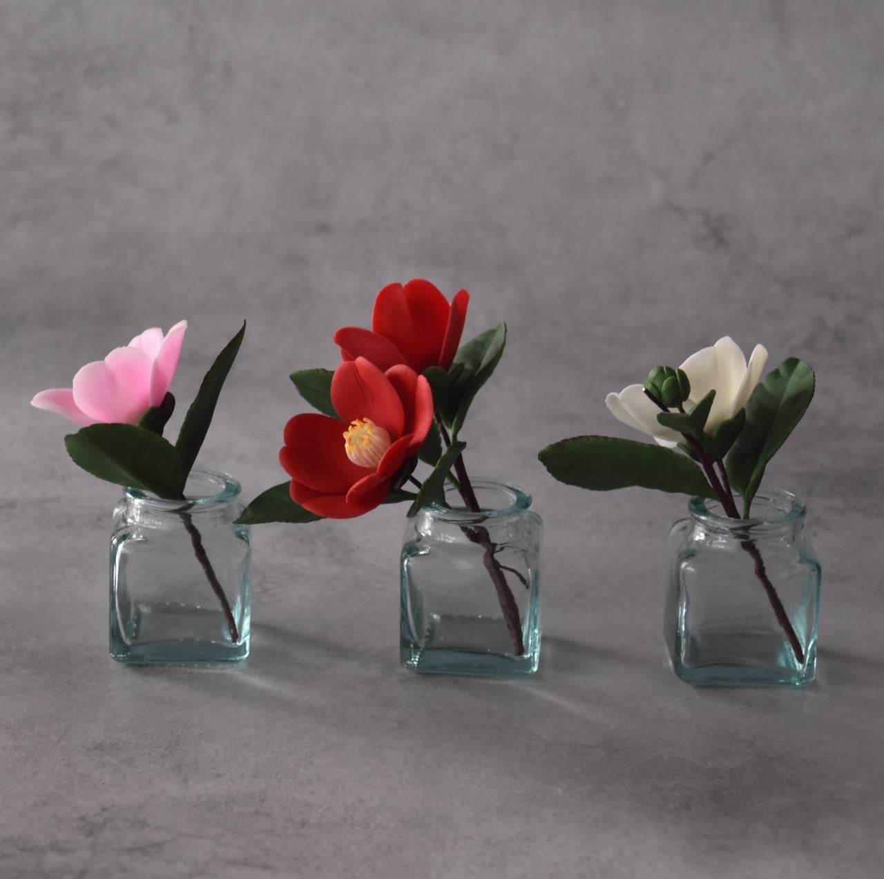 手のひらにちょこんと乗る小さなサイズで、椿がとても可愛らしい作品です。