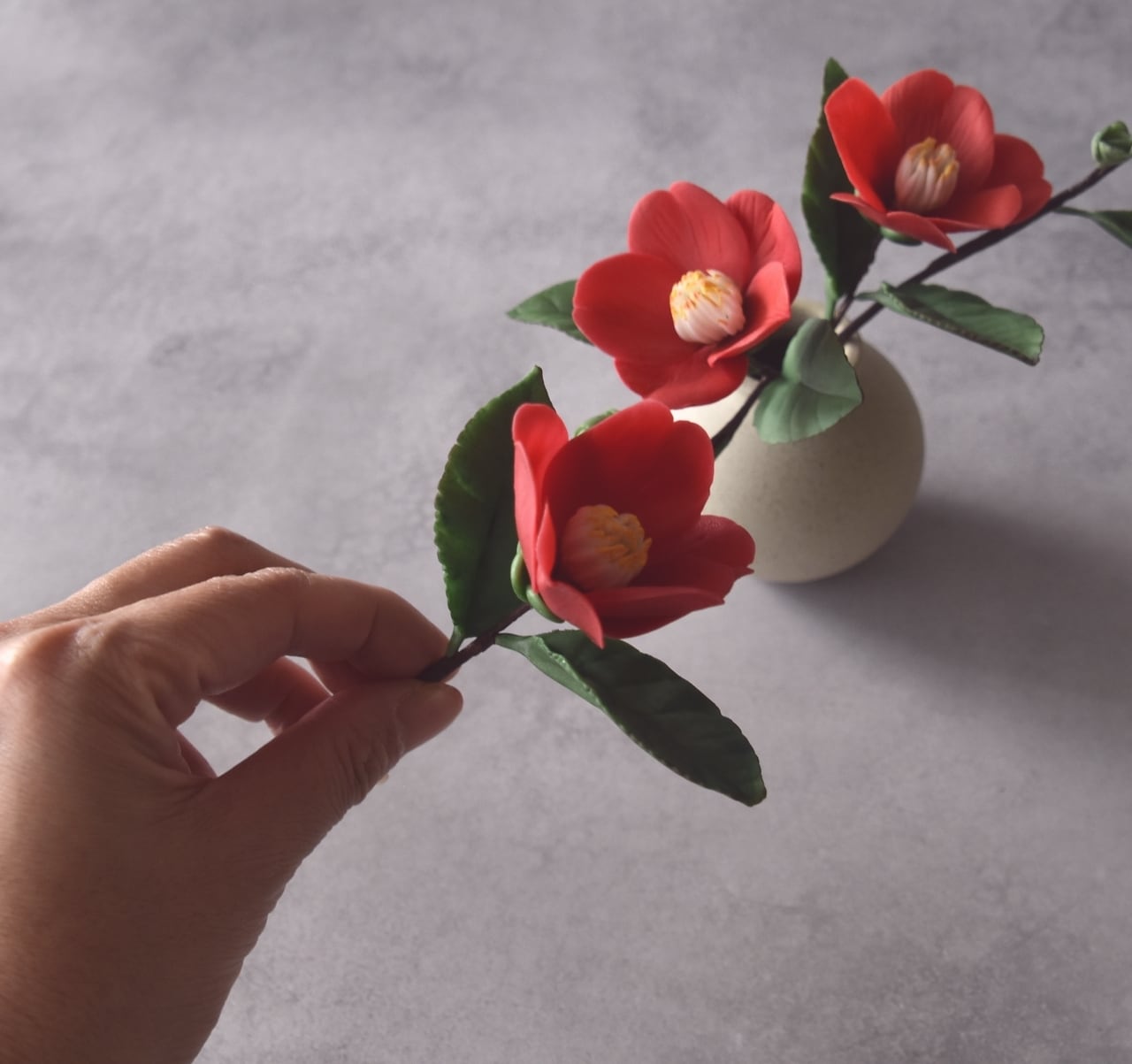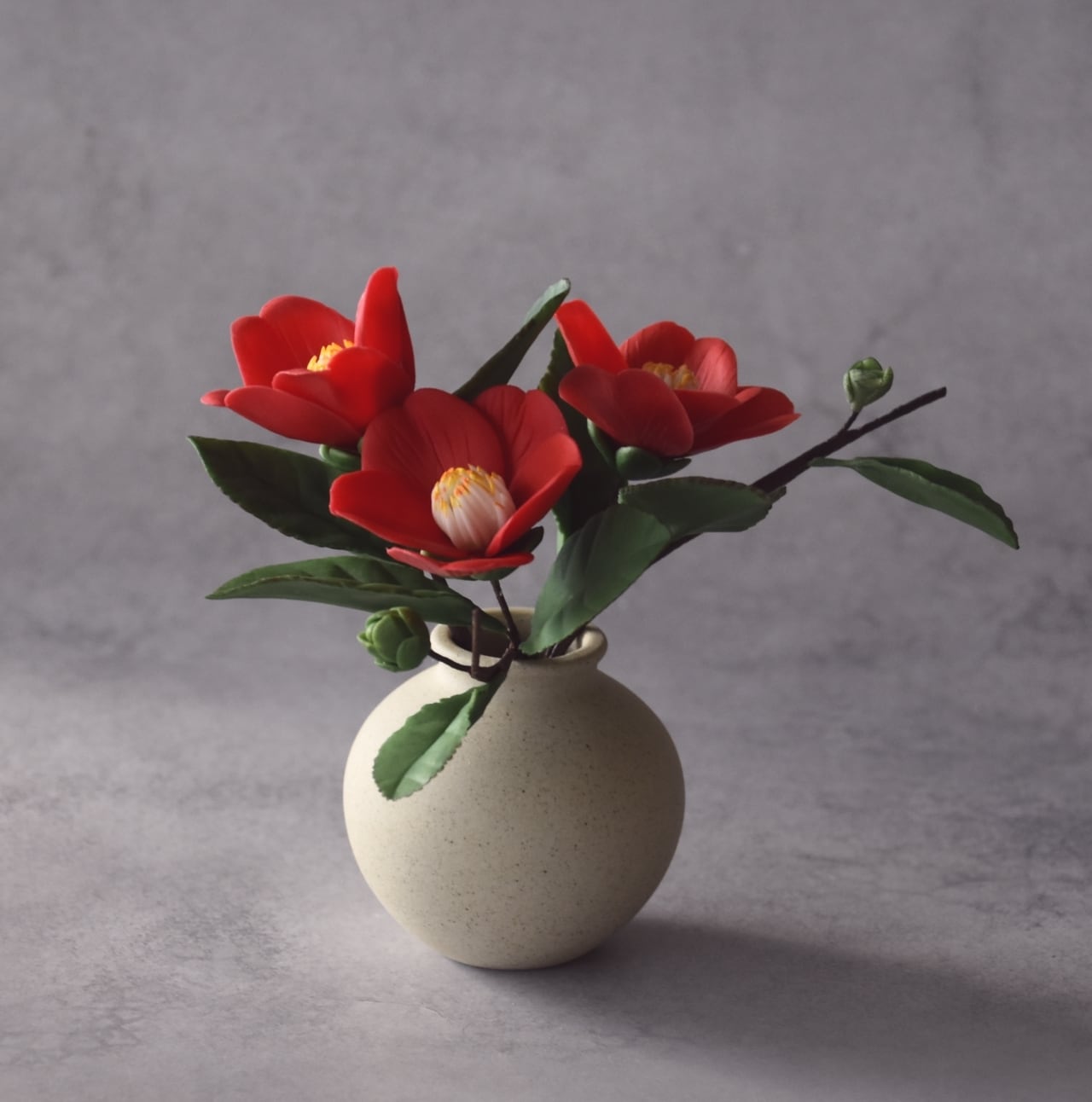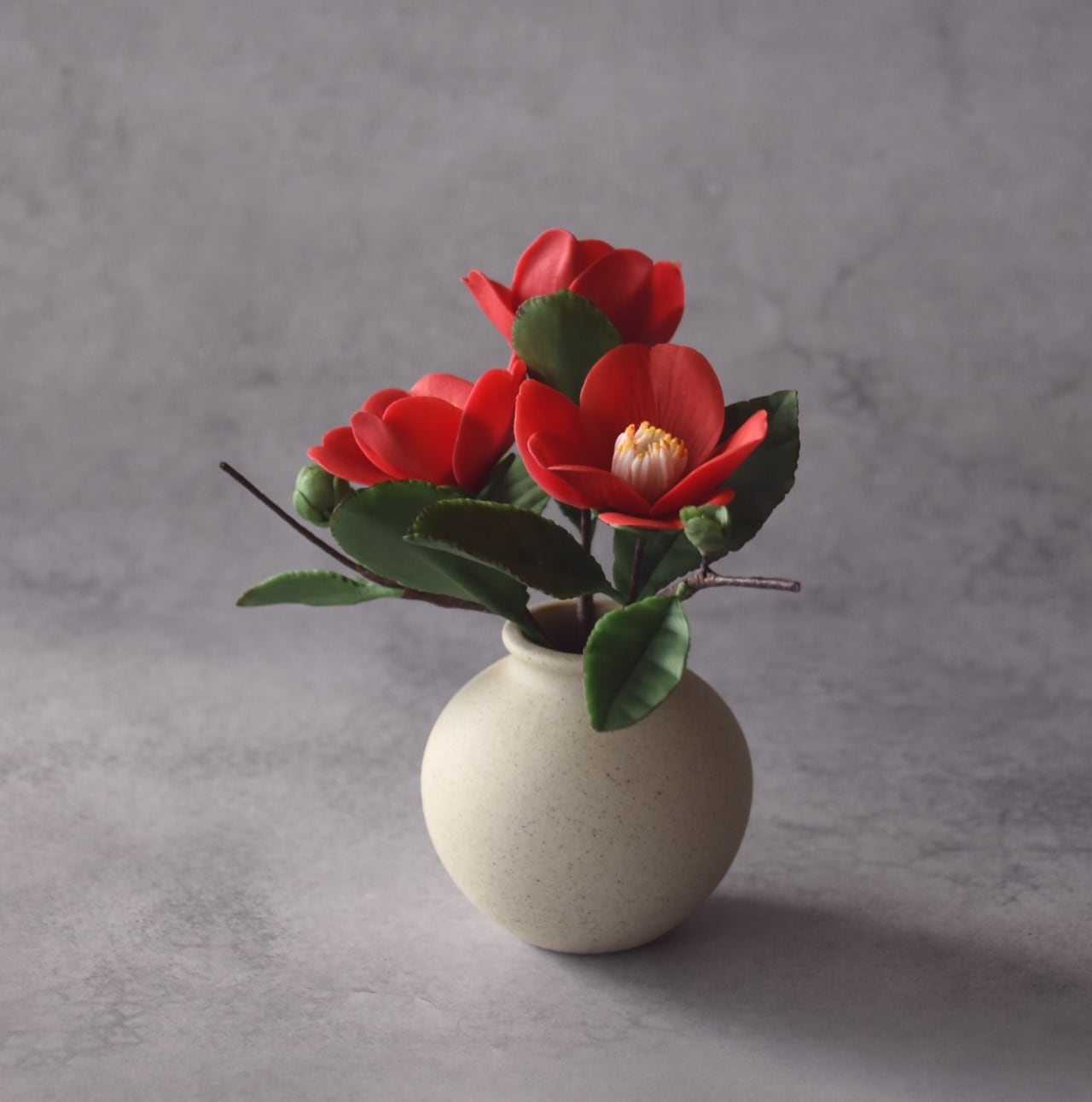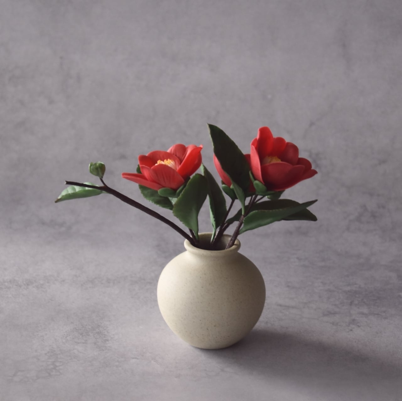手のひらにちょこんと乗る小さなサイズで、椿がとても可愛らしい作品です。