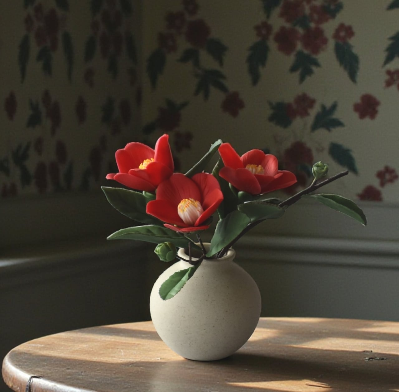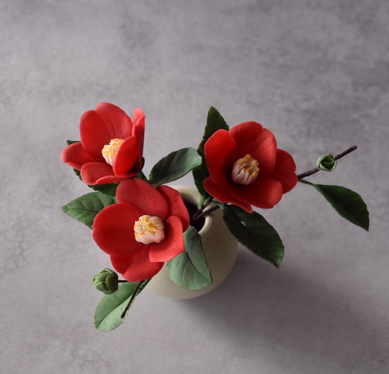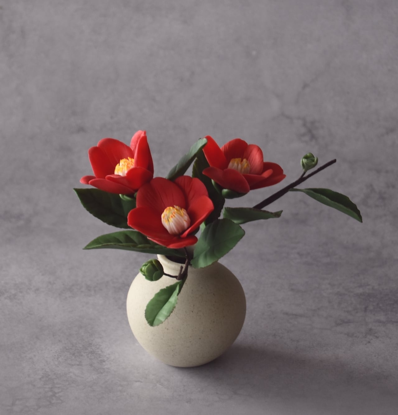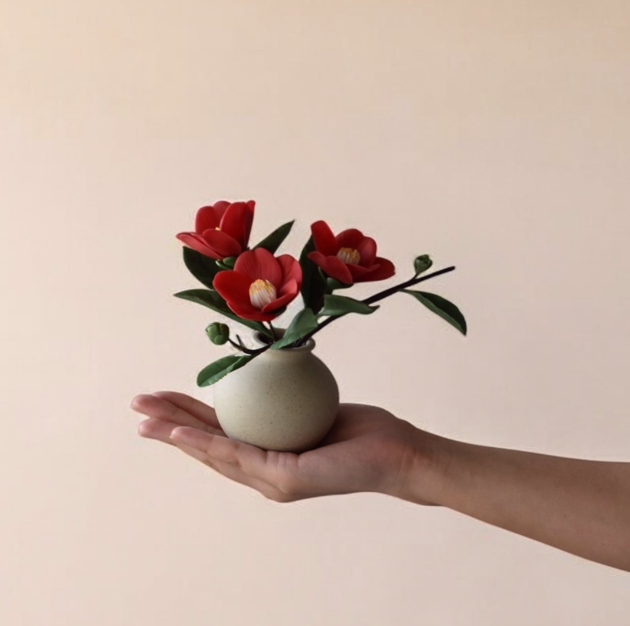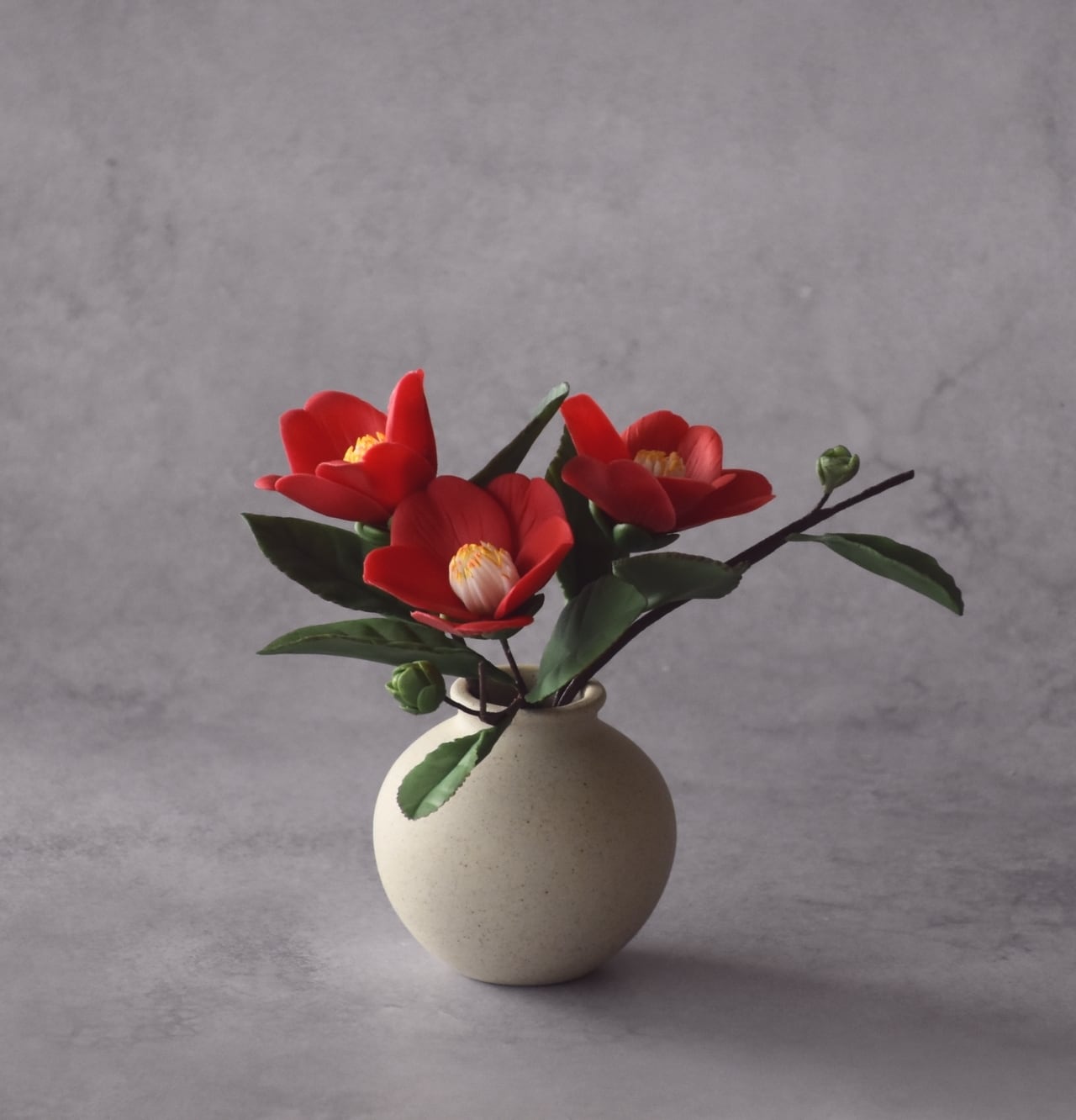 手のひらにちょこんと乗る小さなサイズで、椿がとても可愛らしい作品です。