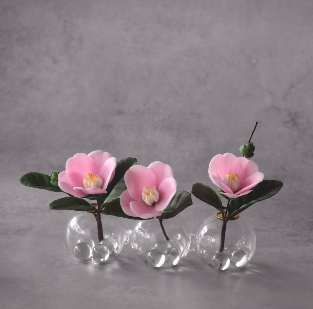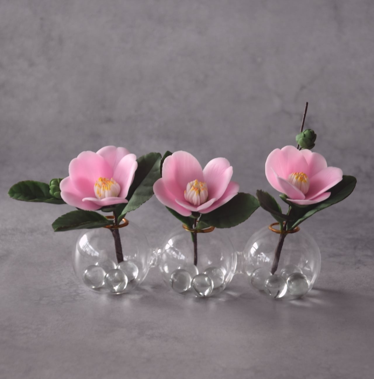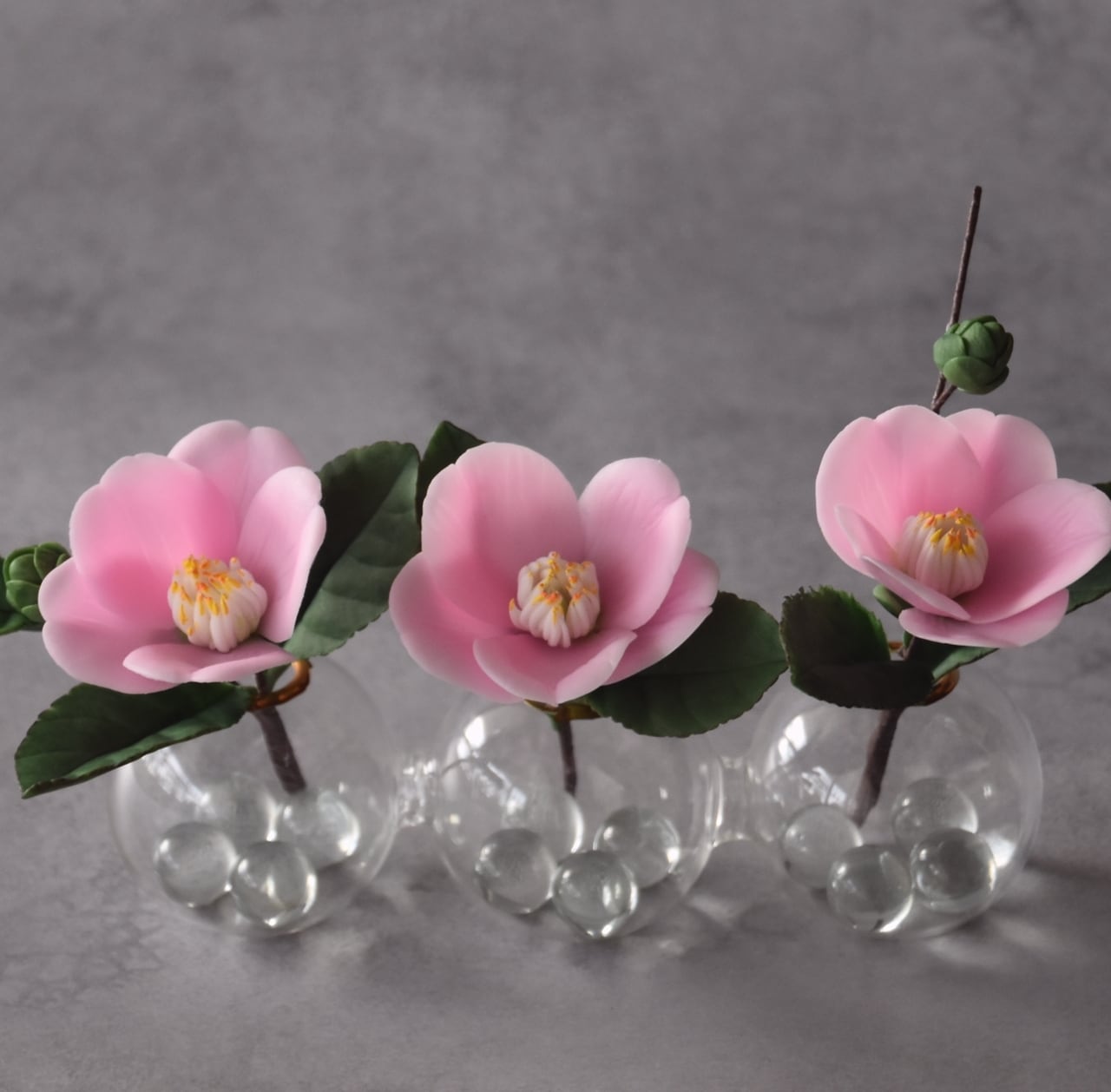 粘土で椿をつくり、おしやれなフォームベースに飾りました。