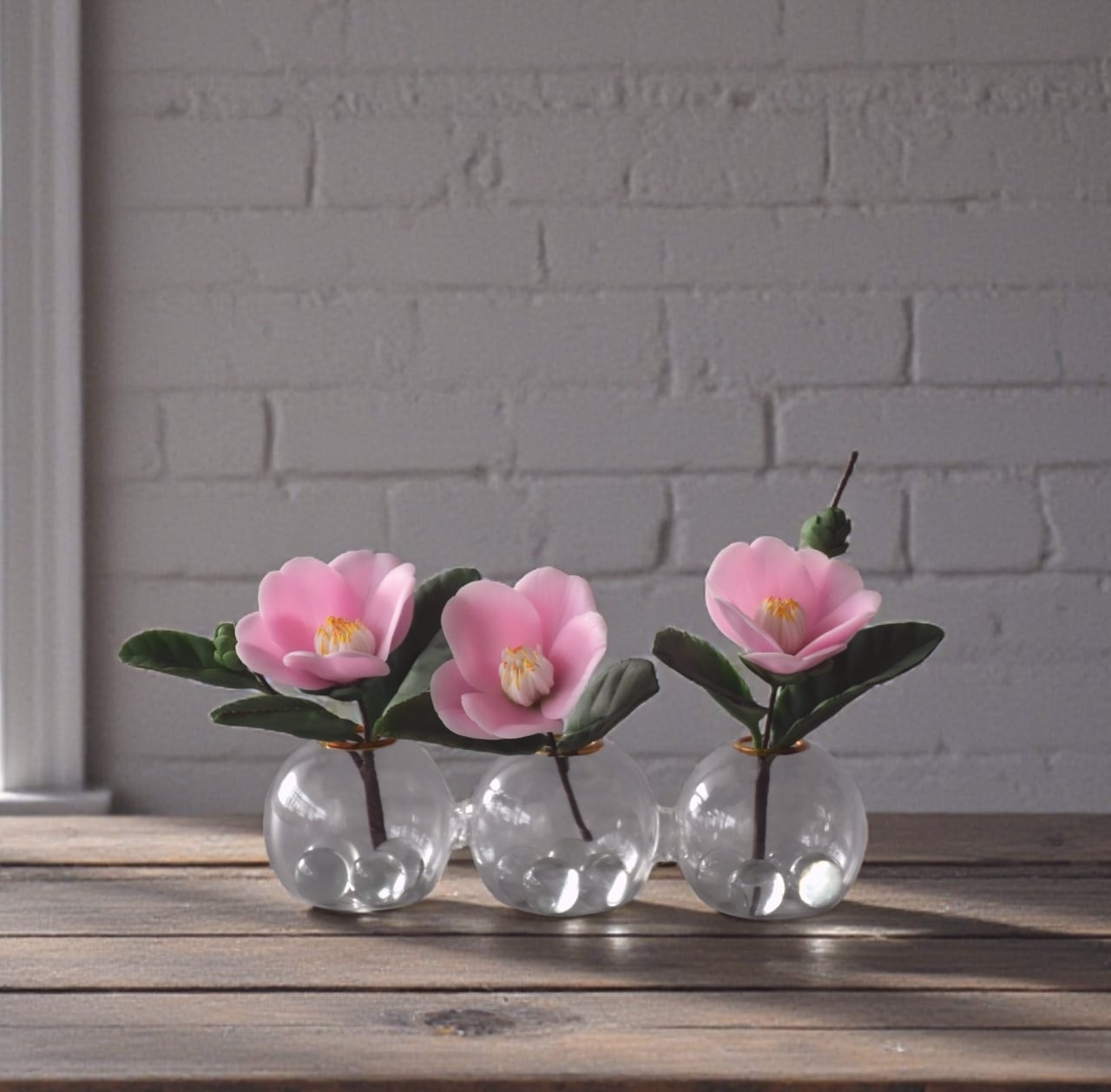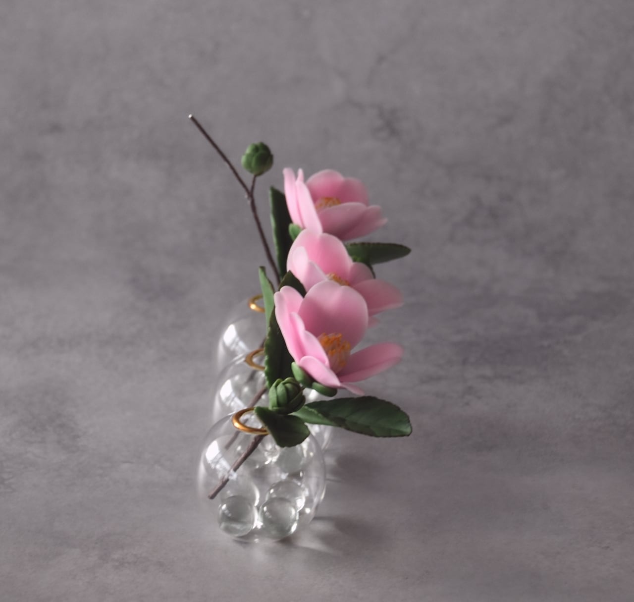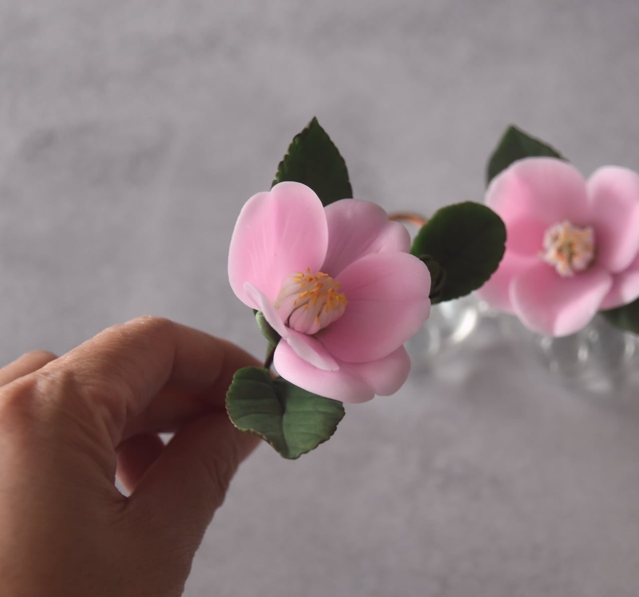 粘土で椿をつくり、おしやれなフォームベースに飾りました。