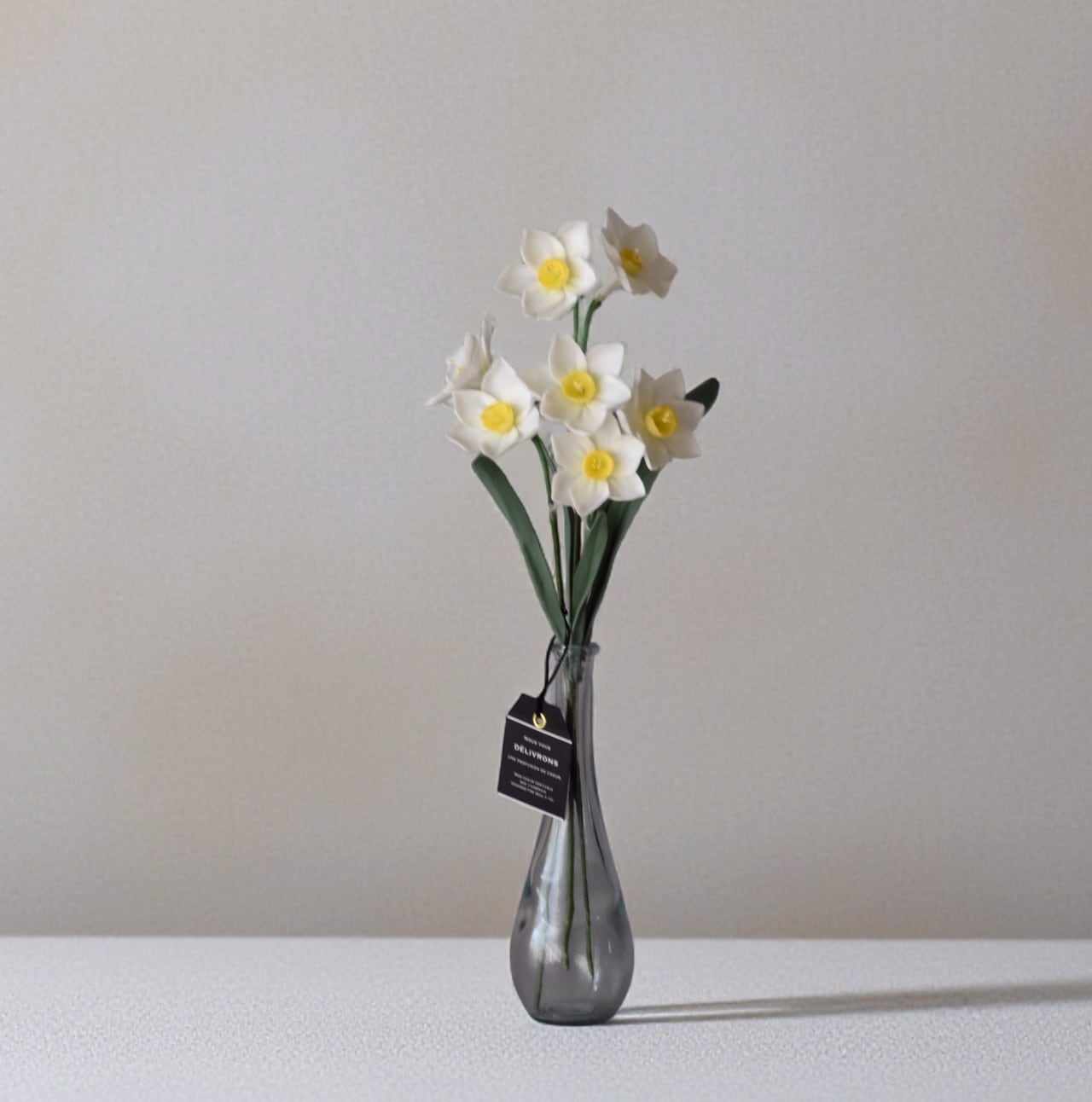 粘土で水仙(スイセン)を制作し、シンプルな花瓶に飾りました。