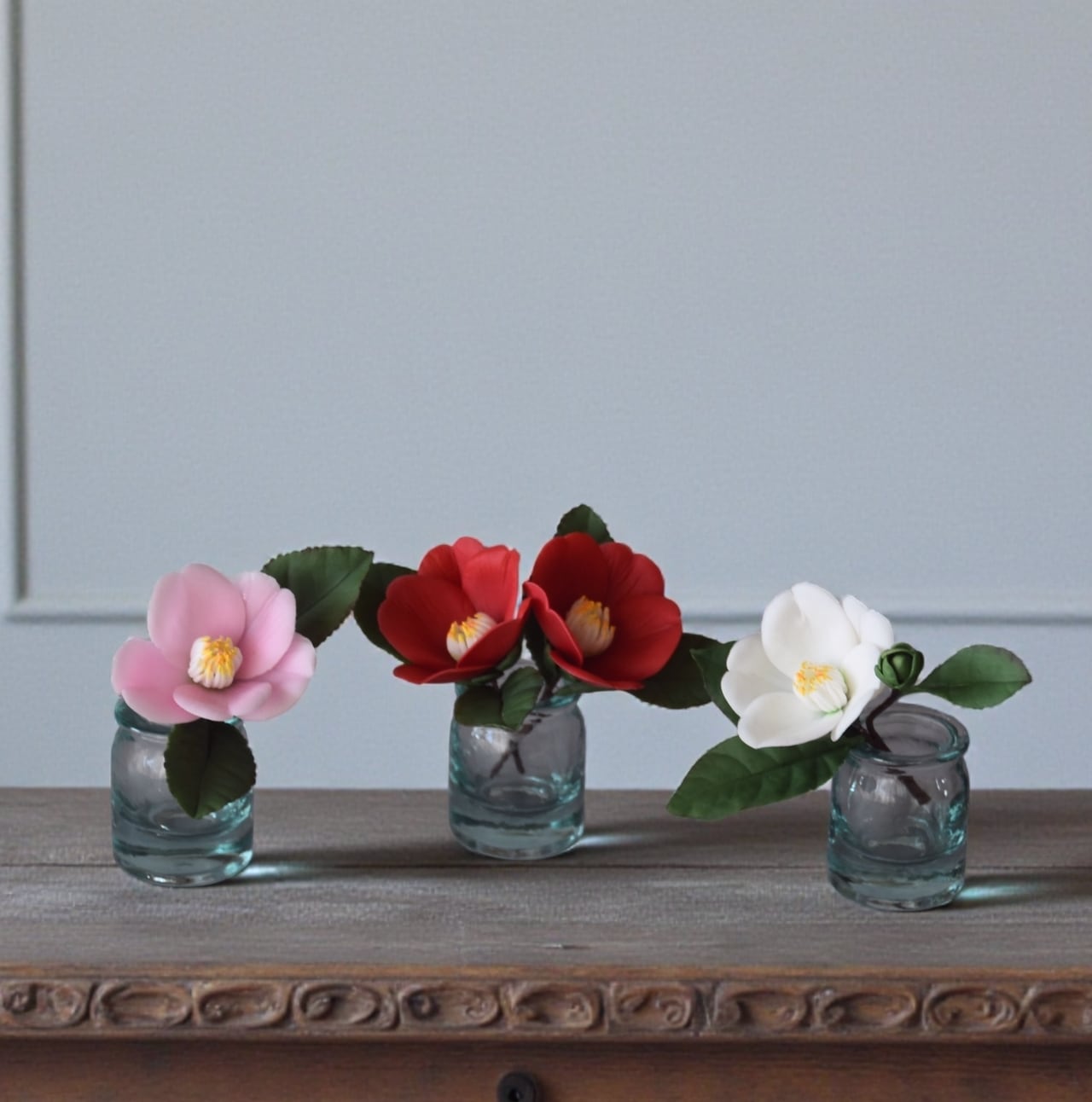 粘土で椿をつくり、小さな花瓶に生けました。