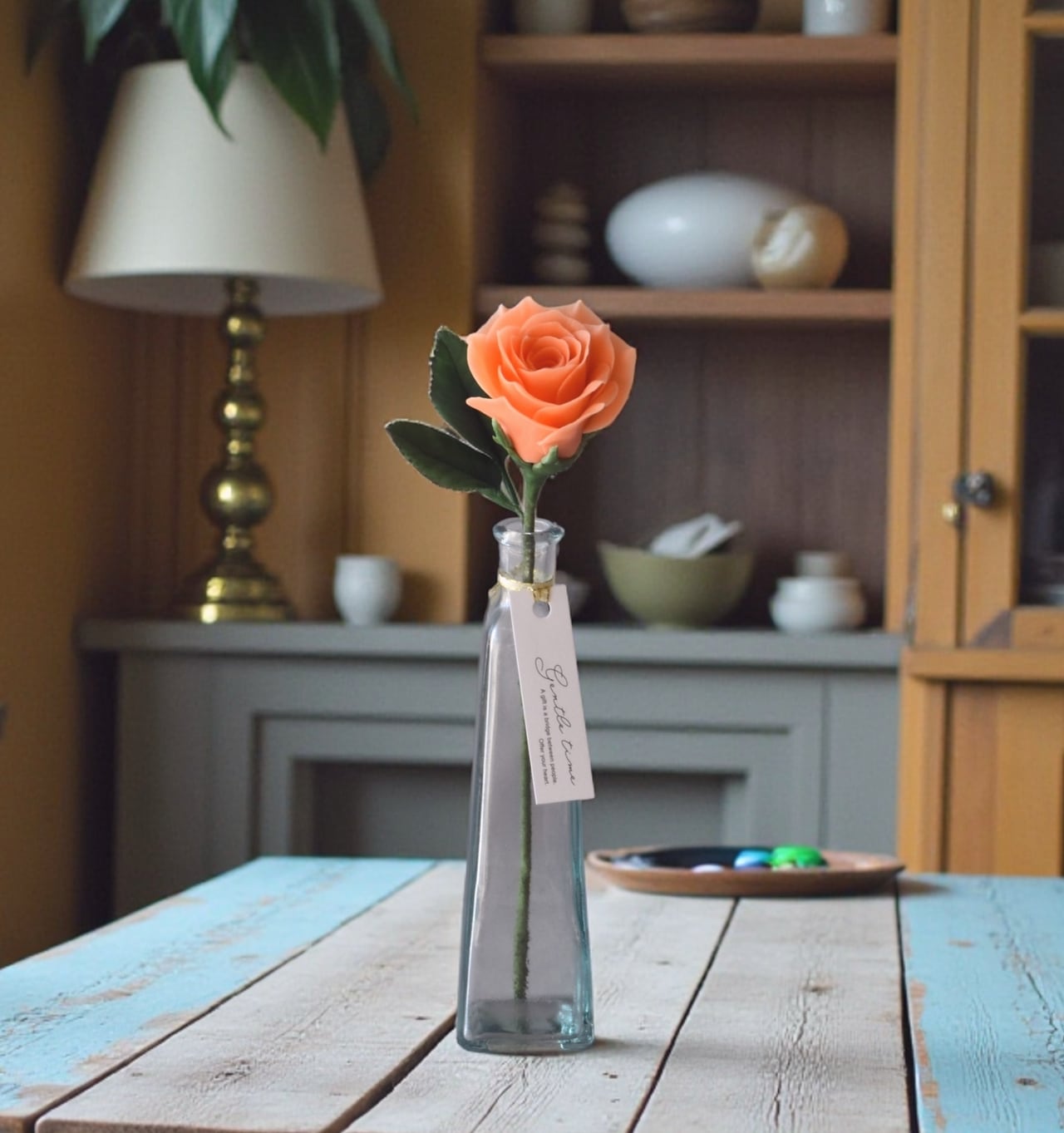 粘土で薔薇を制作し、シンプルな花瓶に飾りました。