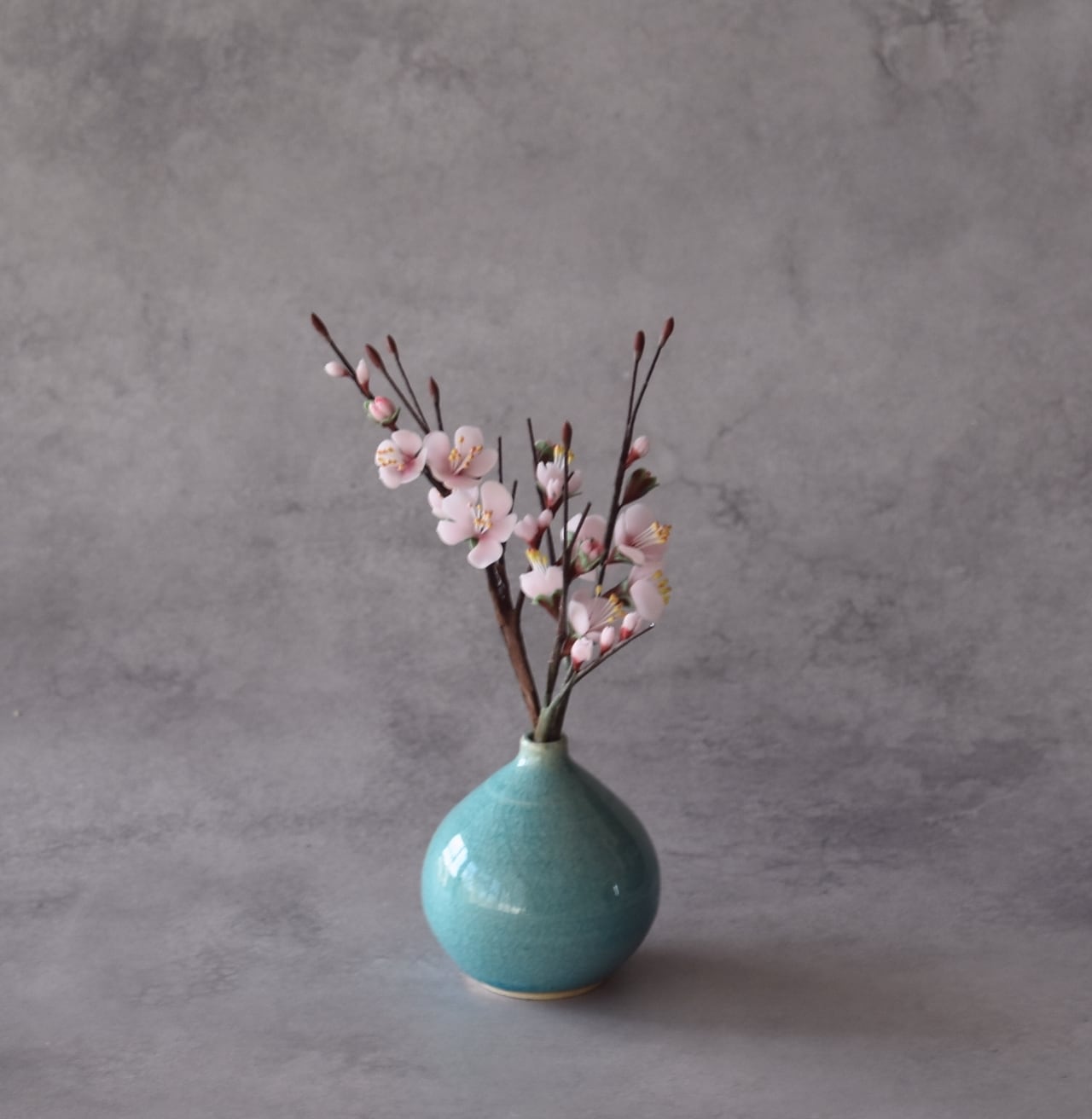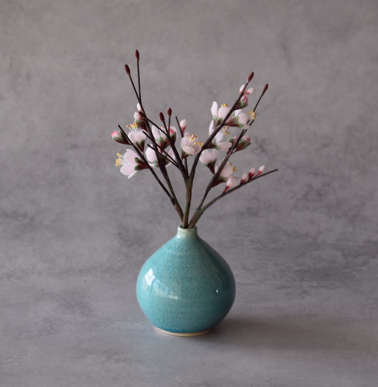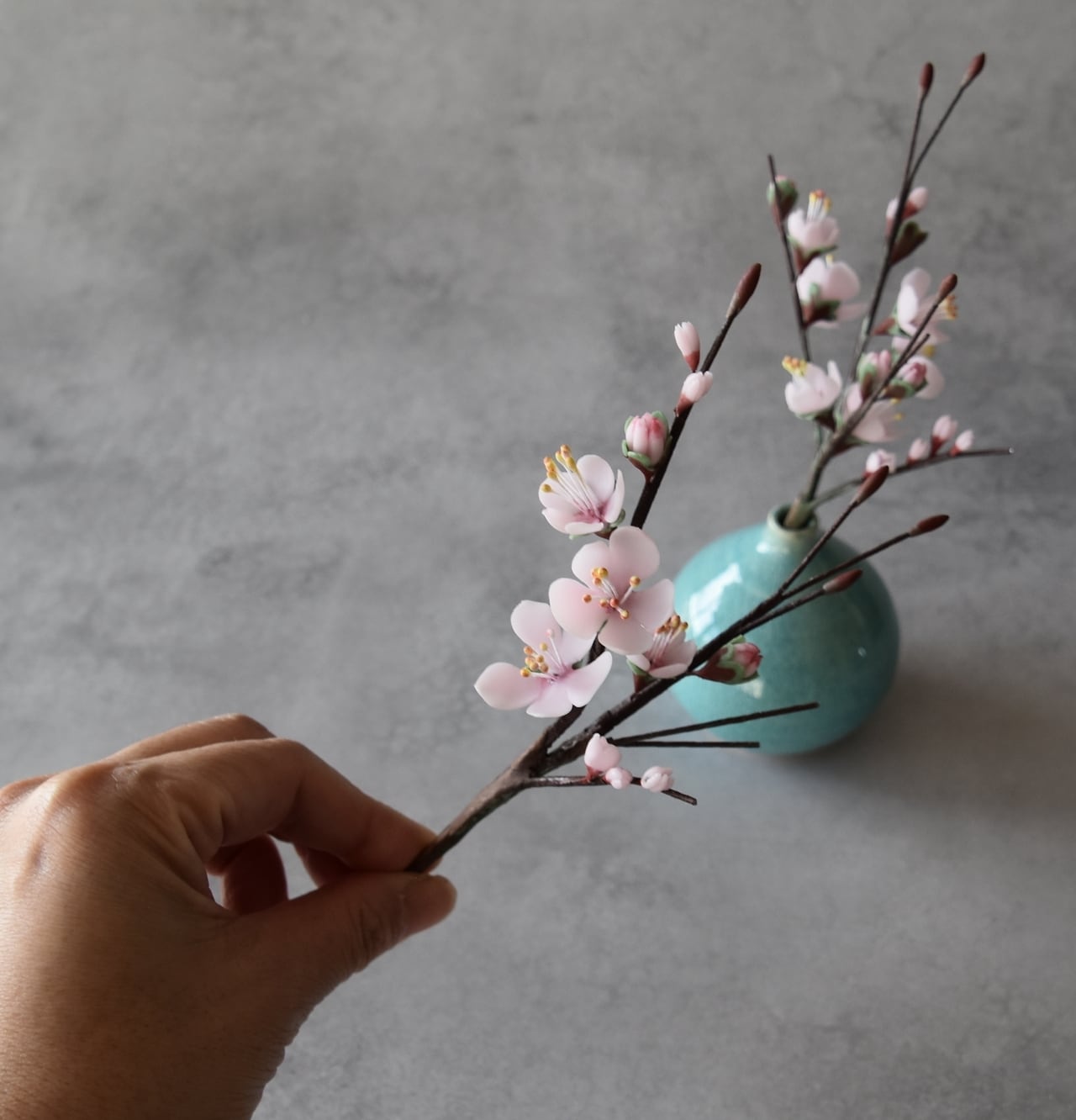 粘土で梅を制作し、小さな一輪挿しの花瓶に生けました。