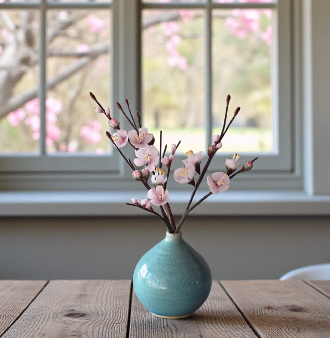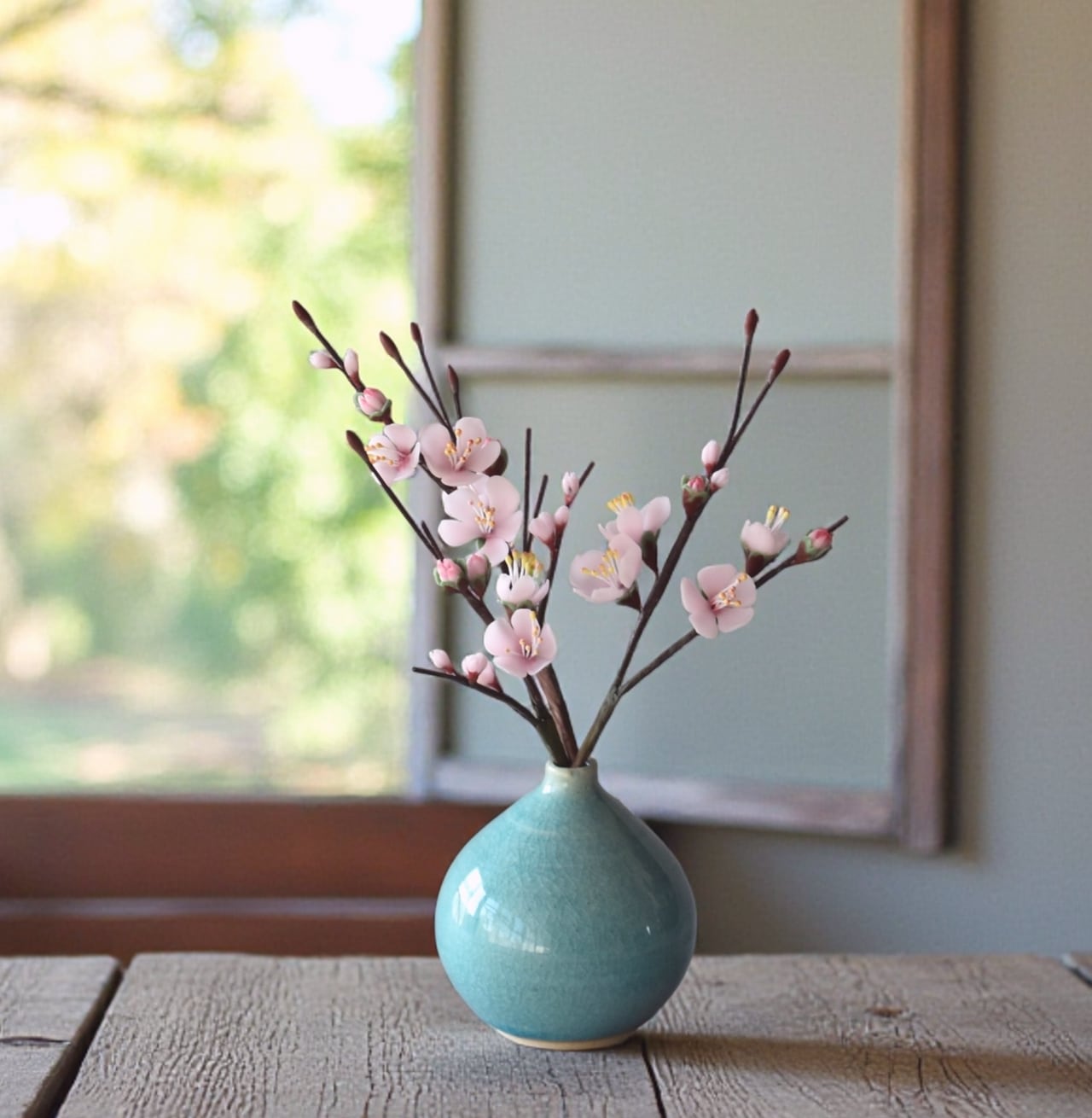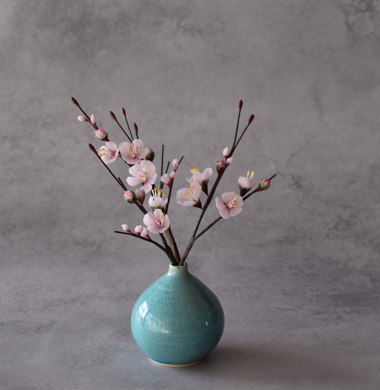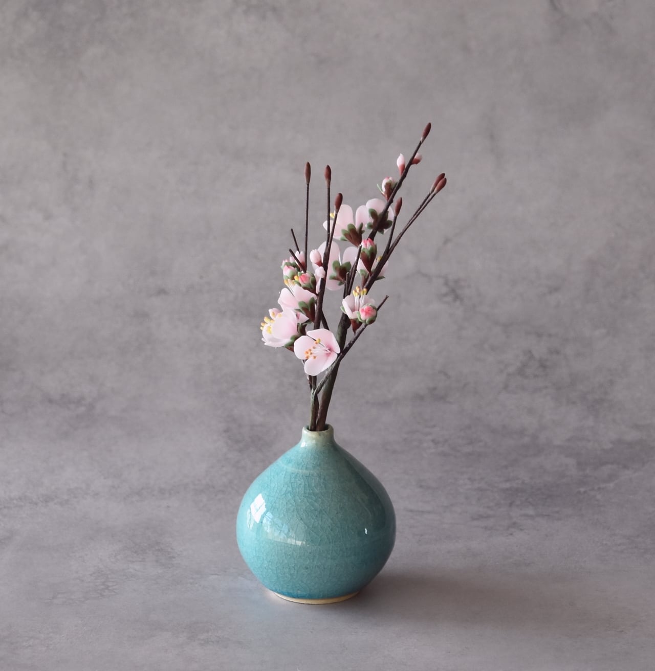粘土で梅を制作し、小さな一輪挿しの花瓶に生けました。