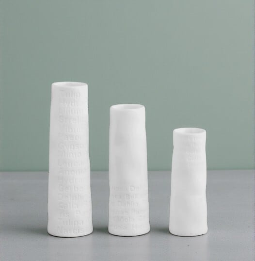 白磁が美しい花瓶の側面にはアルファベットの文字があしらわれており、