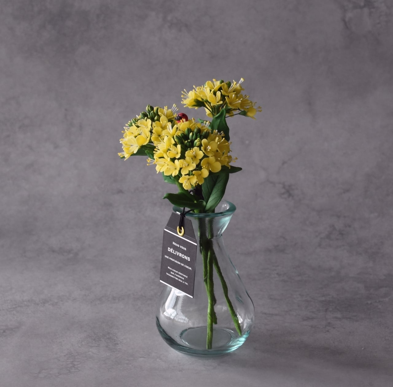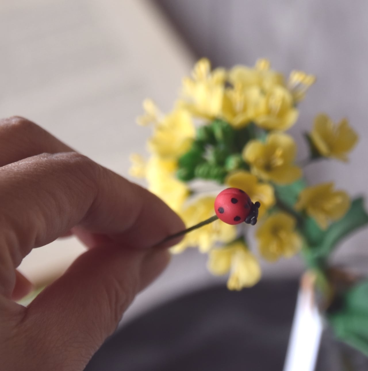 粘土で菜の花とてんとう虫をつくり、シンプルな花瓶に生けました。