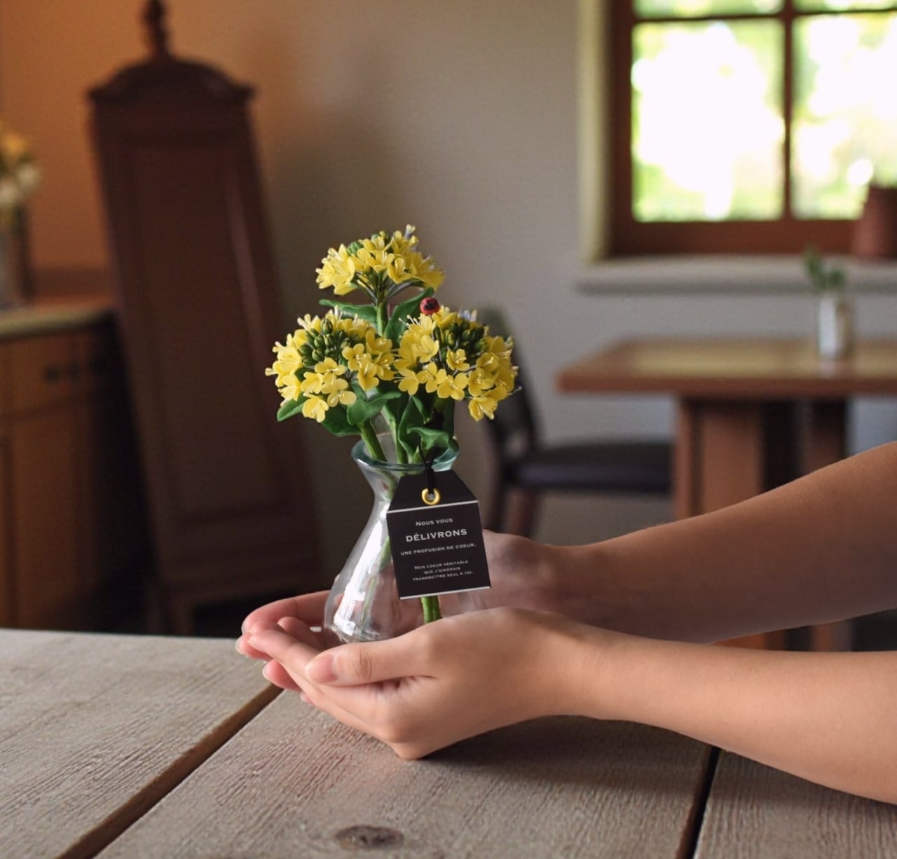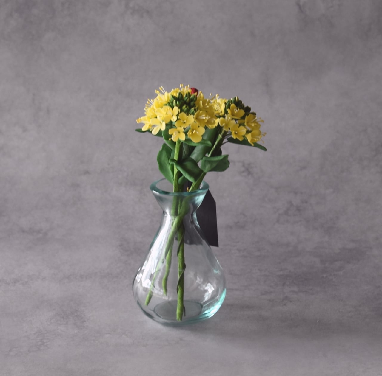 シンプルなガラス製のフラワーボトルが、小さな菜の花の可憐さをより引き立ててくれます。