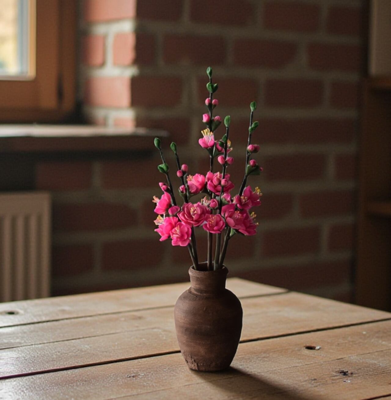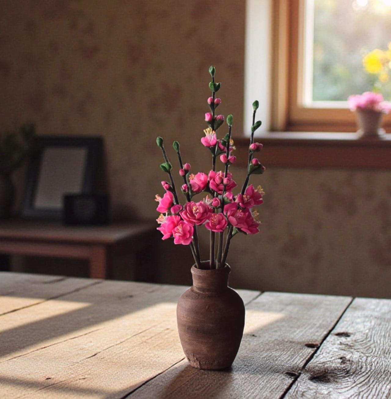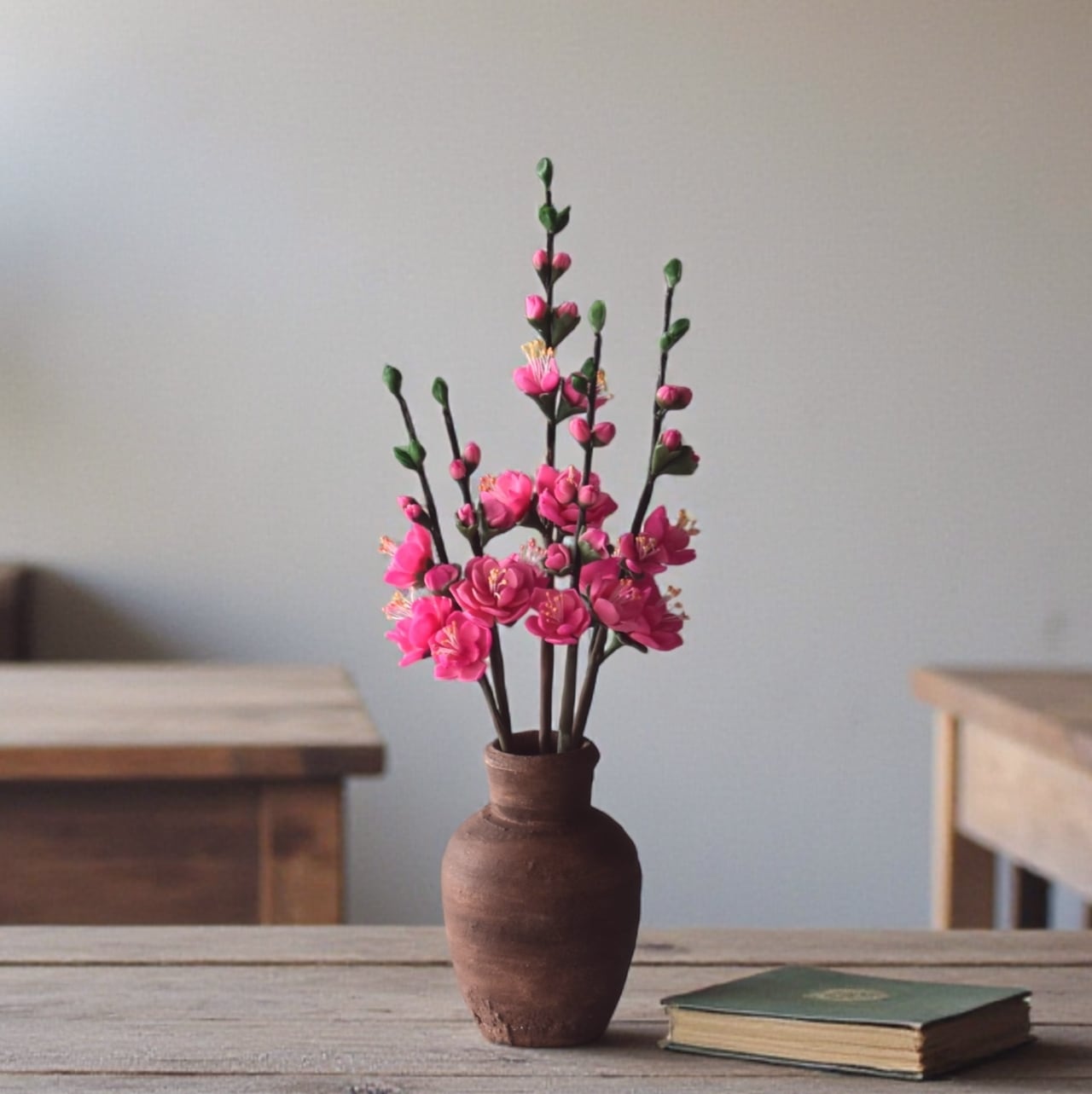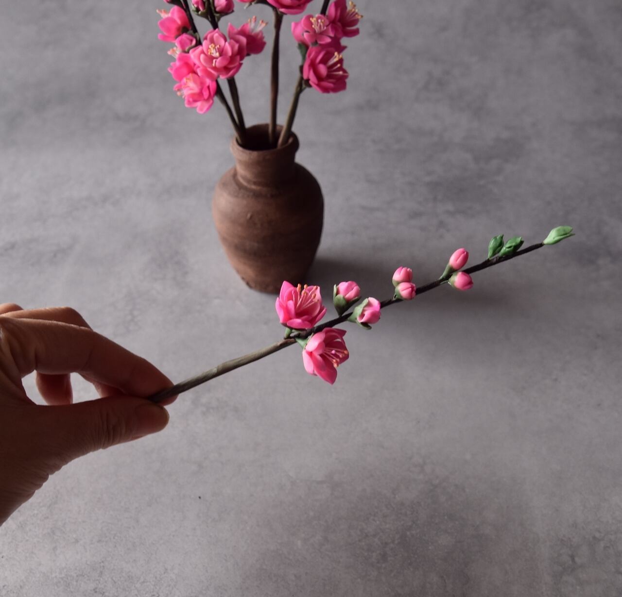 粘土で桃の花をつくり、小さな壺に生けました。