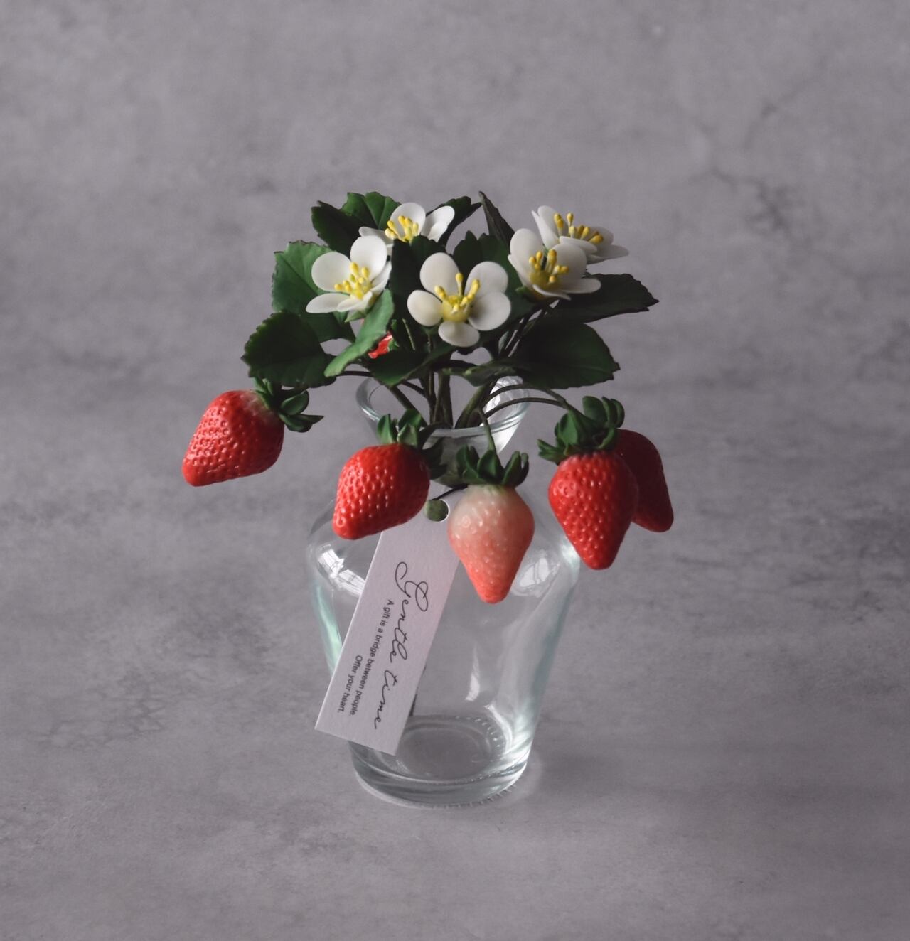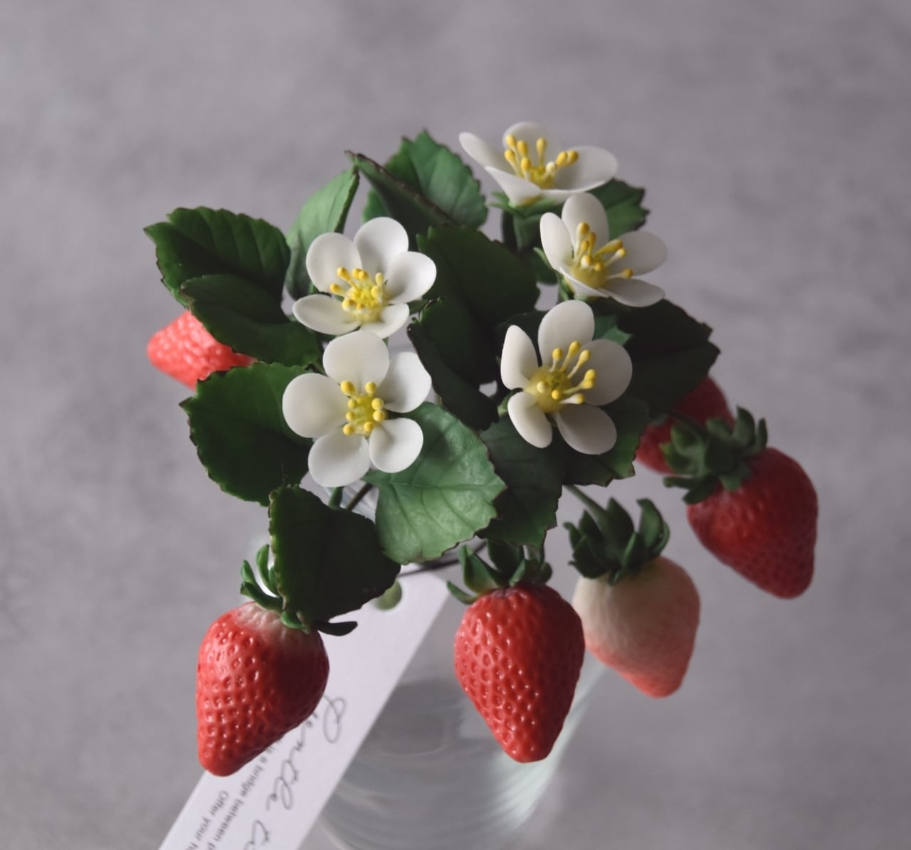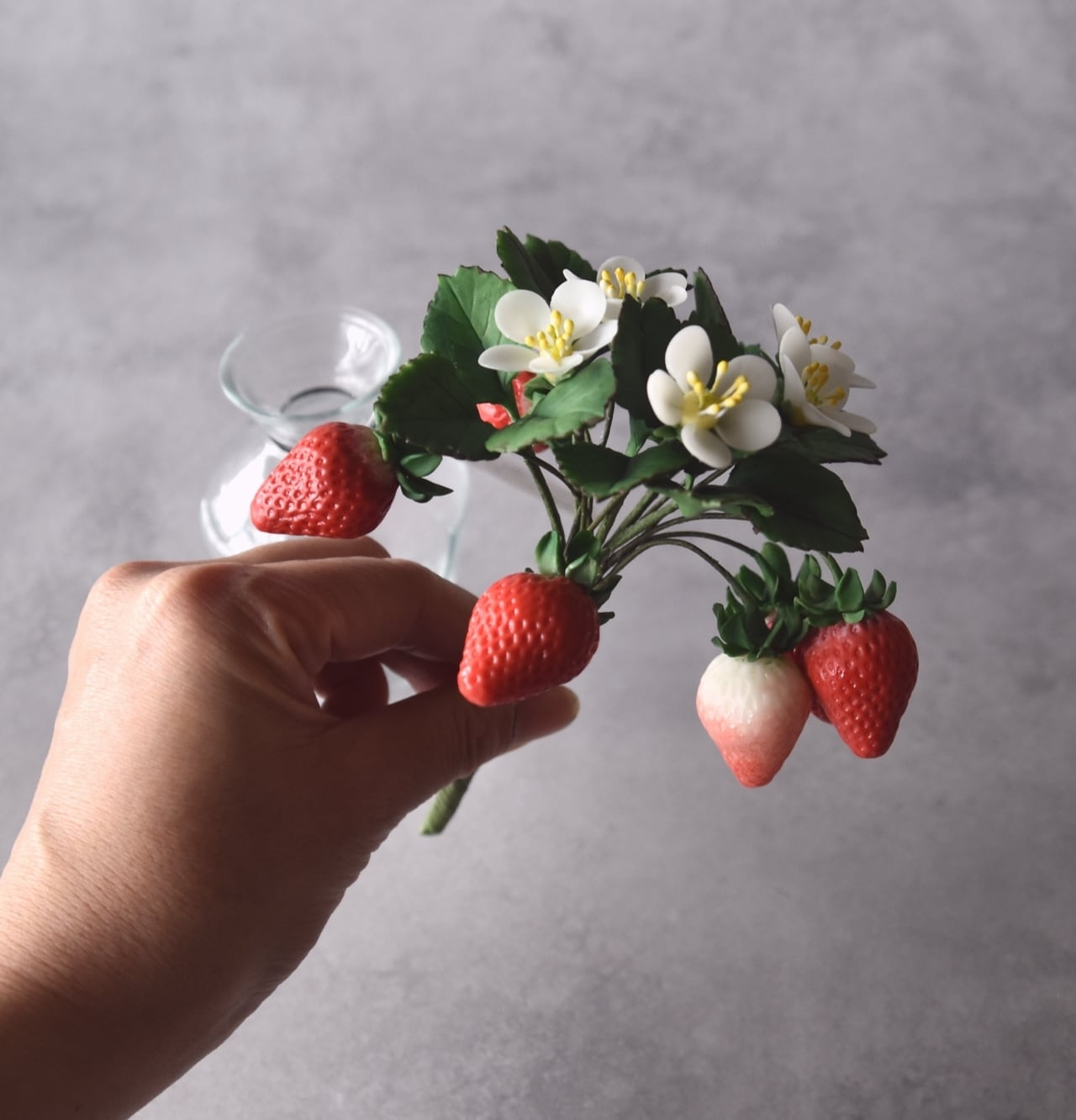 イチゴは美味しそうに見える真っ赤なイチゴをたくさん作りました。少し青いイチゴも入っています。イチゴのサイズは少し小ぶりです。小さな白い苺の花は粘土を薄く伸ばして、一枚一枚丁寧に花びらを制作しています。