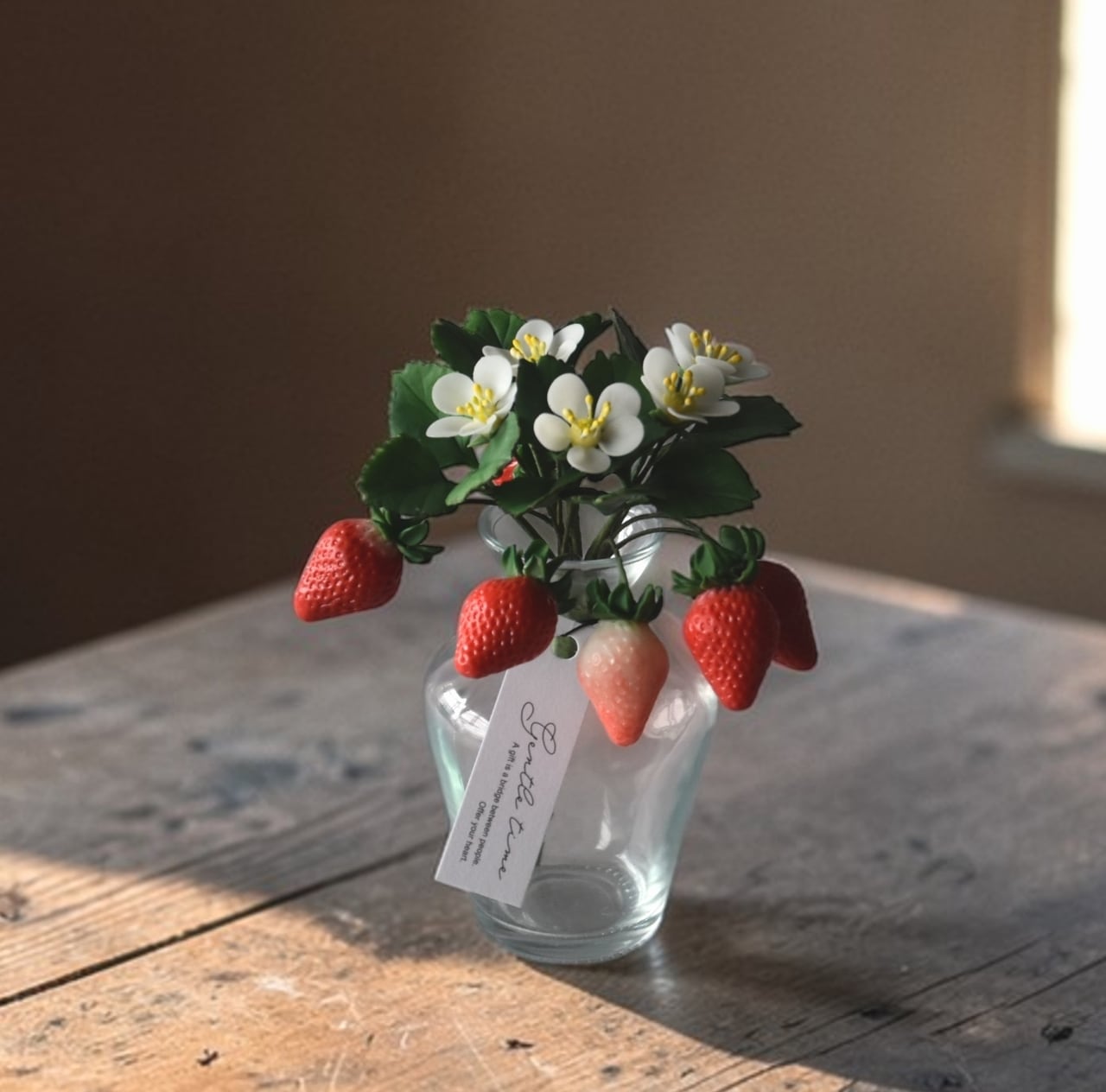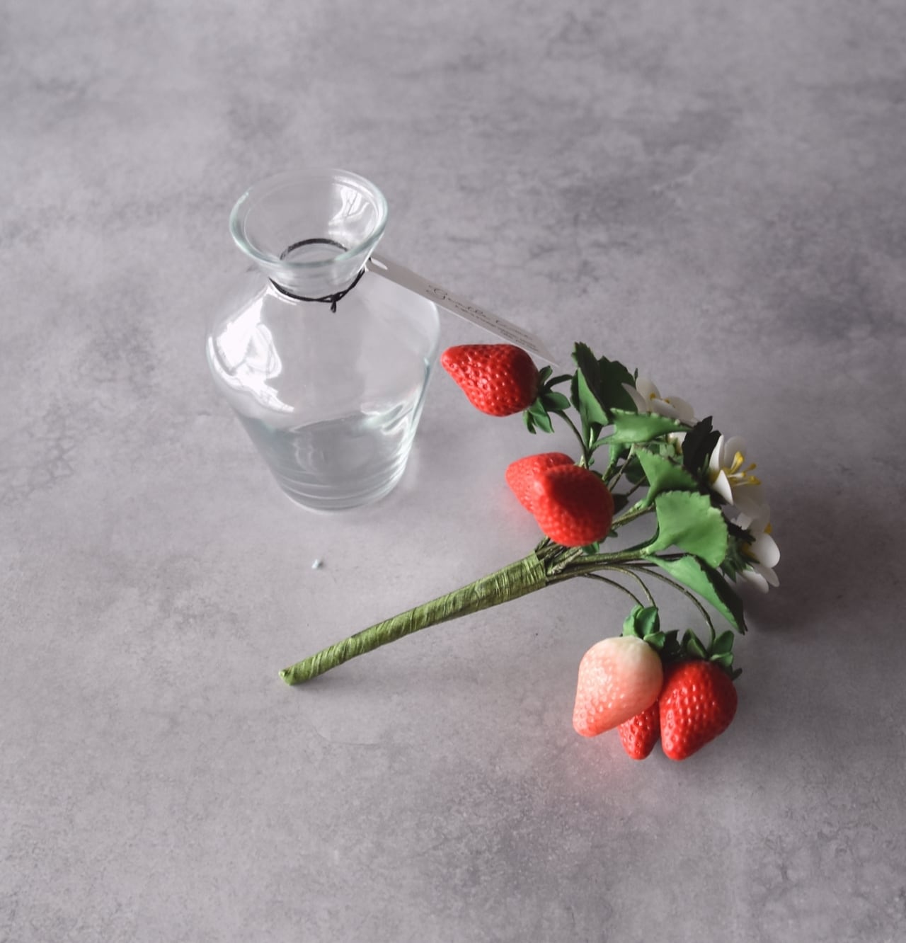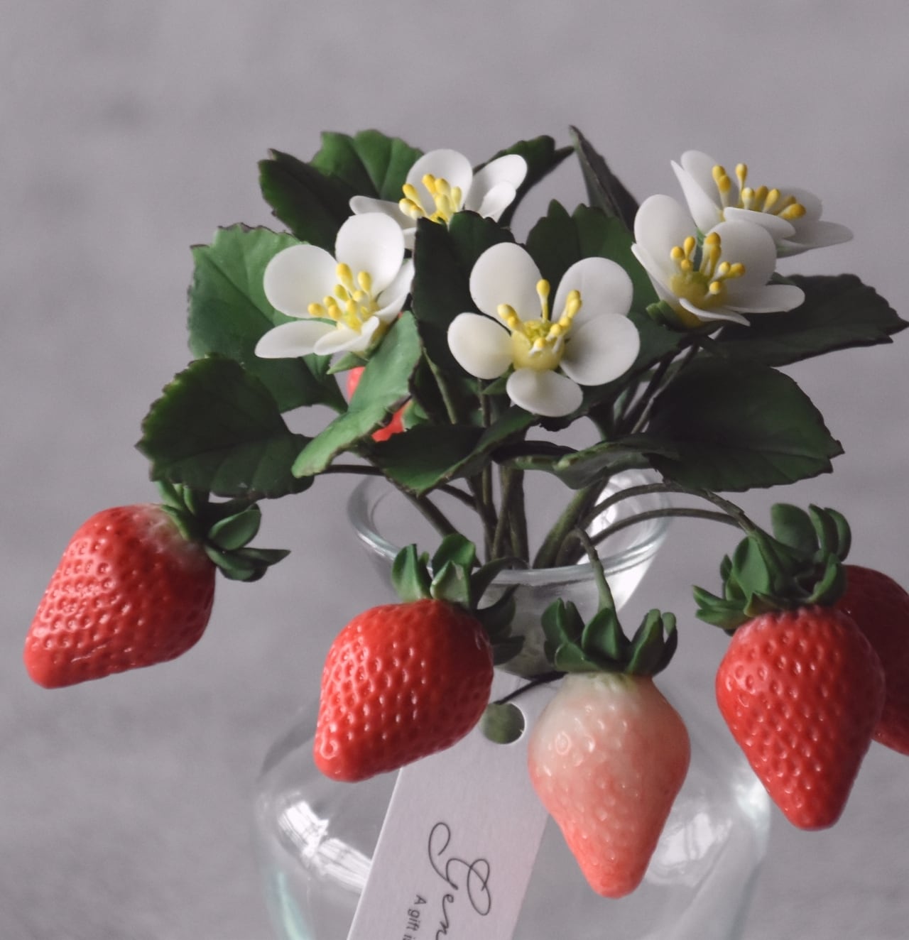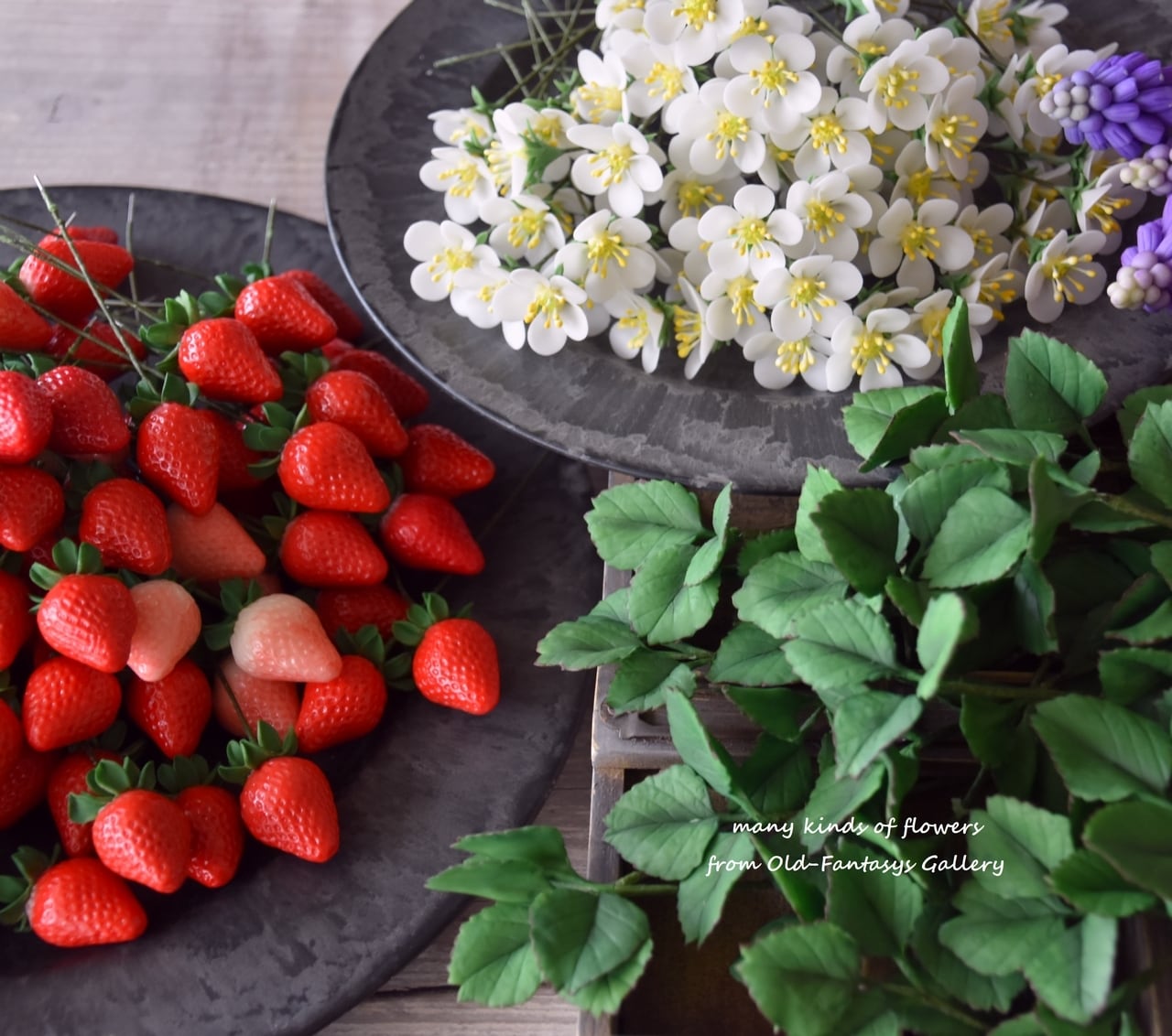 イチゴは美味しそうに見える真っ赤なイチゴをたくさん作りました。少し青いイチゴも入っています。イチゴのサイズは少し小ぶりです。小さな白い苺の花は粘土を薄く伸ばして、一枚一枚丁寧に花びらを制作しています。