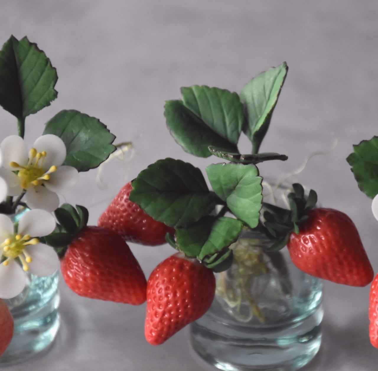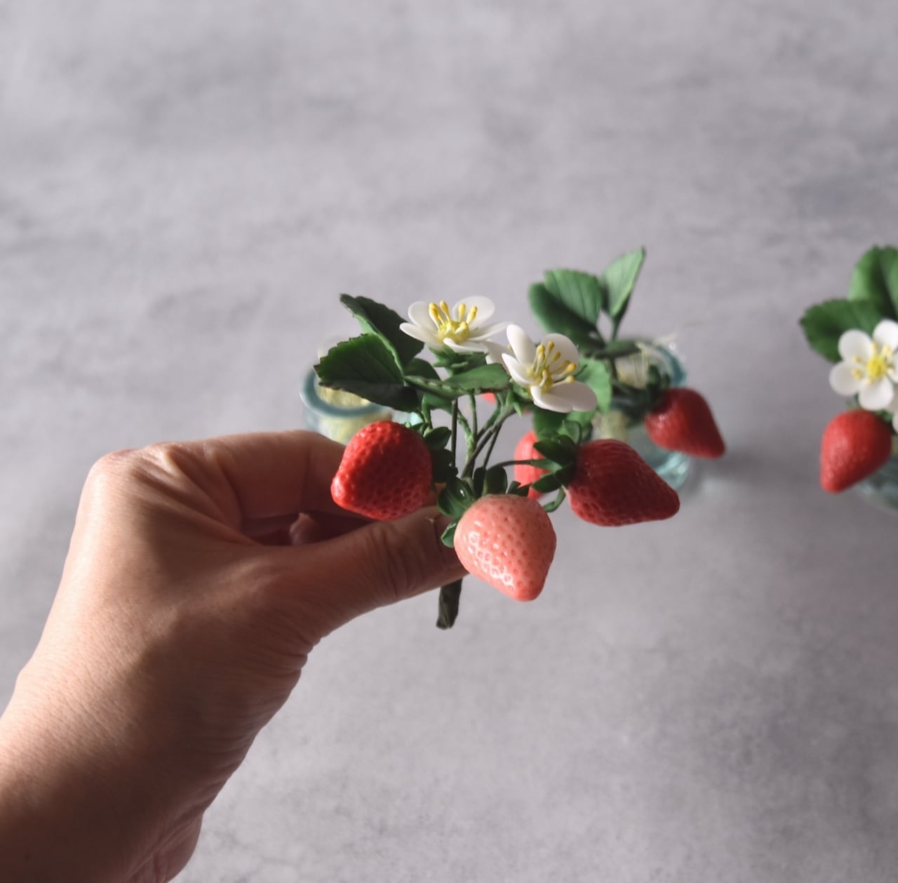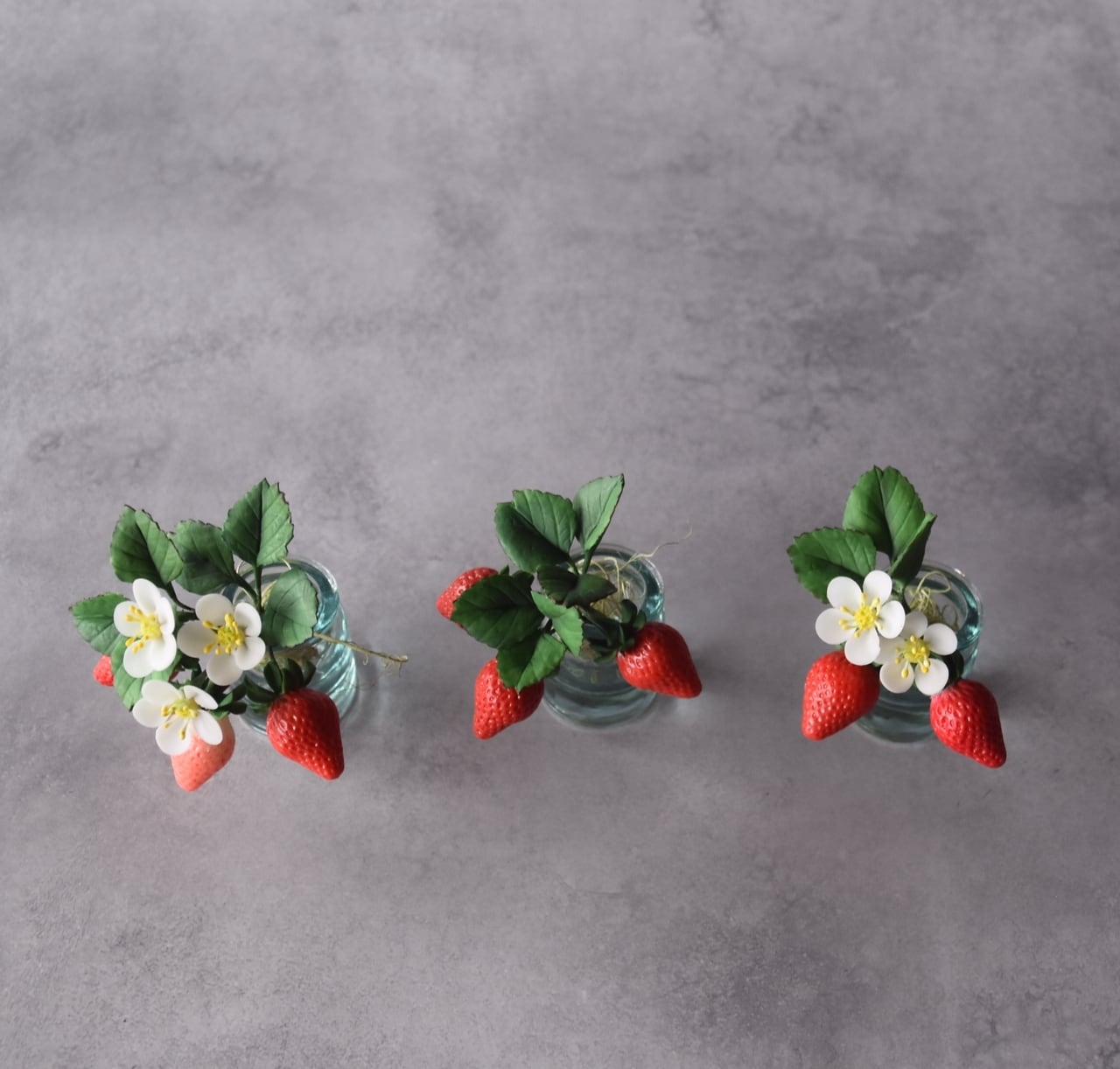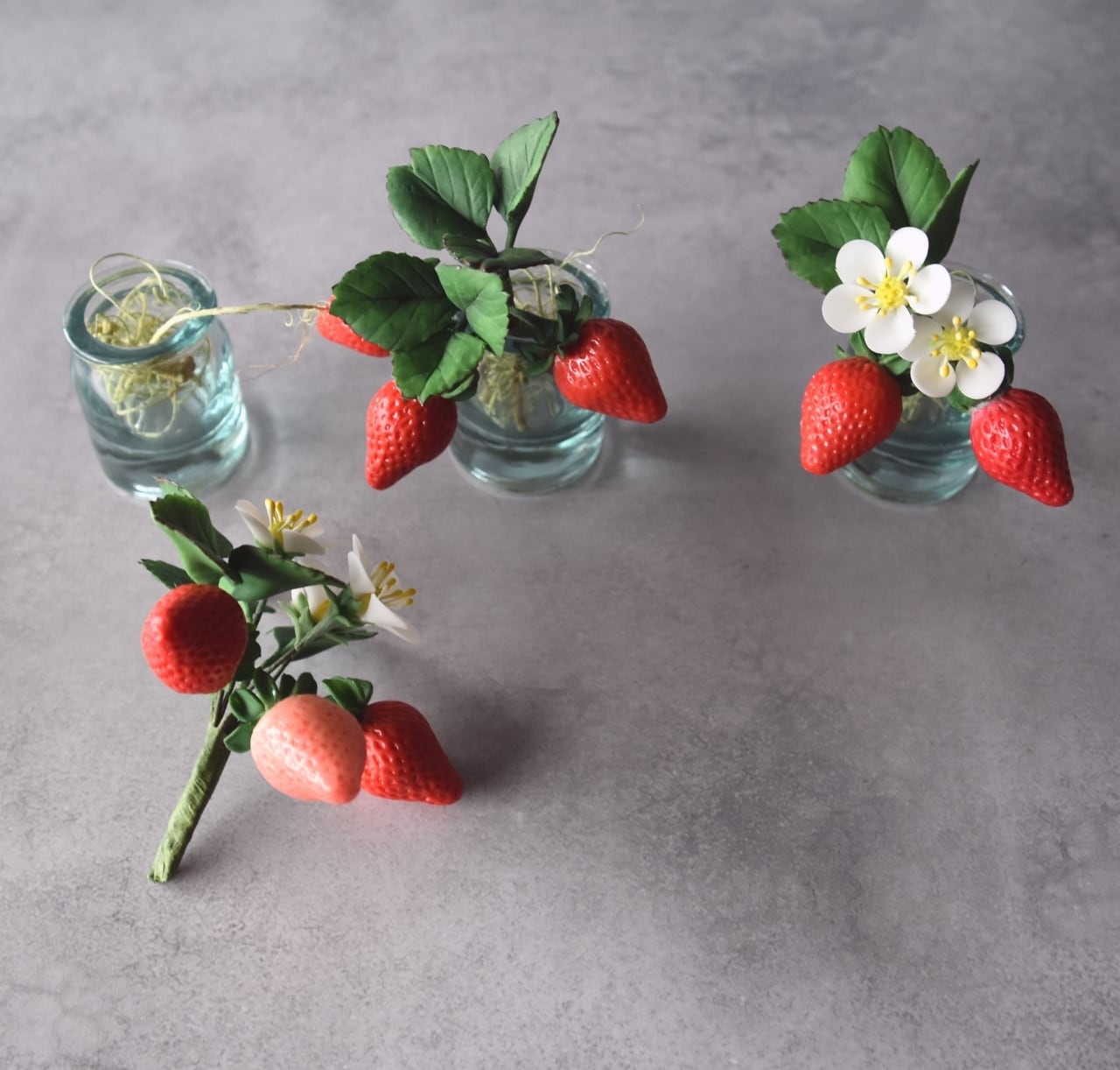 イチゴは美味しそうに見える真っ赤なイチゴをたくさん作りました。少し青いイチゴも入っています。小さな白い苺の花は粘土を薄く伸ばして、一枚一枚丁寧に花びらを制作しています。