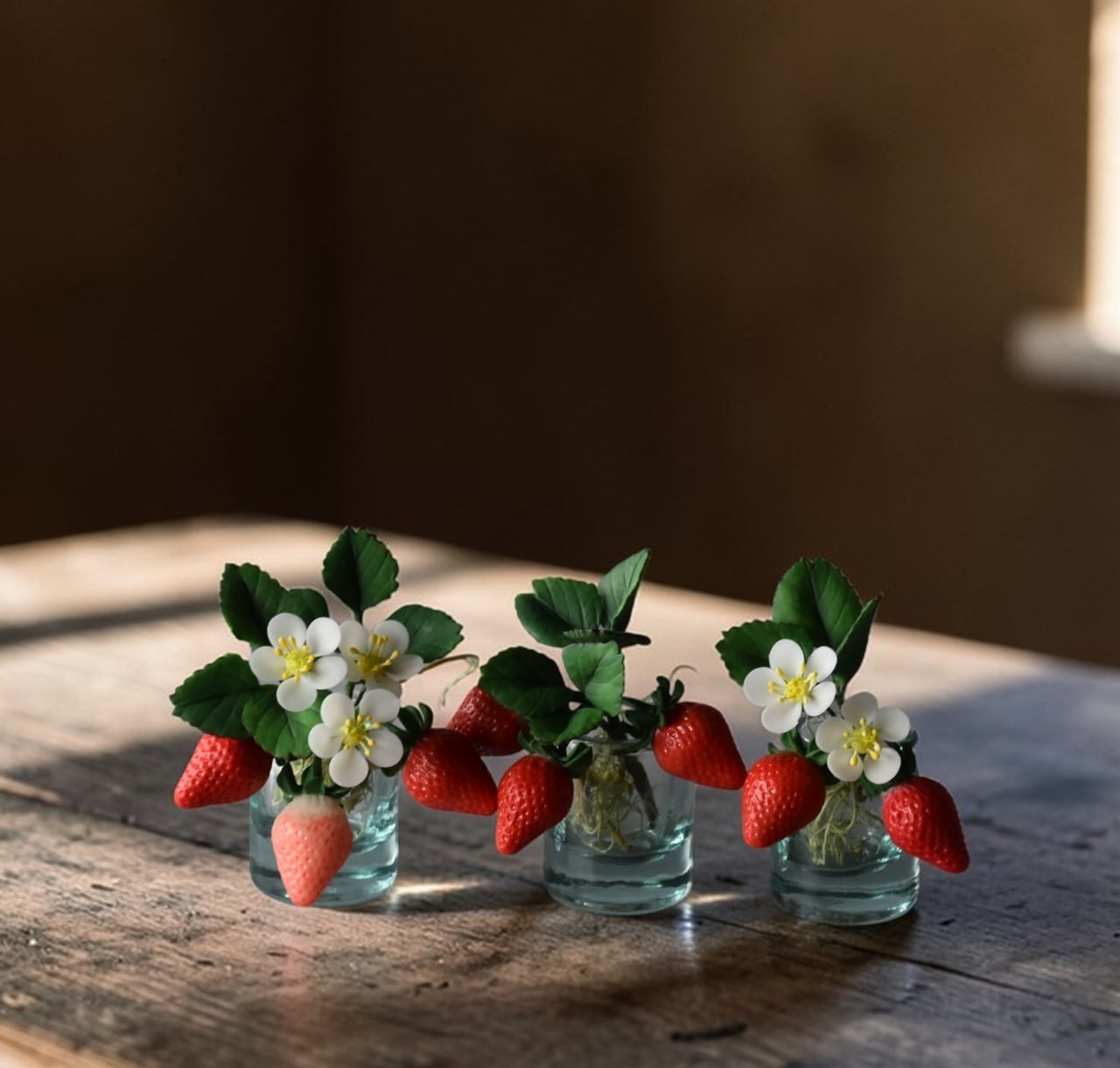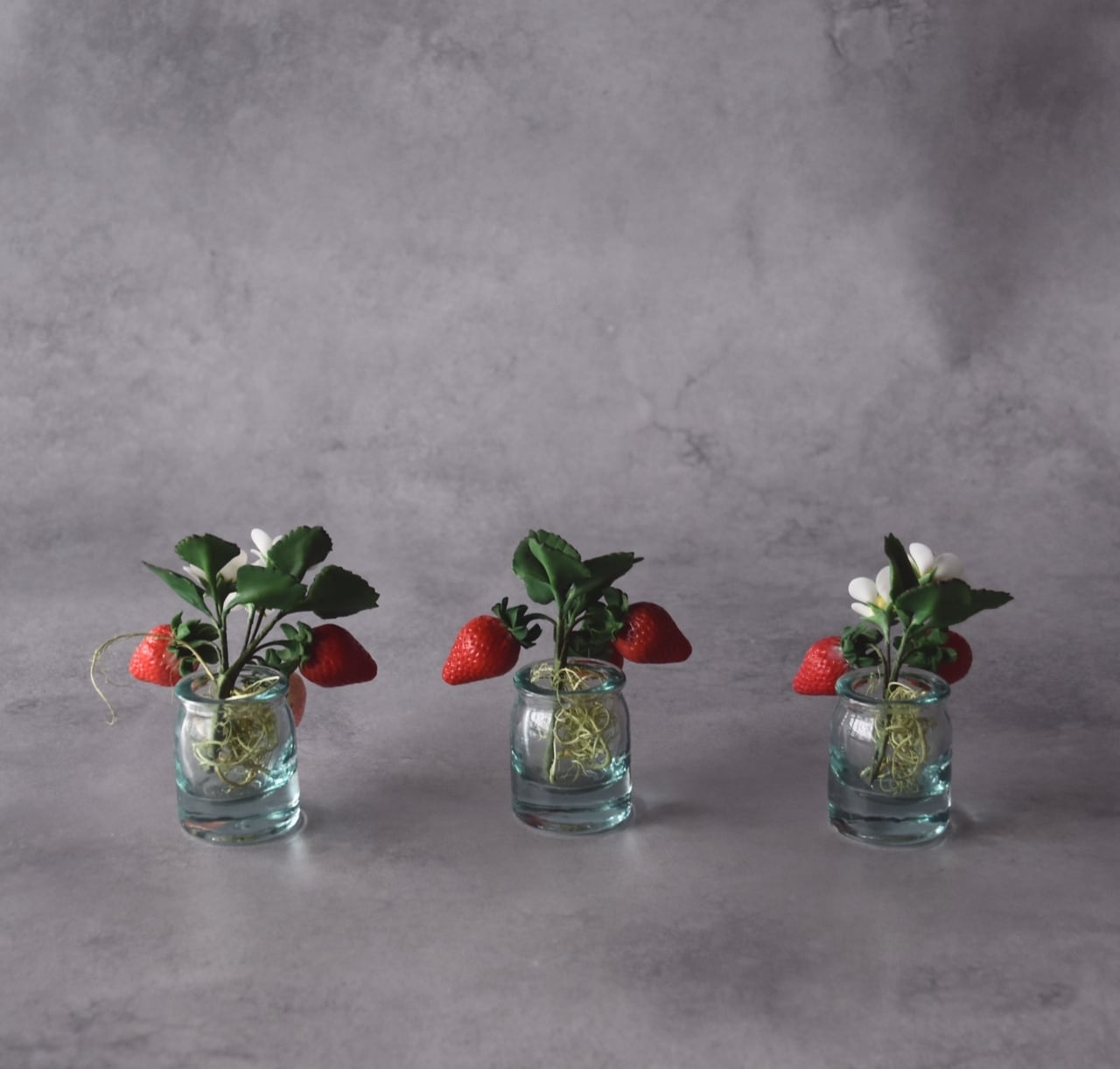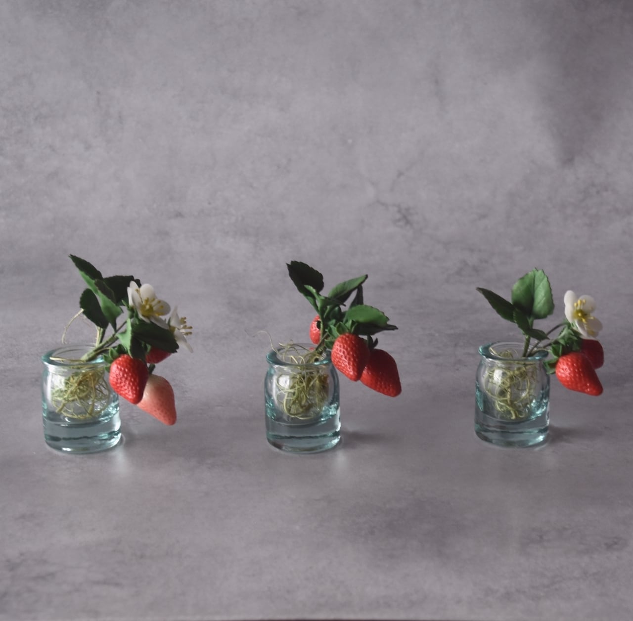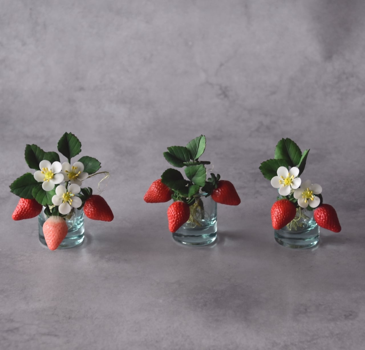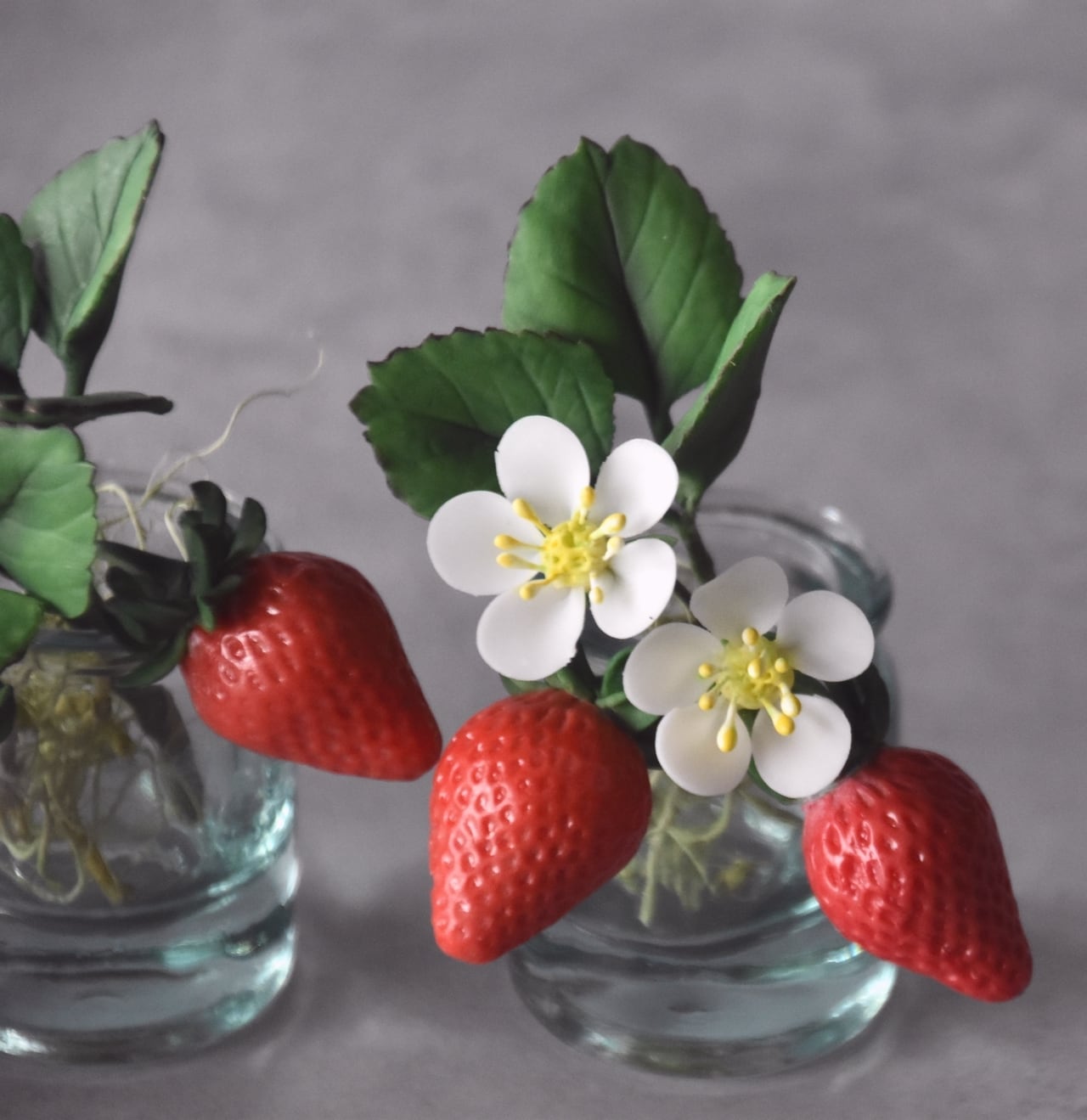 イチゴは美味しそうに見える真っ赤なイチゴをたくさん作りました。少し青いイチゴも入っています。小さな白い苺の花は粘土を薄く伸ばして、一枚一枚丁寧に花びらを制作しています。