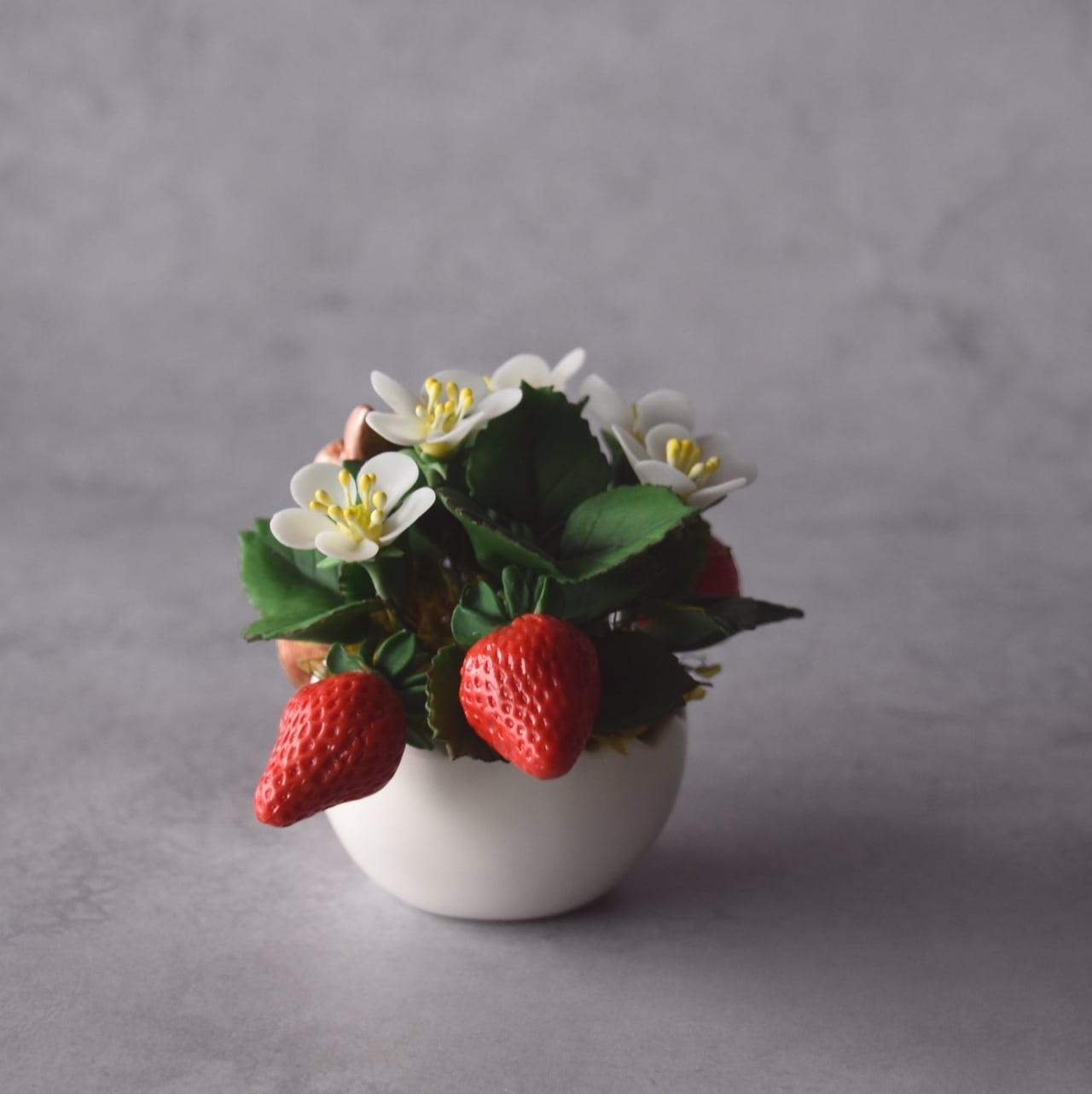 まだ熟していない少し青い苺も添え、より自然な表情を表現しています。苺の花も粘土を薄く伸ばし、花びら一枚一枚を丁寧に仕上げています。