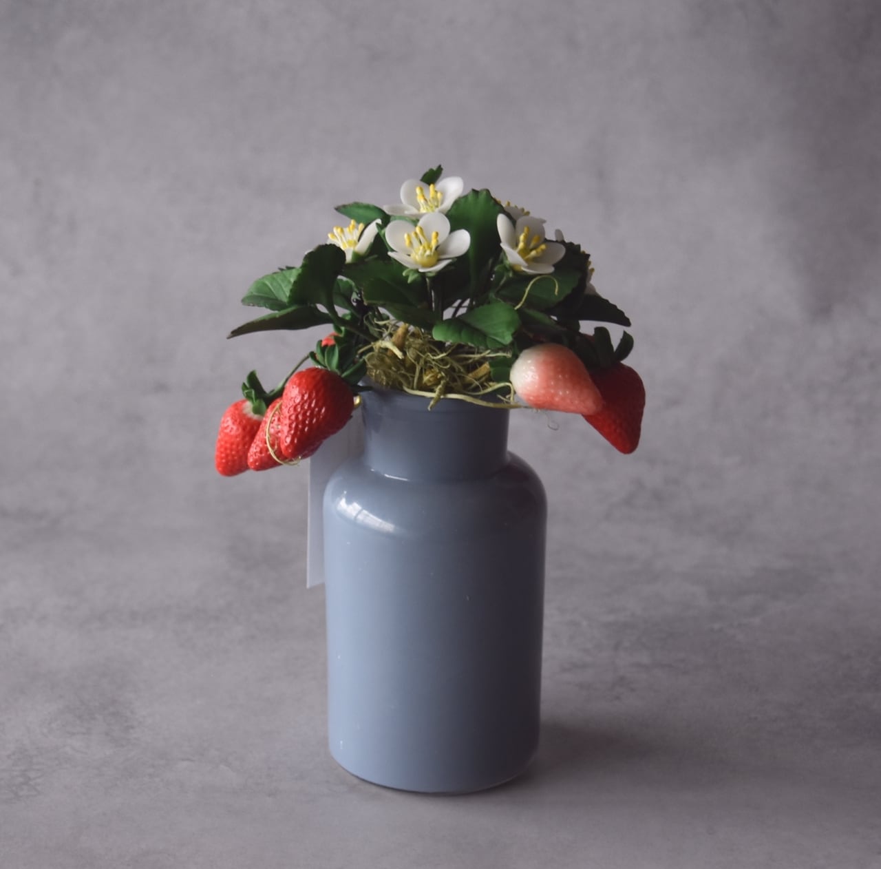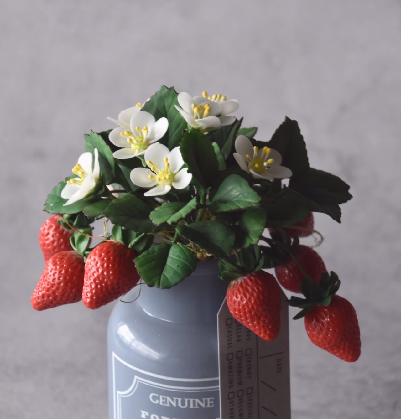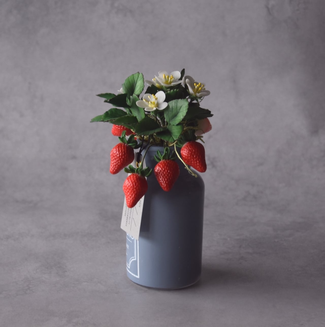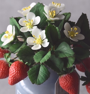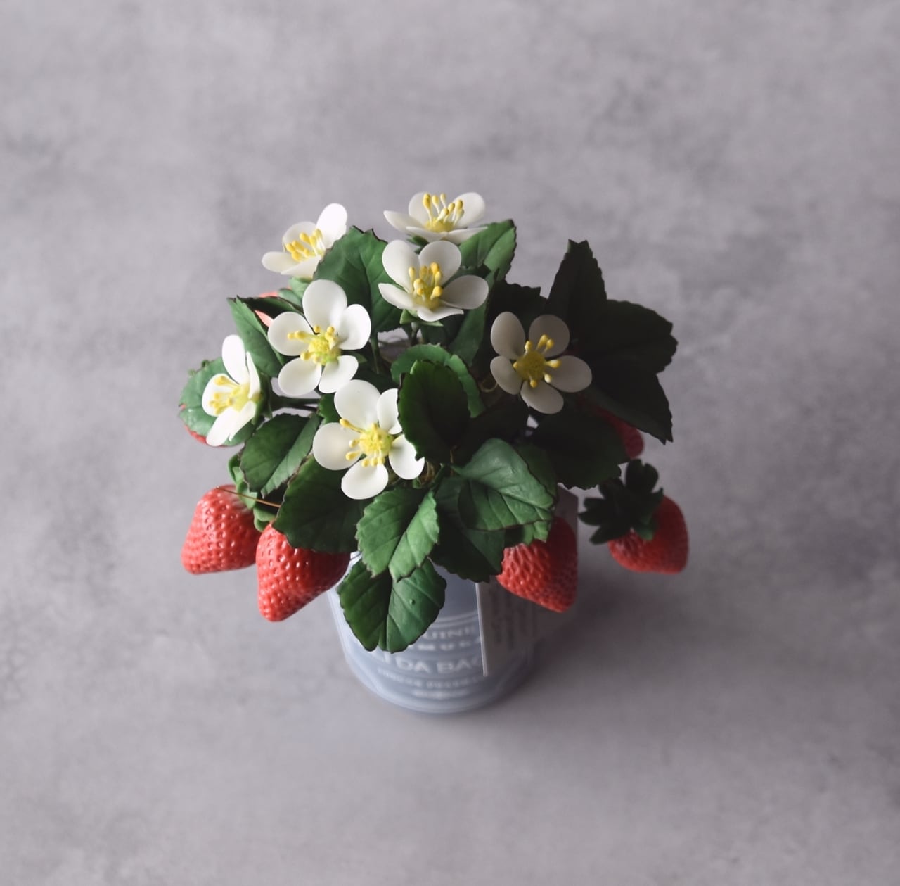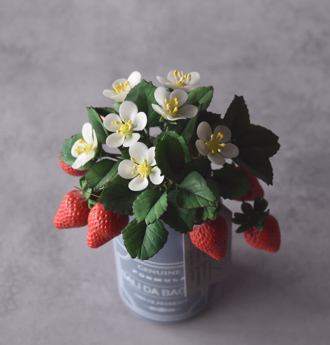 まだ熟していない少し青い実も添え、より自然な表情を表現しています。苺の花も粘土を薄く伸ばし、花びら一枚一枚を丁寧に仕上げています。