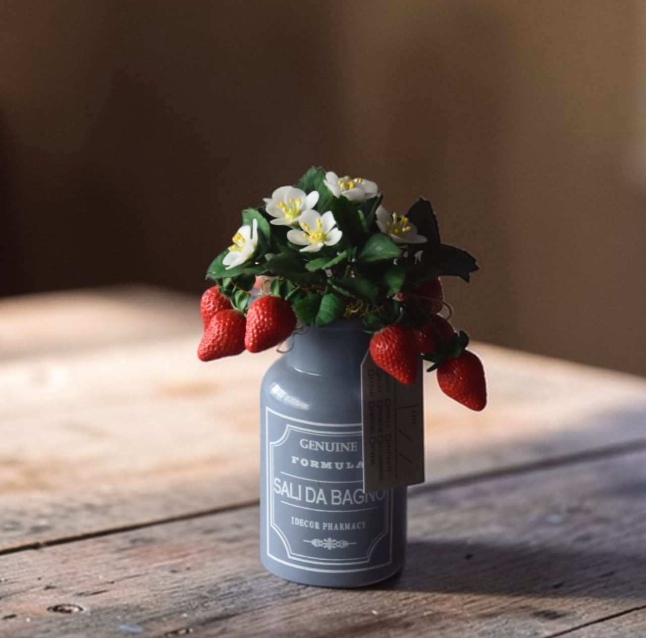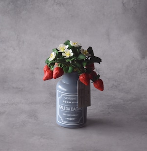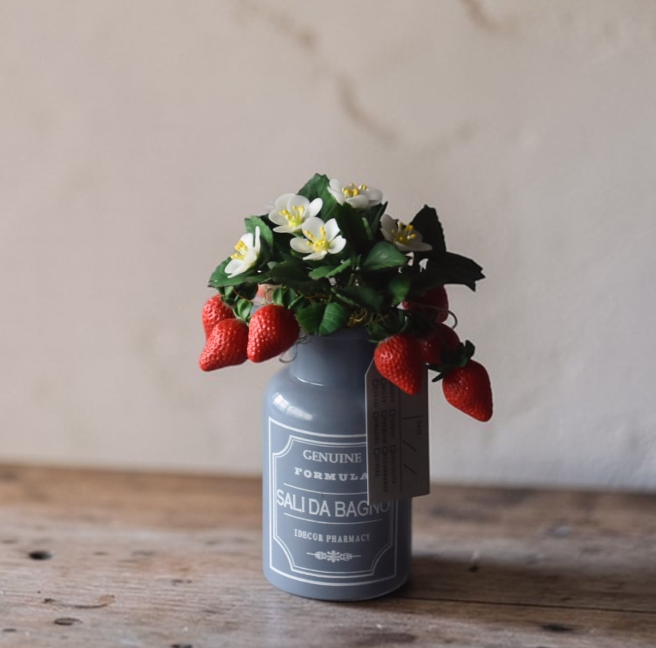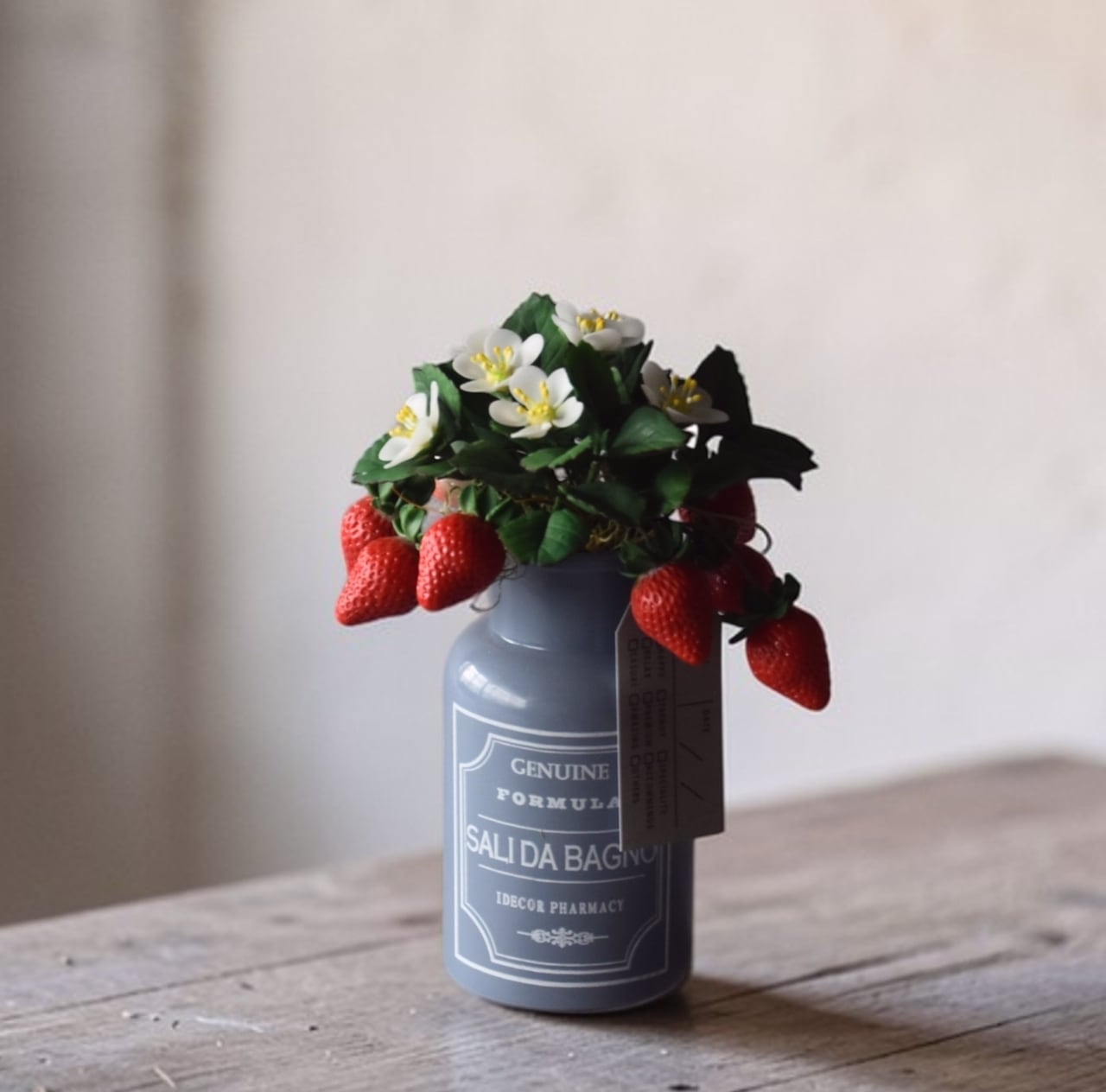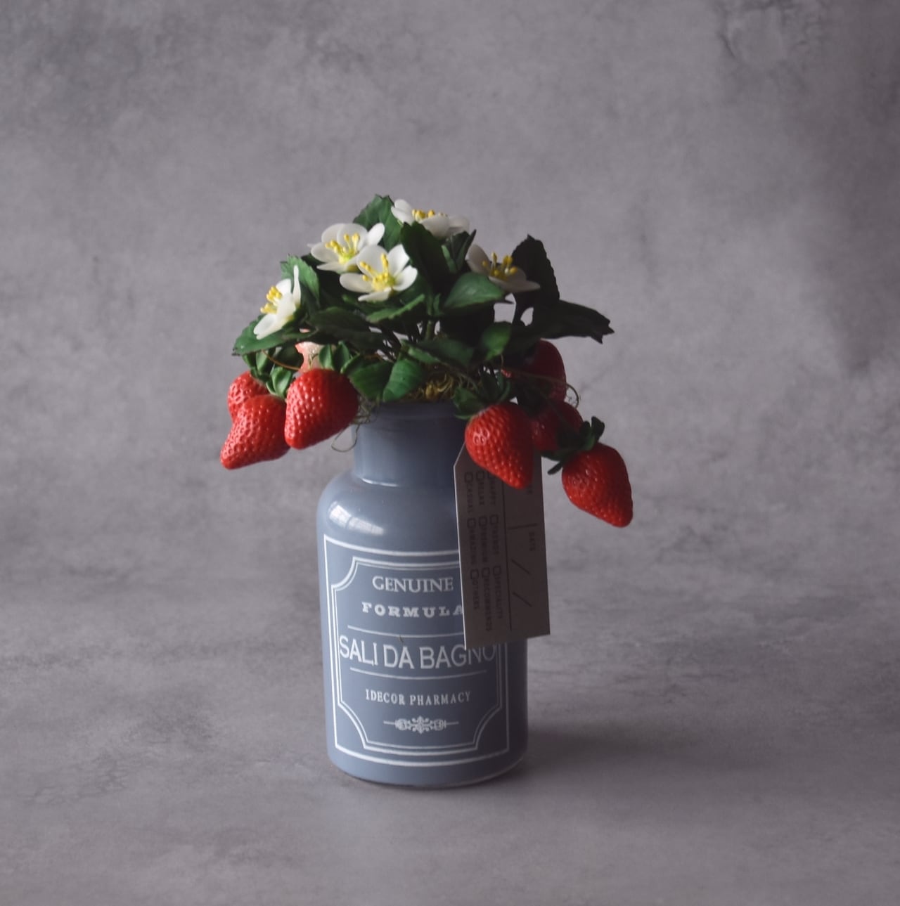 ◆粘土のお花◆苺のクレイフラワー 鉢植え|ボトルポットのアンティーク風インテリア|Ⅰ1409