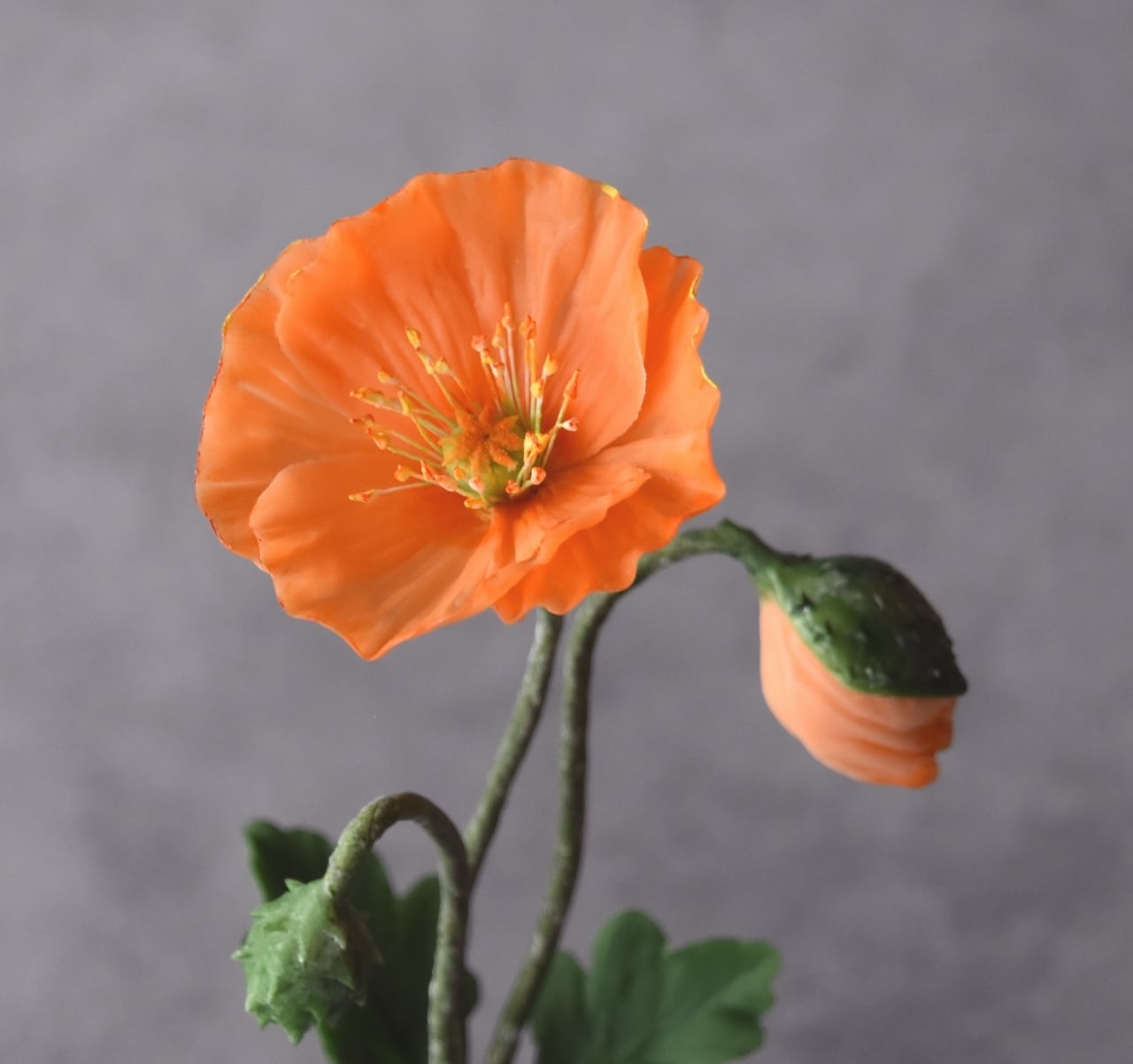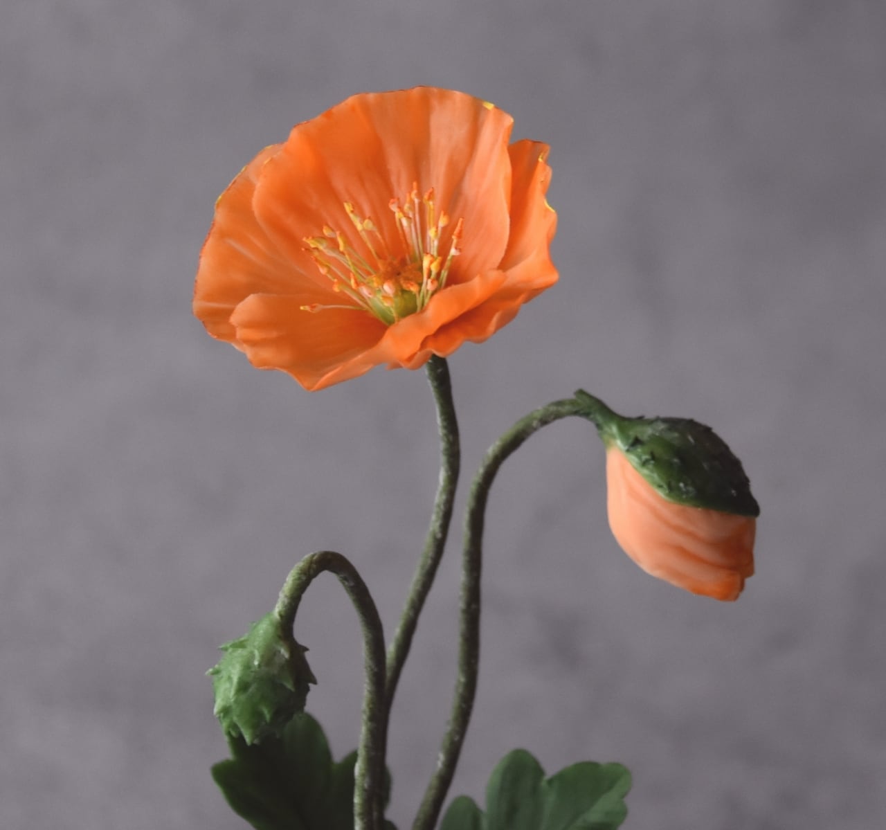 ポピーの柔らかく繊細な花びらを表現するために、粘土を薄く丁寧に伸ばし、フリルをたっぷりとあしらっています。