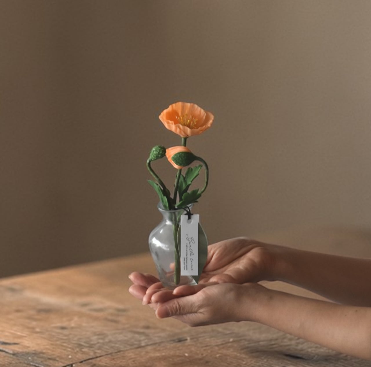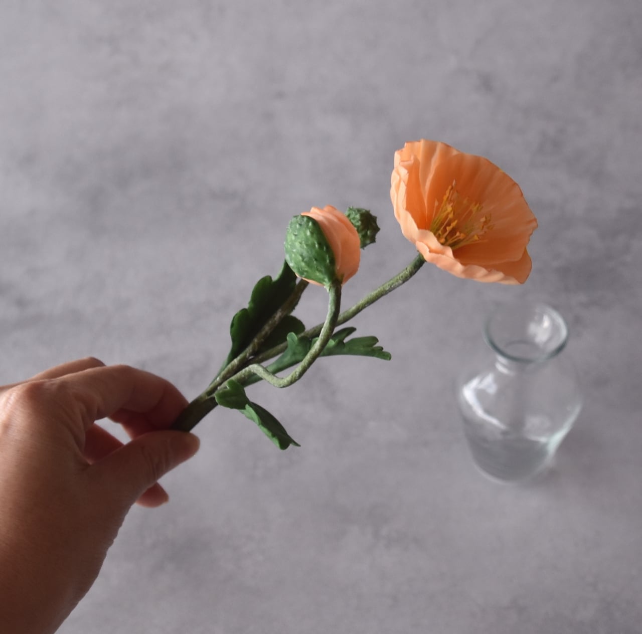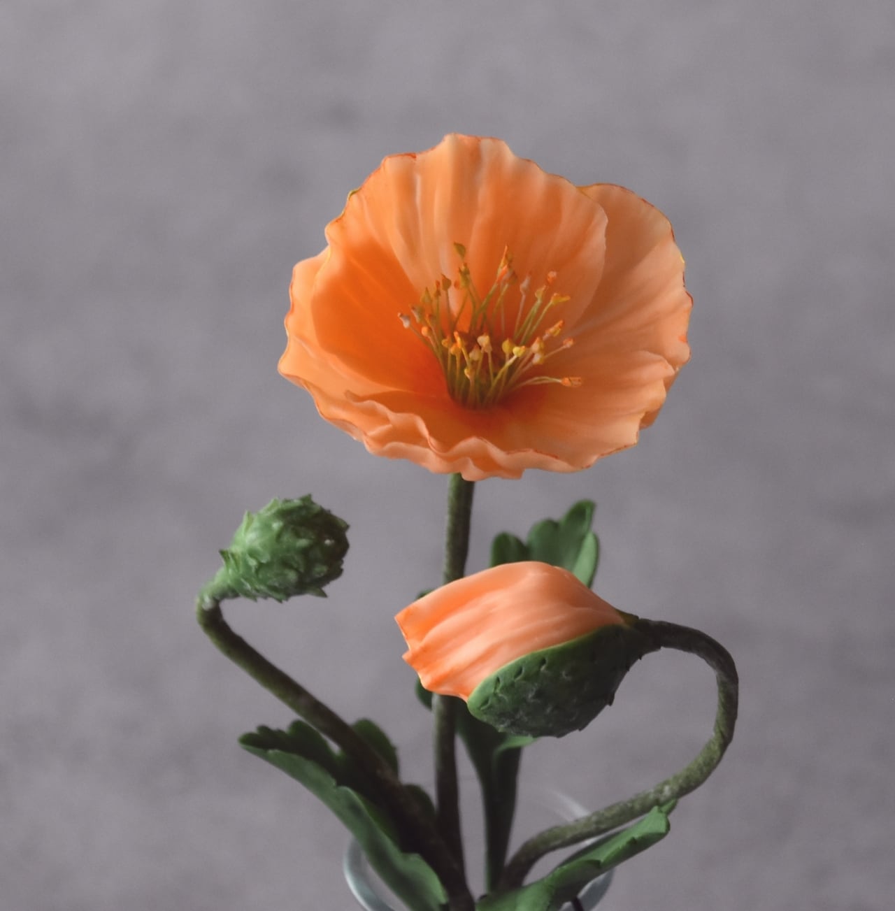 ポピーの柔らかく繊細な花びらを表現するために、粘土を薄く丁寧に伸ばし、フリルをたっぷりとあしらっています。