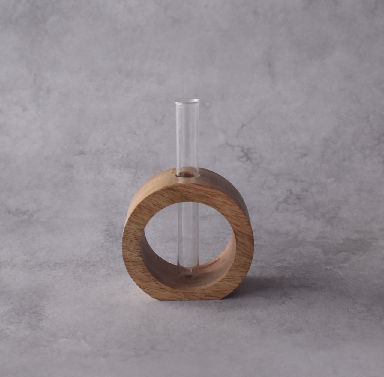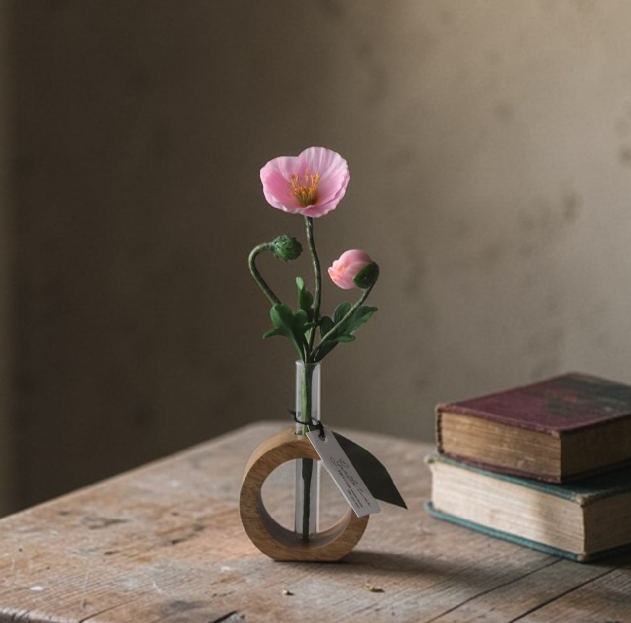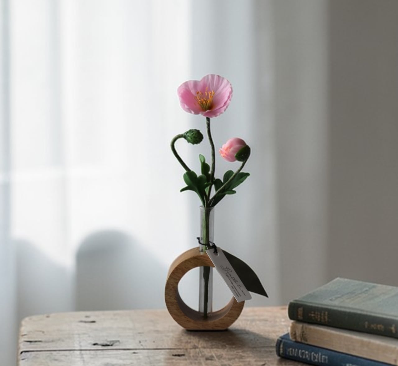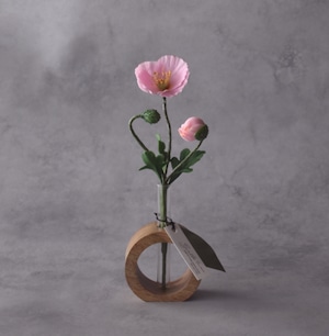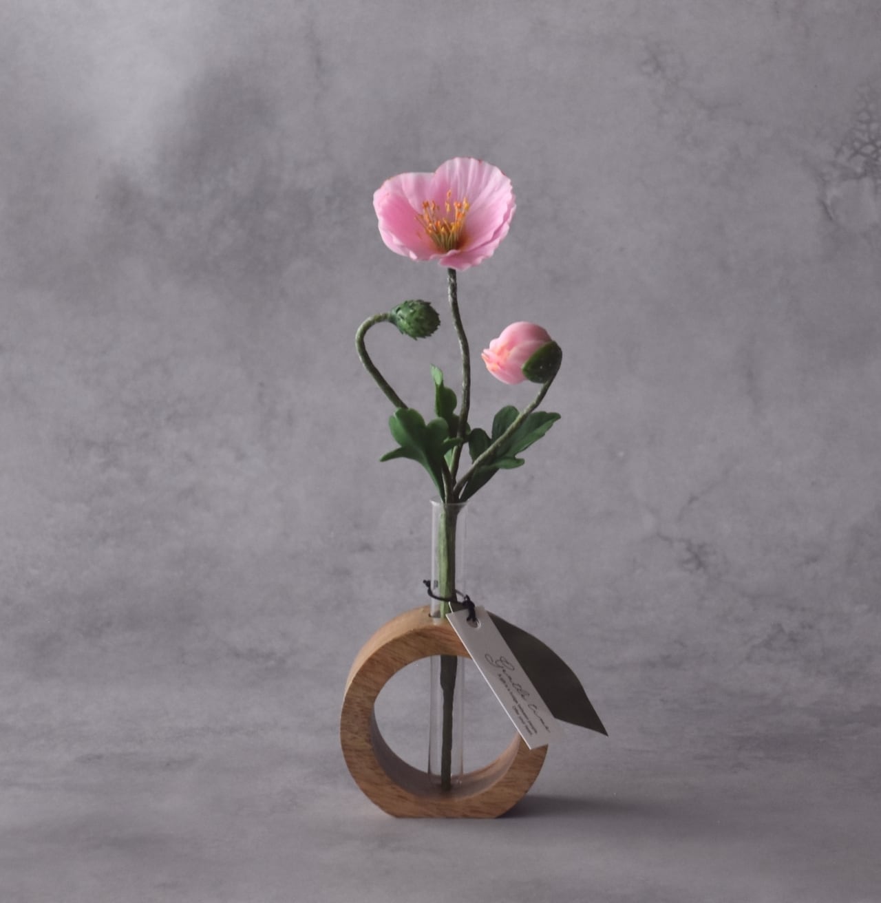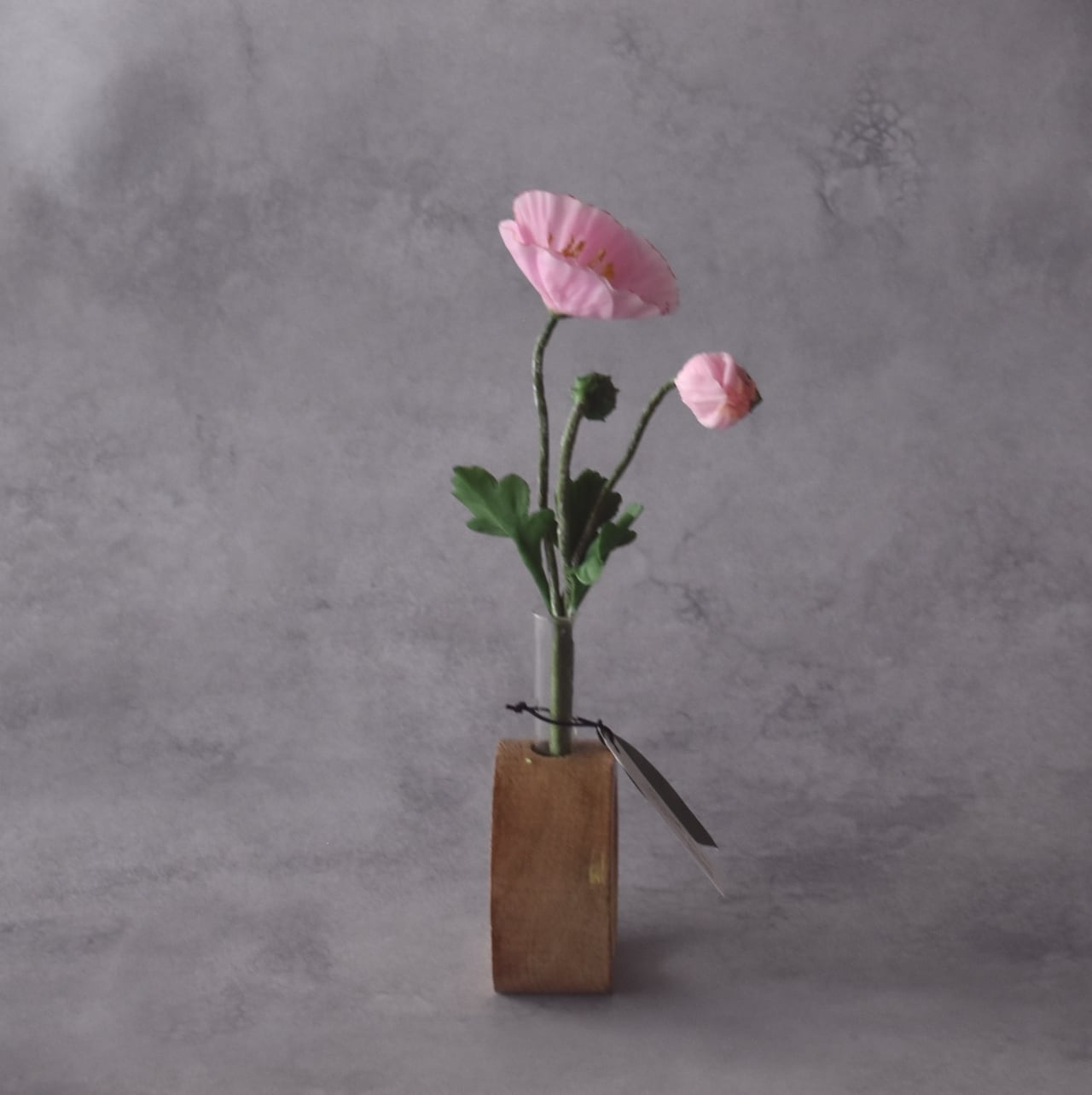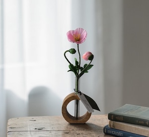 お花を生けているフラワーボトルは試験管とウッドを組み合わせたシンプルなフラワ-ベ-スです。丸みを帯びたやわらかいデザインが特徴で、天然素材のウッドがポピー花の鮮やかな美しさを引き立ててくれます。
