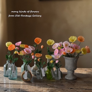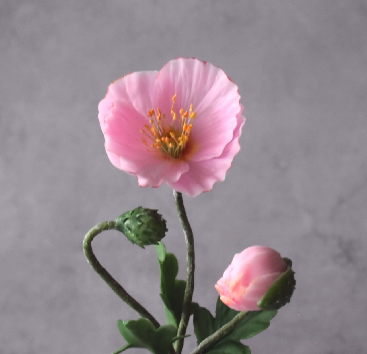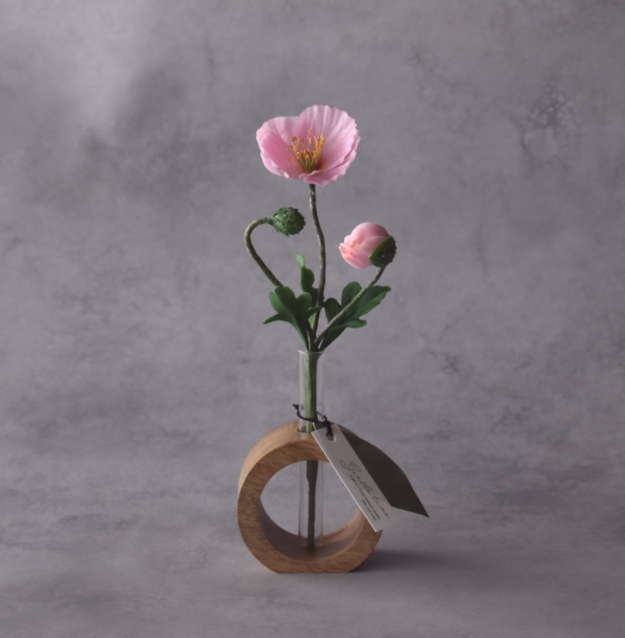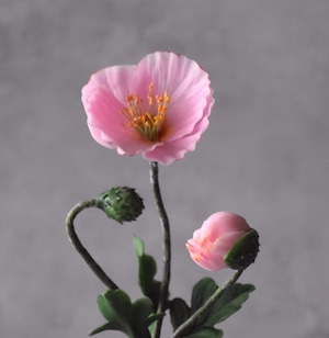 ポピーの柔らかく繊細な花びらを表現するために、粘土を薄く丁寧に伸ばし、フリルをたっぷりとあしらっています。