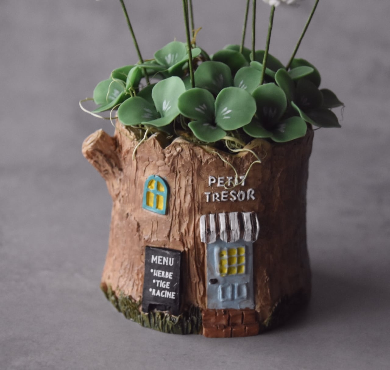 粘土でシロツメクサを作り、切り株型のフラワーポットに植え込みました。