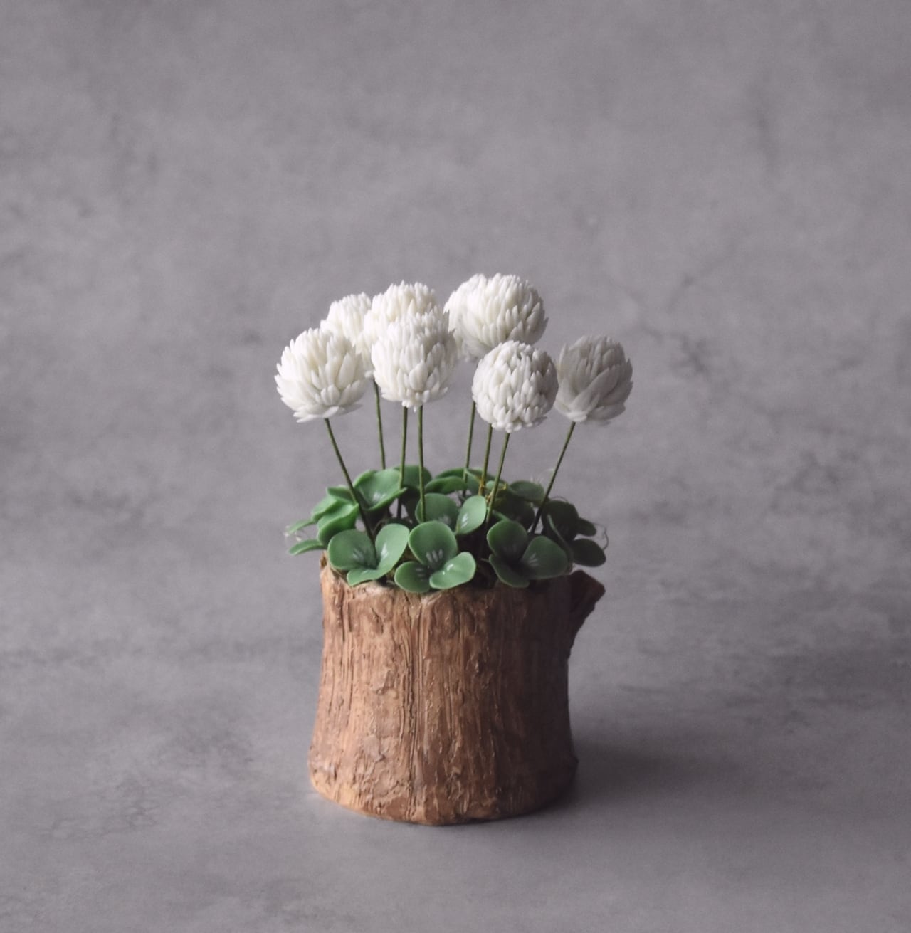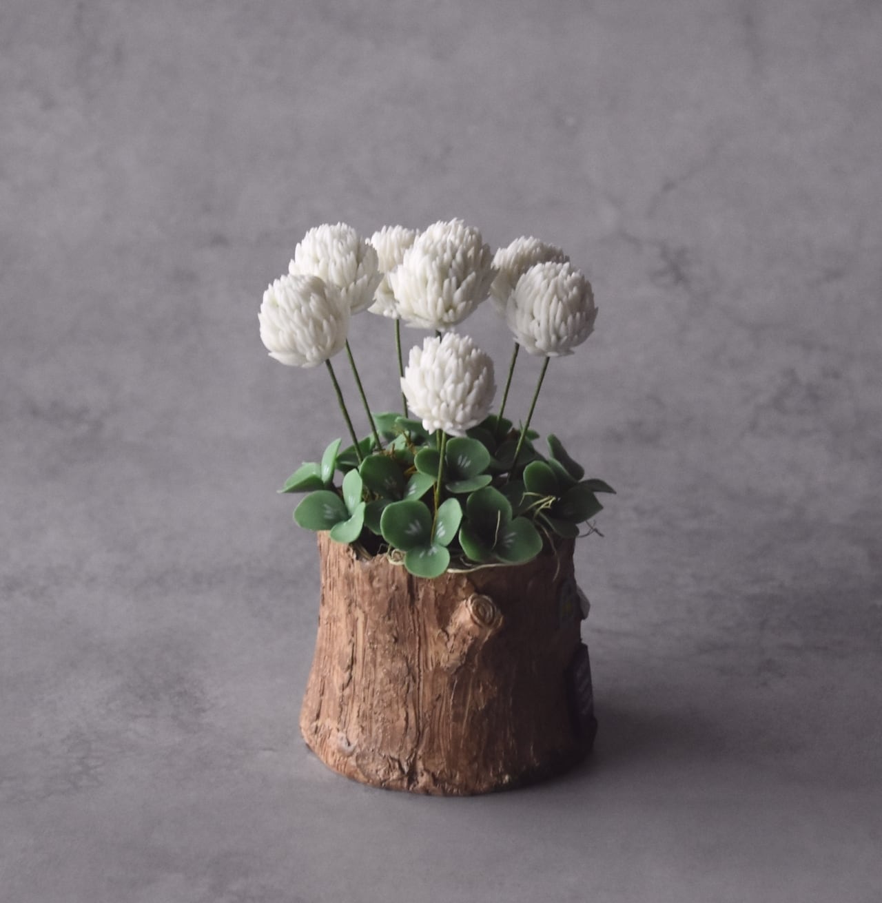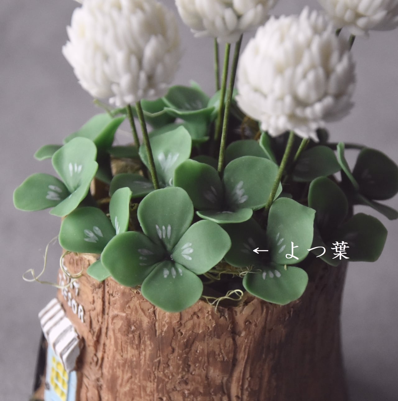 ◆シロツメクサのクレイフラワー◆*四つ葉クローバー入り|ミニサイズ・切り株ポット*枯れない花 S1440