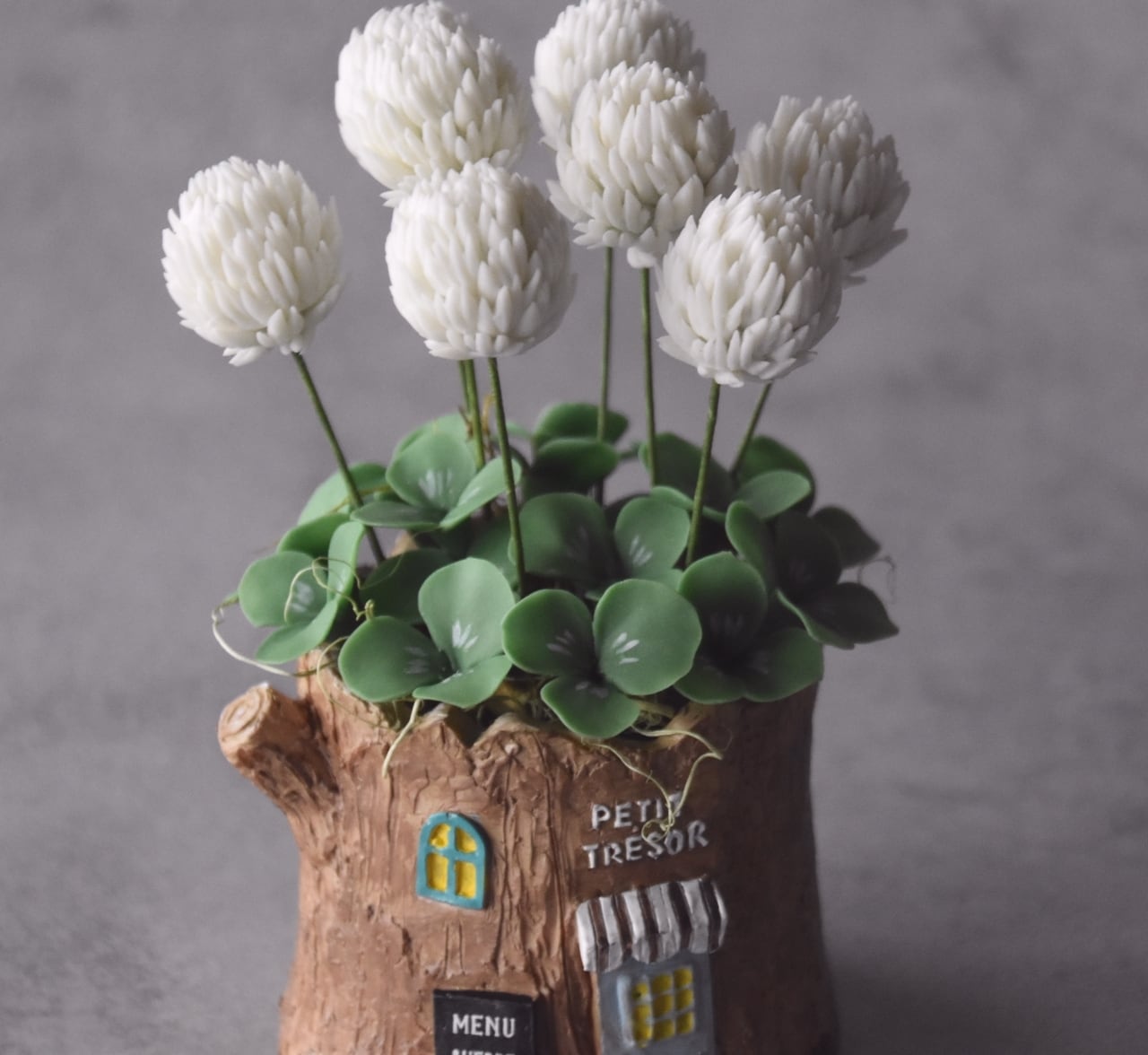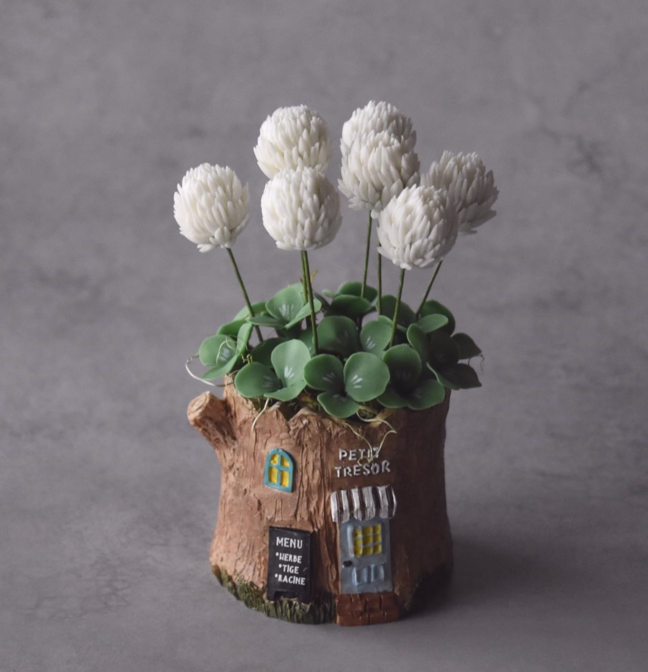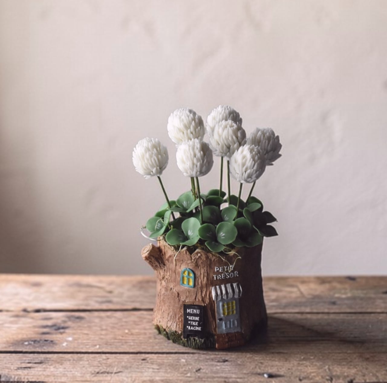 ◆シロツメクサのクレイフラワー◆*四つ葉クローバー入り|ミニサイズ・切り株ポット*枯れない花 S1440