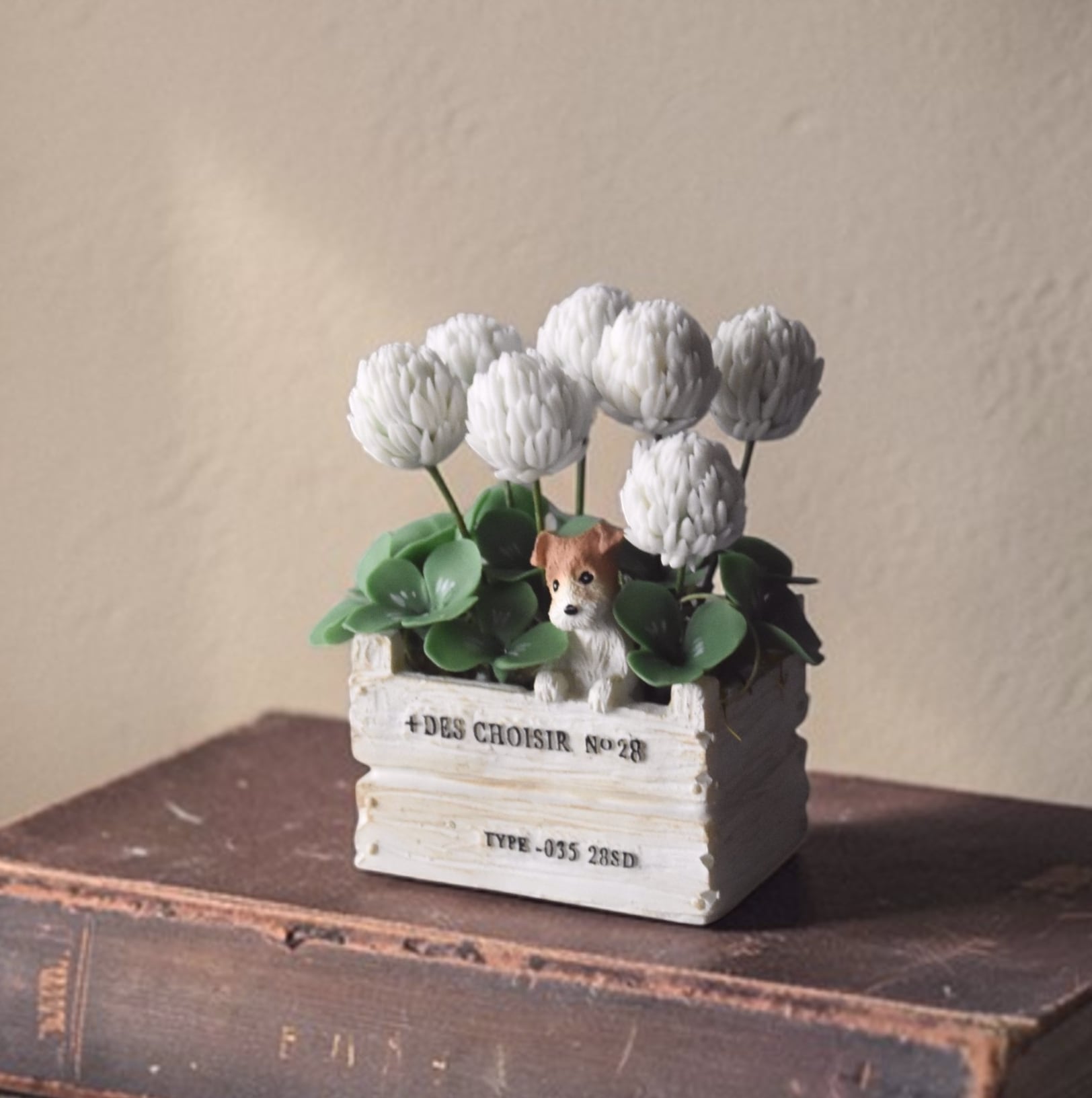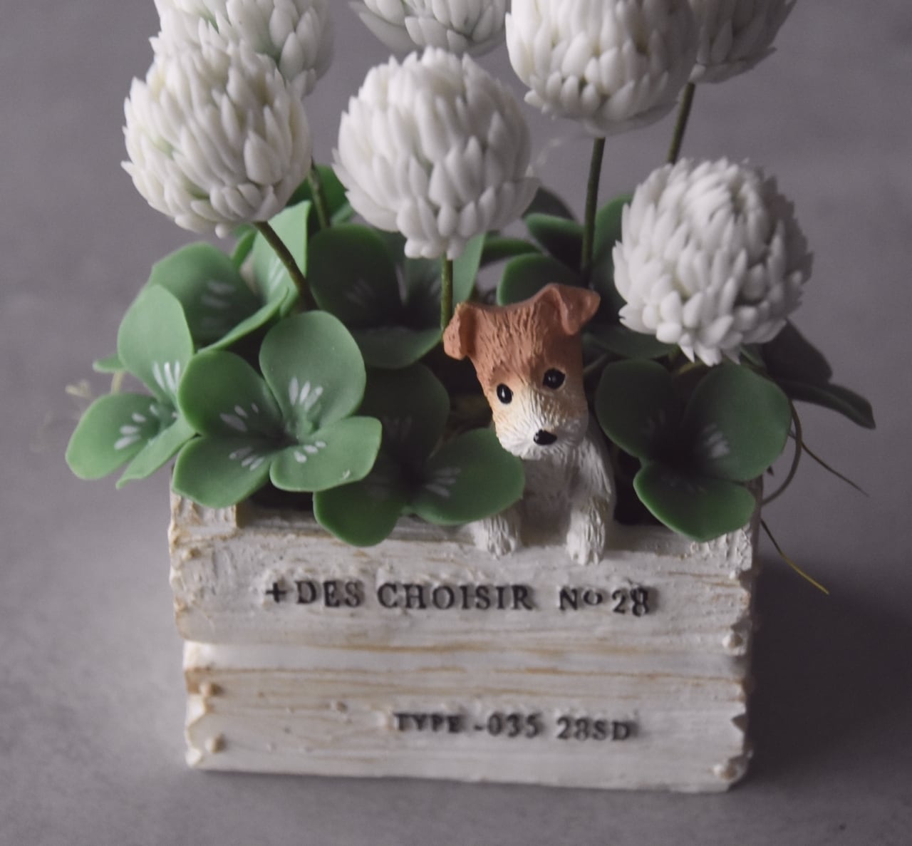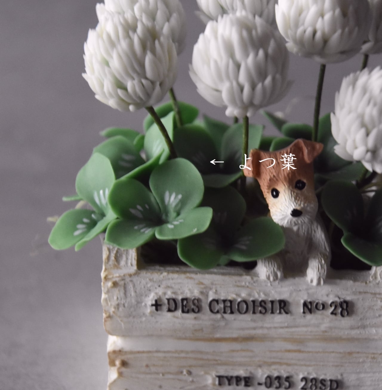 ◆シロツメクサのクレイフラワー◆*四つ葉クローバー入り|ミニサイズ・犬・BOXポット*枯れない花 S1442