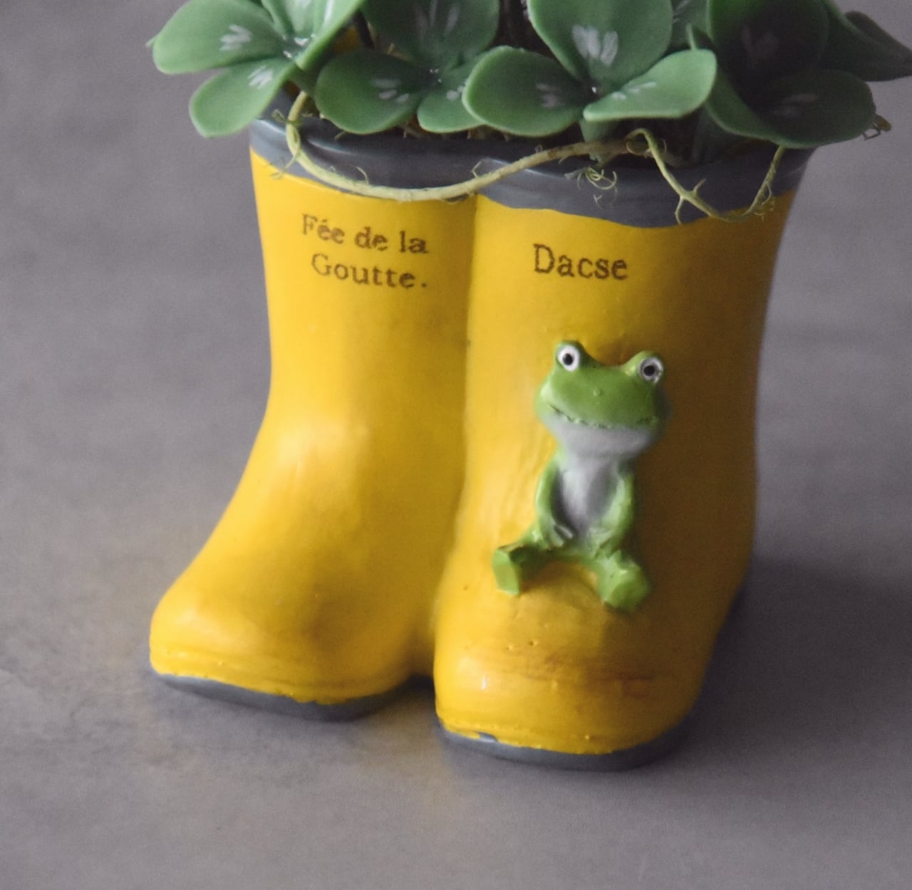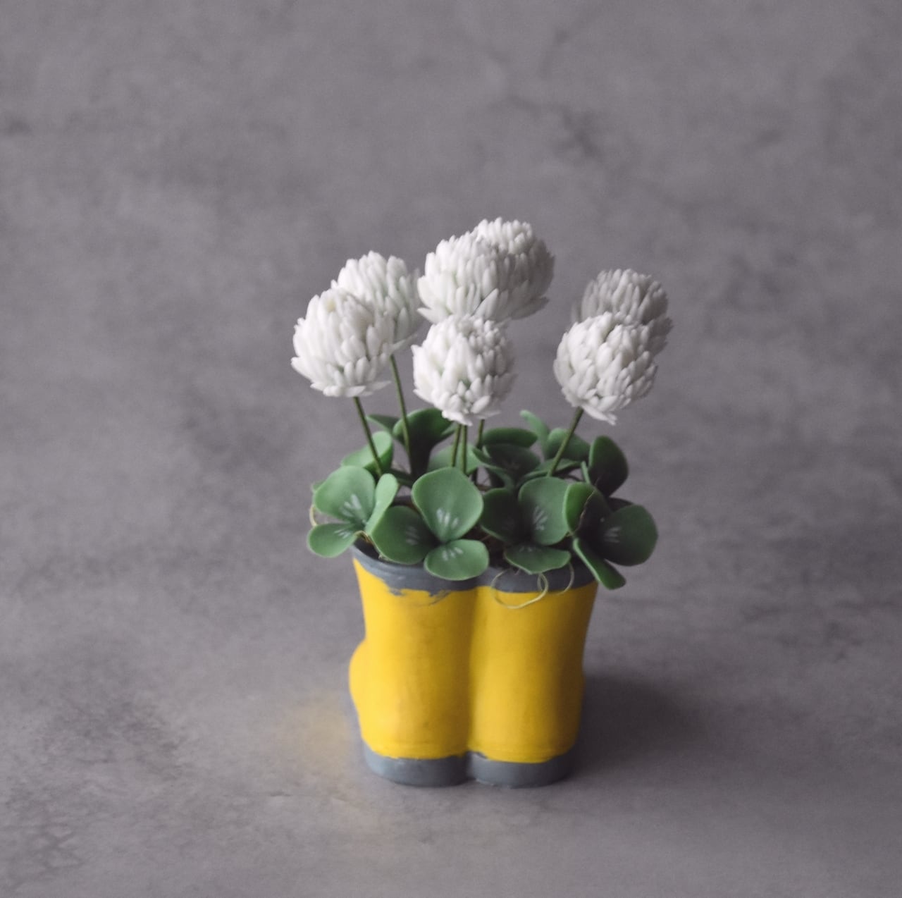 粘土でシロツメクサを作り、長靴型のフラワーポットに植え込みました。
