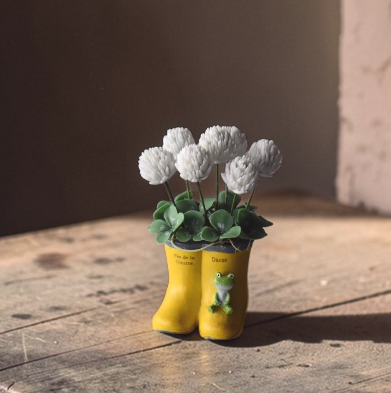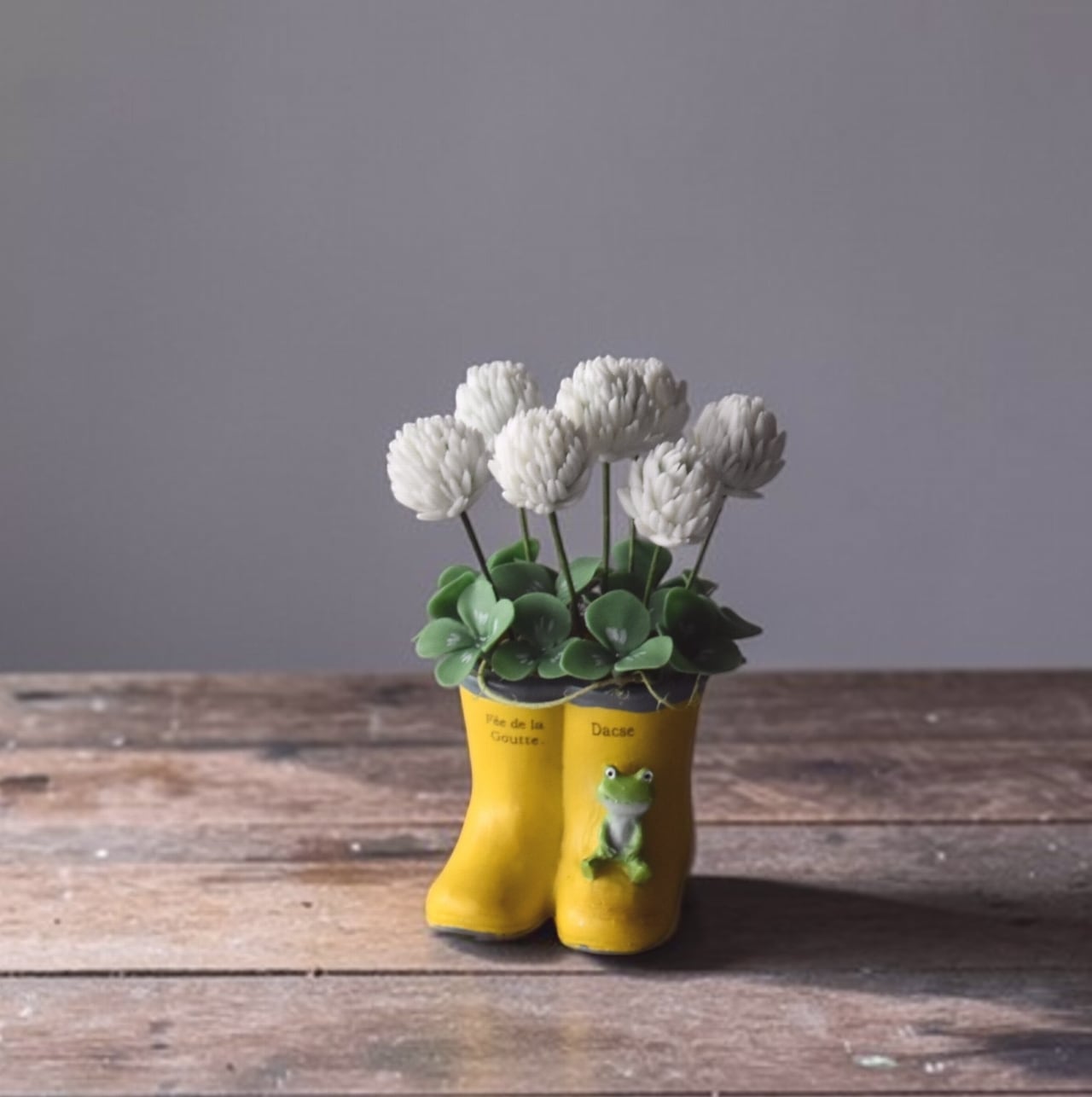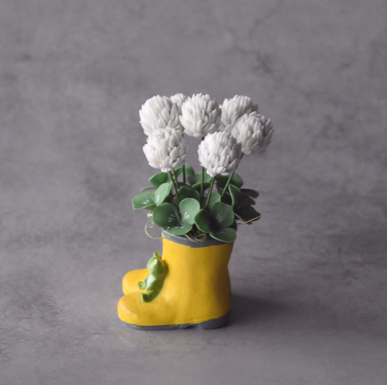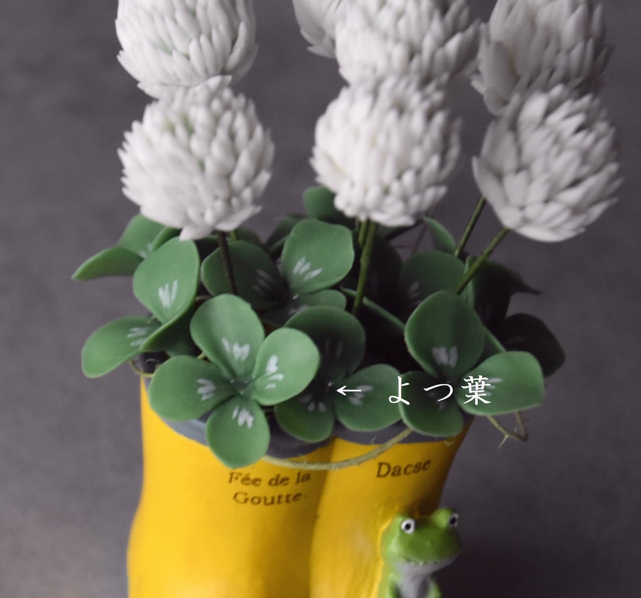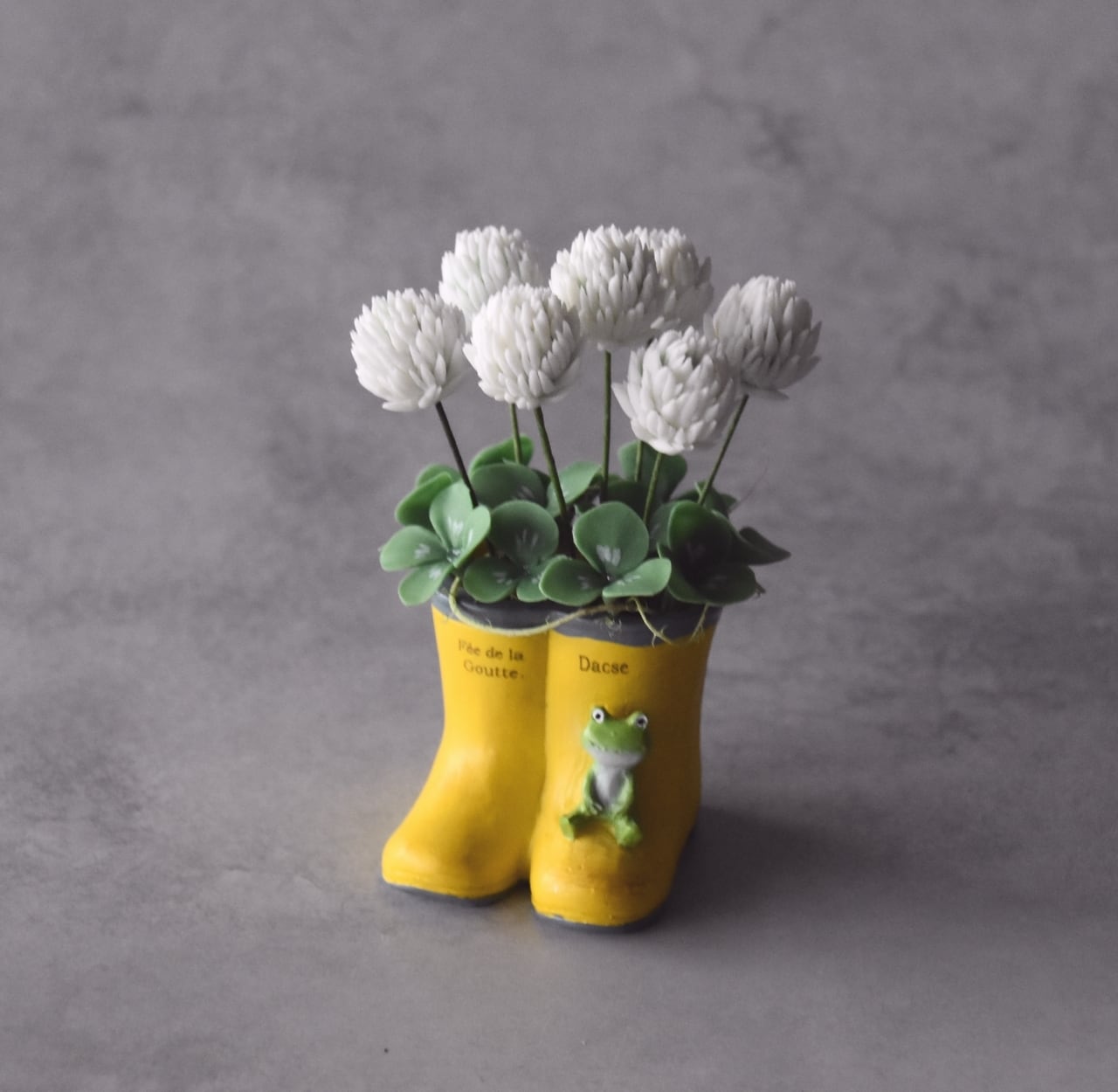 ◆シロツメクサのクレイフラワー◆*四つ葉クローバー入り|ミニサイズ・長靴・カエルプランター*枯れない花 S1446