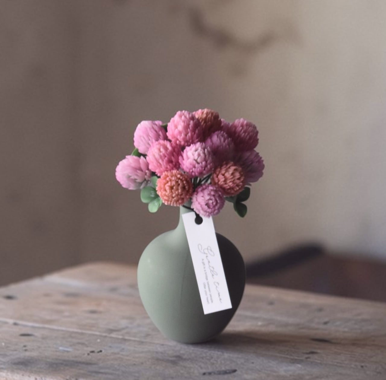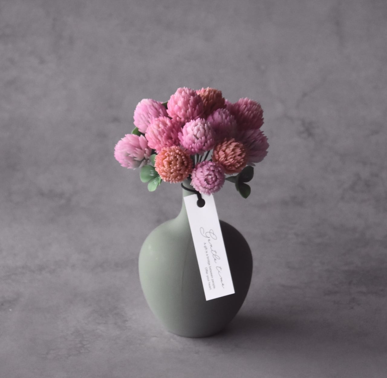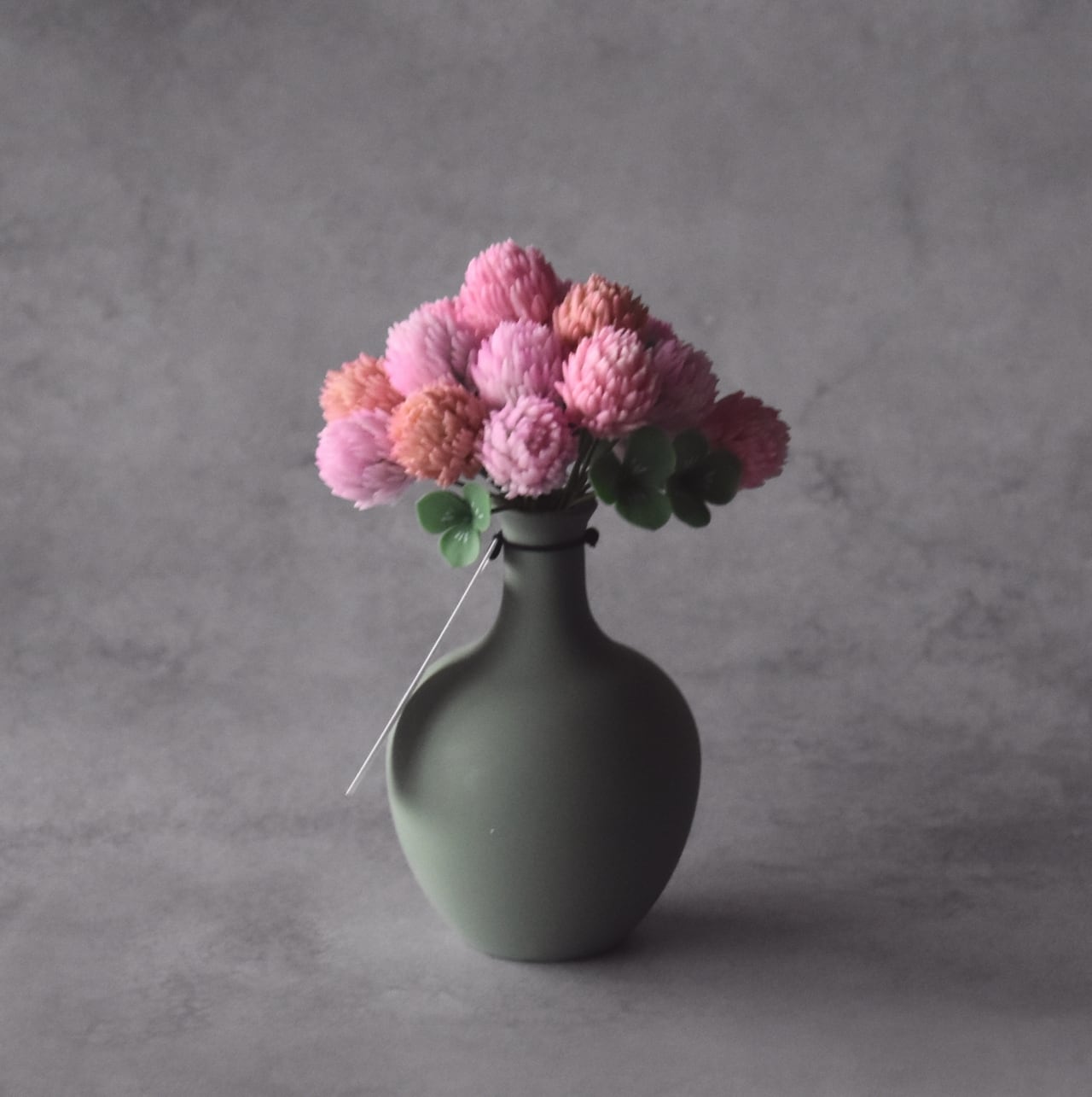 すっきりとしたフォルムが、モモイロシロツメクサの可愛く温かい印象を引き立てます。