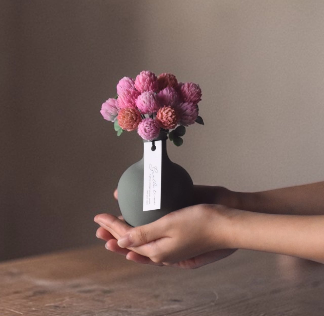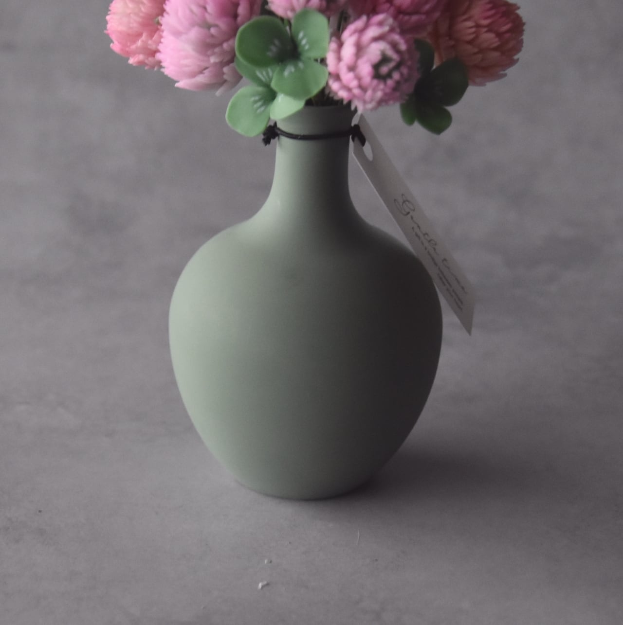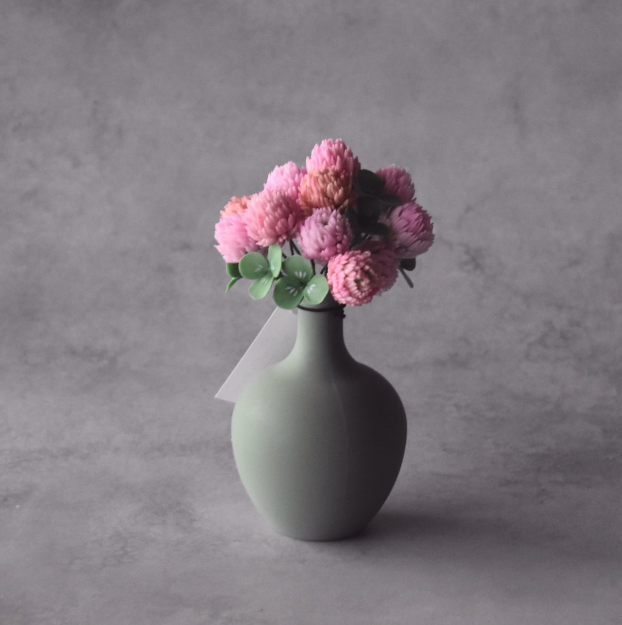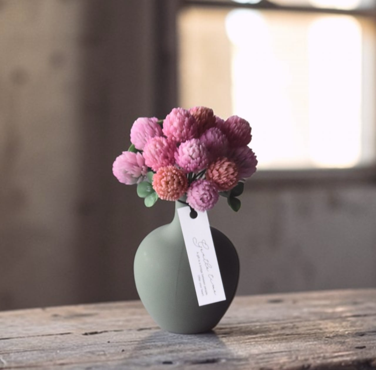 すっきりとしたフォルムが、モモイロシロツメクサの可愛く温かい印象を引き立てます。