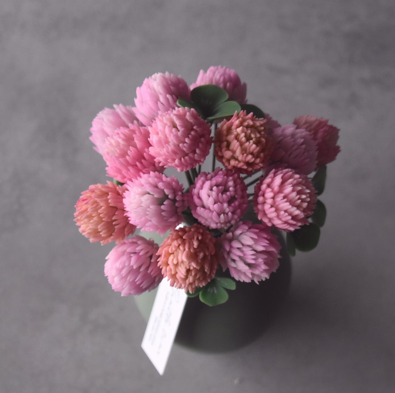 粘土で、ほんのりピンクに色づいたモモイロシロツメクサを作りました。