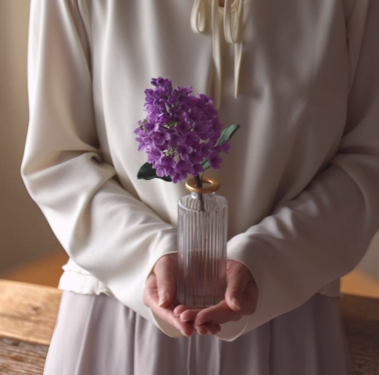 シンプルなデザインで、どんな空間にも自然になじみ、エレガントさがライラックの鮮やかな美しさを引き立ててくれます。