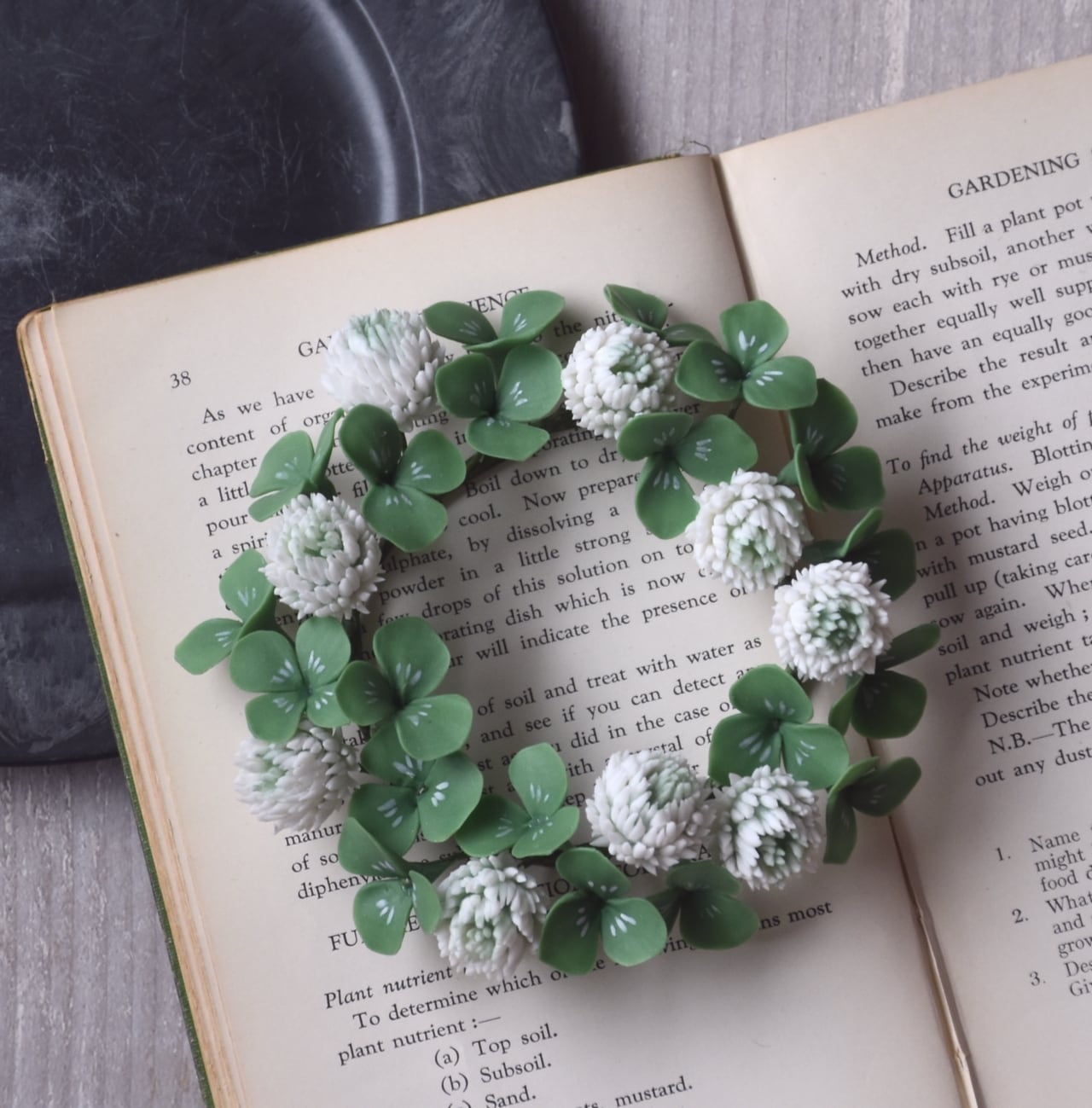粘土(クレイ)で小さなシロツメクサを一つひとつ丁寧に制作し、ナチュラルなミニリースに仕上げました。