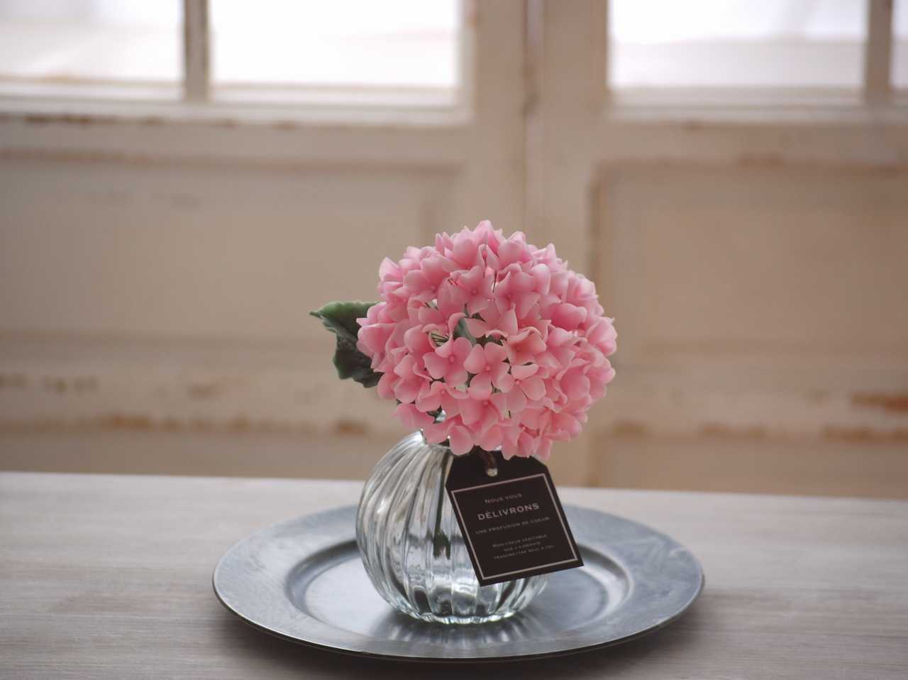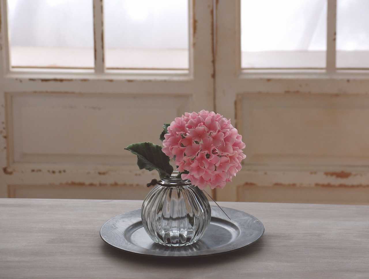 粘土で紫陽花を作り、ぽってりとした可愛いガラスボトルに飾りました。