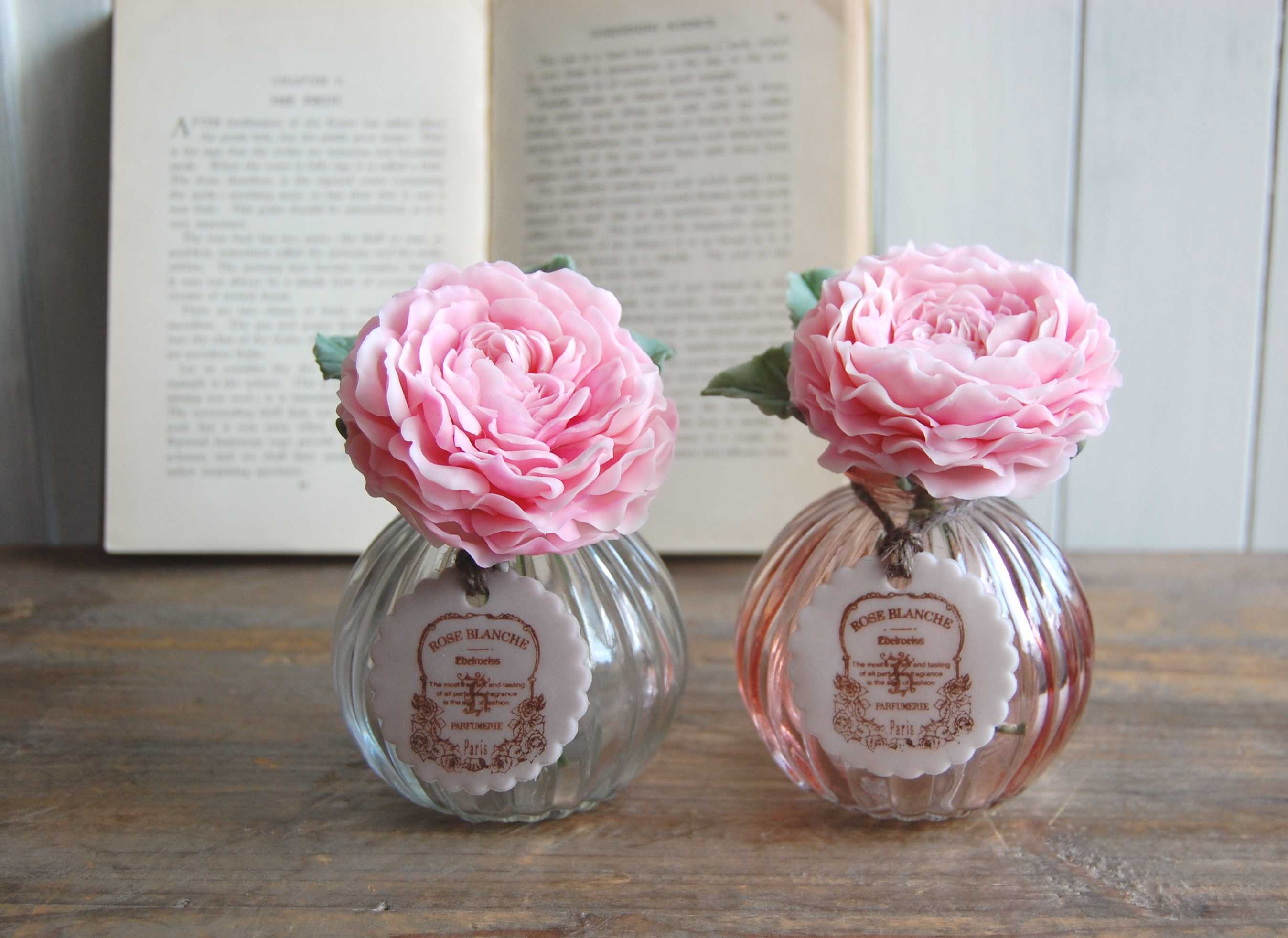 上品で優雅なイングリッシュローズを可愛いガラスボトル(ピンク)に飾りました。
