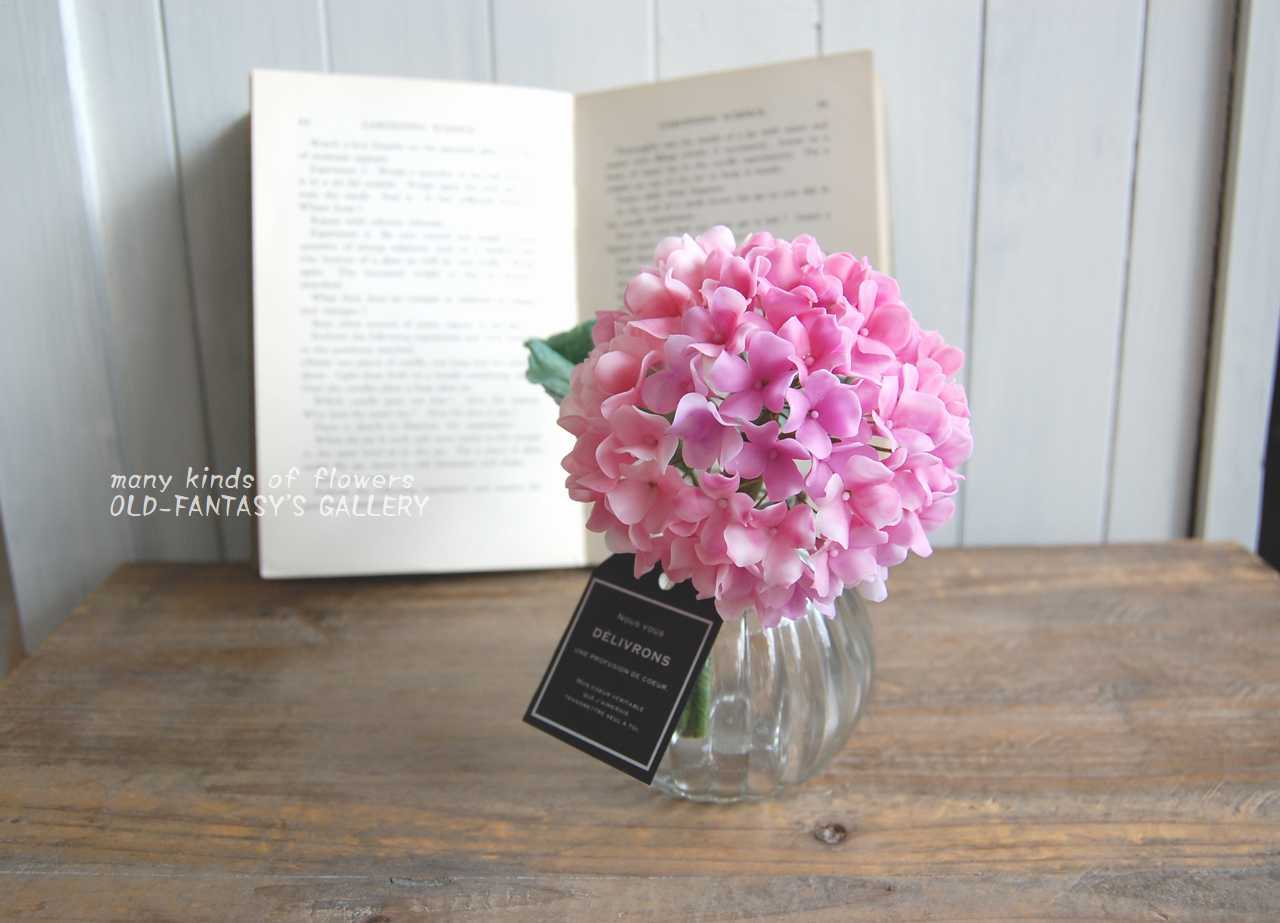 紫陽花をぽってりガラスボトルに飾って・・・ピンク&パープル 高さ約16センチ A403