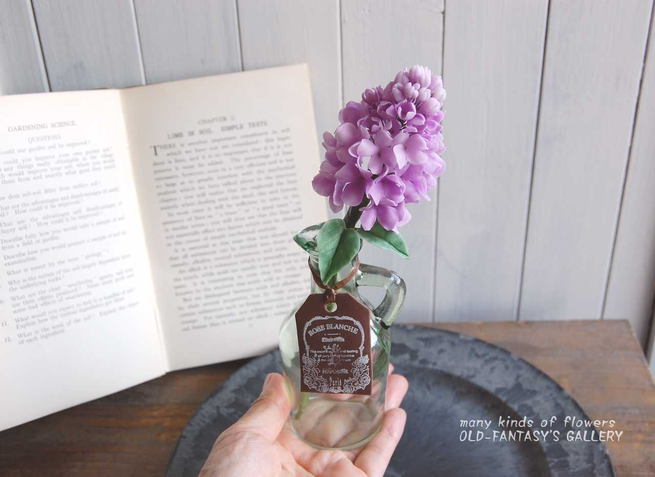 優しげなライラックの花を粘土で作り、可愛いボトルベースに飾りました。