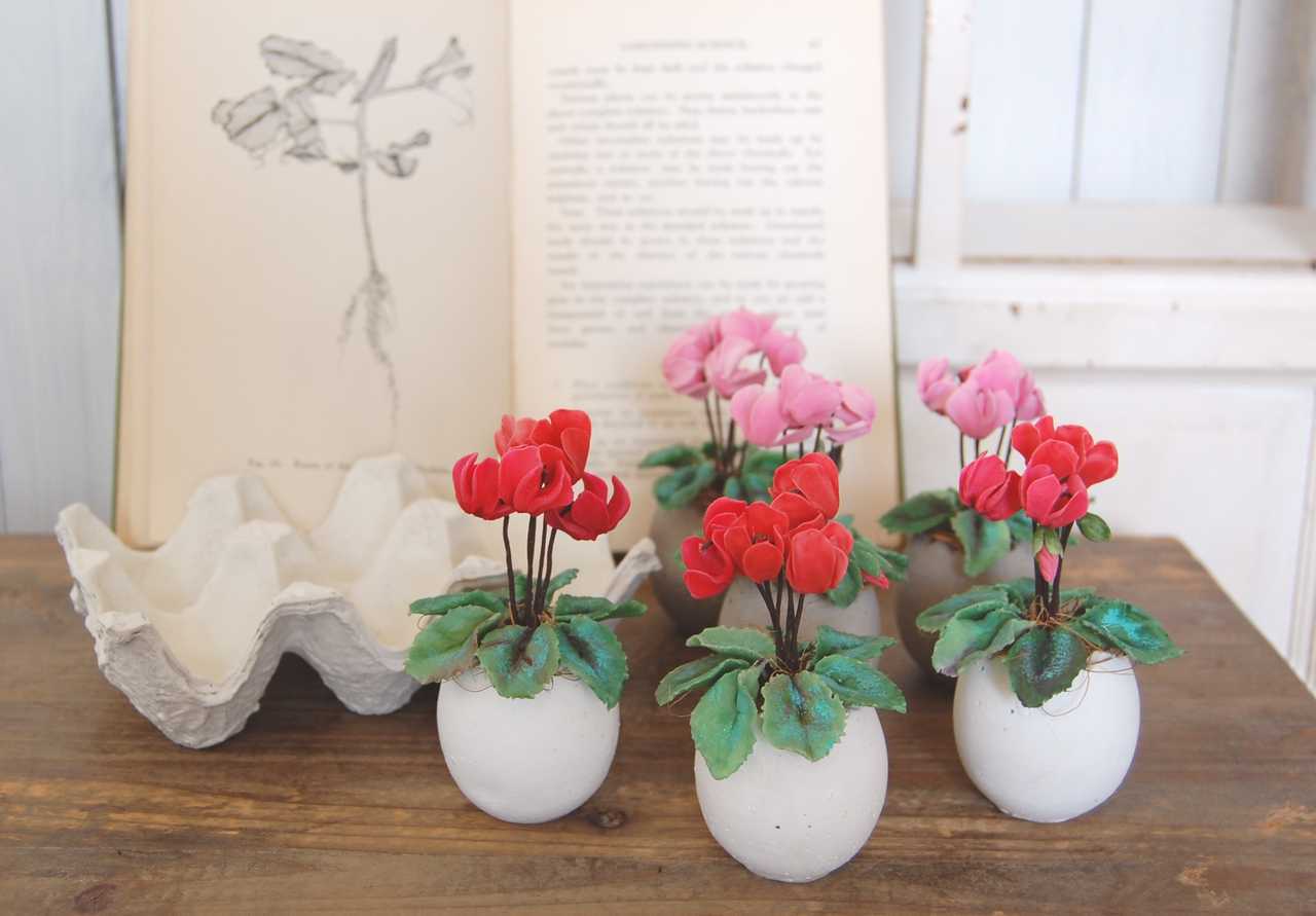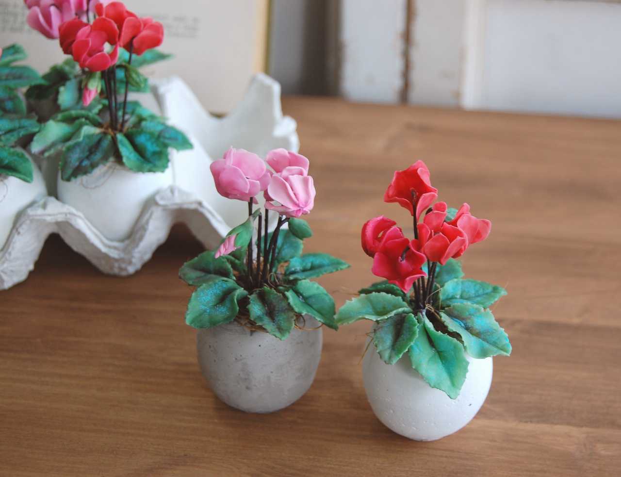 粘土でシクラメンを作り可愛いたまごモチーフのセメントポットに植え込みました。