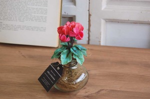 シクラメンは粘土で出来ています。ガラスボトルには装飾用のココナッツファイバーを詰めています。シクラメンの花、葉は茎で一つにまとめ、ガラスボトルに挿しています。シクラメンとボトルに少し接着剤を付けていますが、ほぼコナッツファイバーで支えています。完全に固定していない為、触ると少しぐらつきます。テーブル等に置いてお楽しみいただくことに支障はありません。