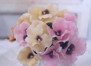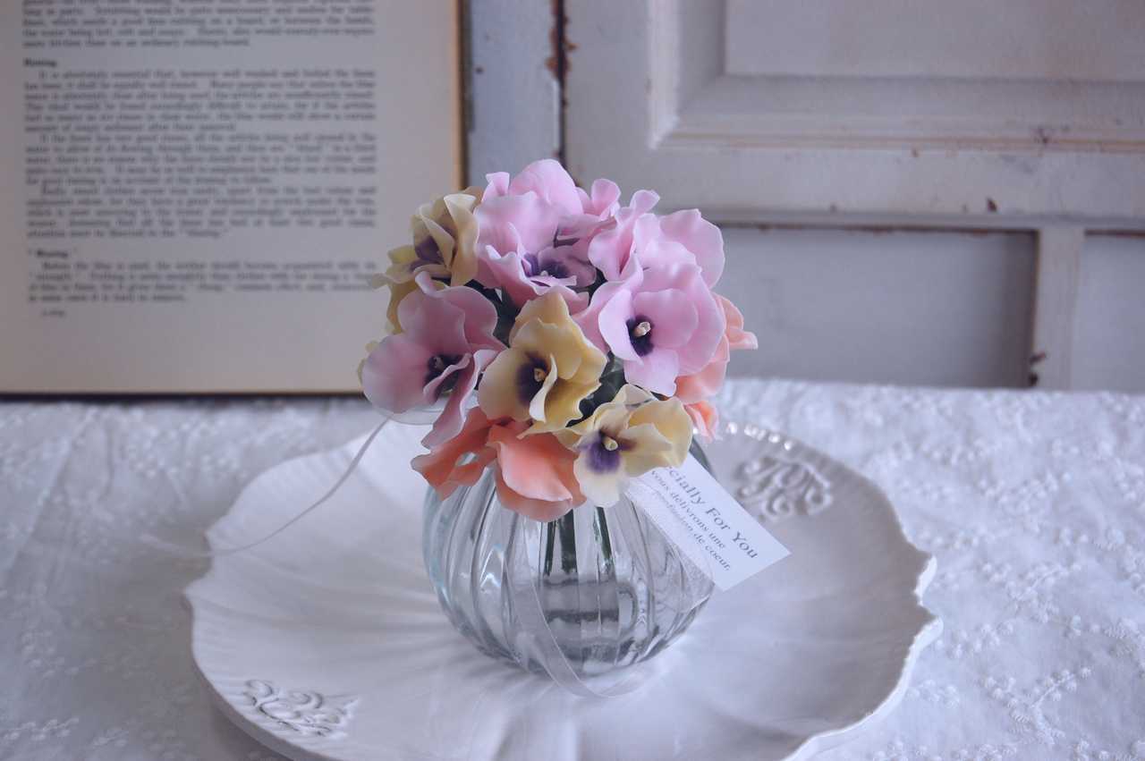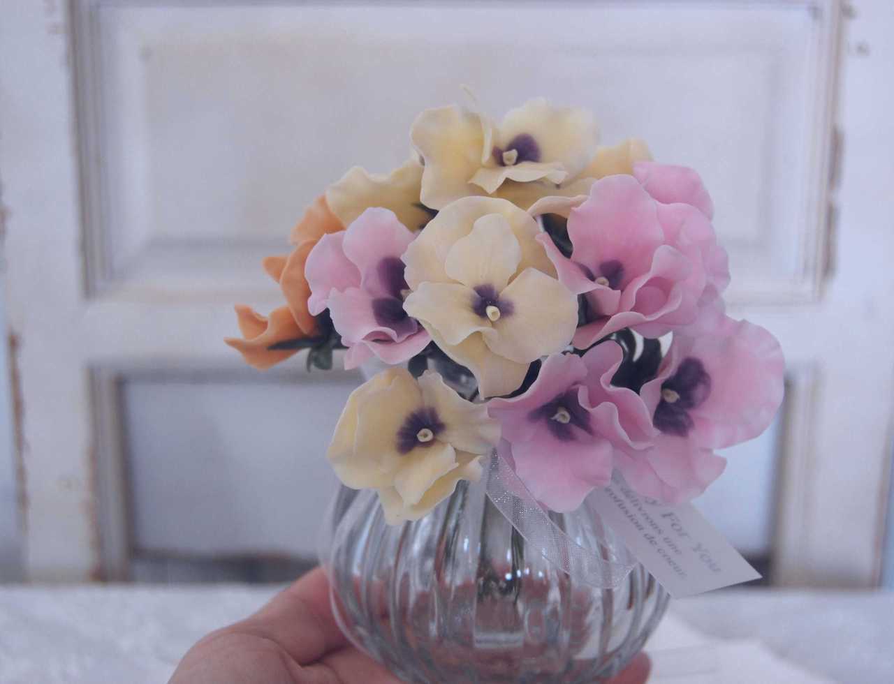 ビオラをぽってりガラスボトルに飾って・・・ピンク&オレンジ&イエロー B425