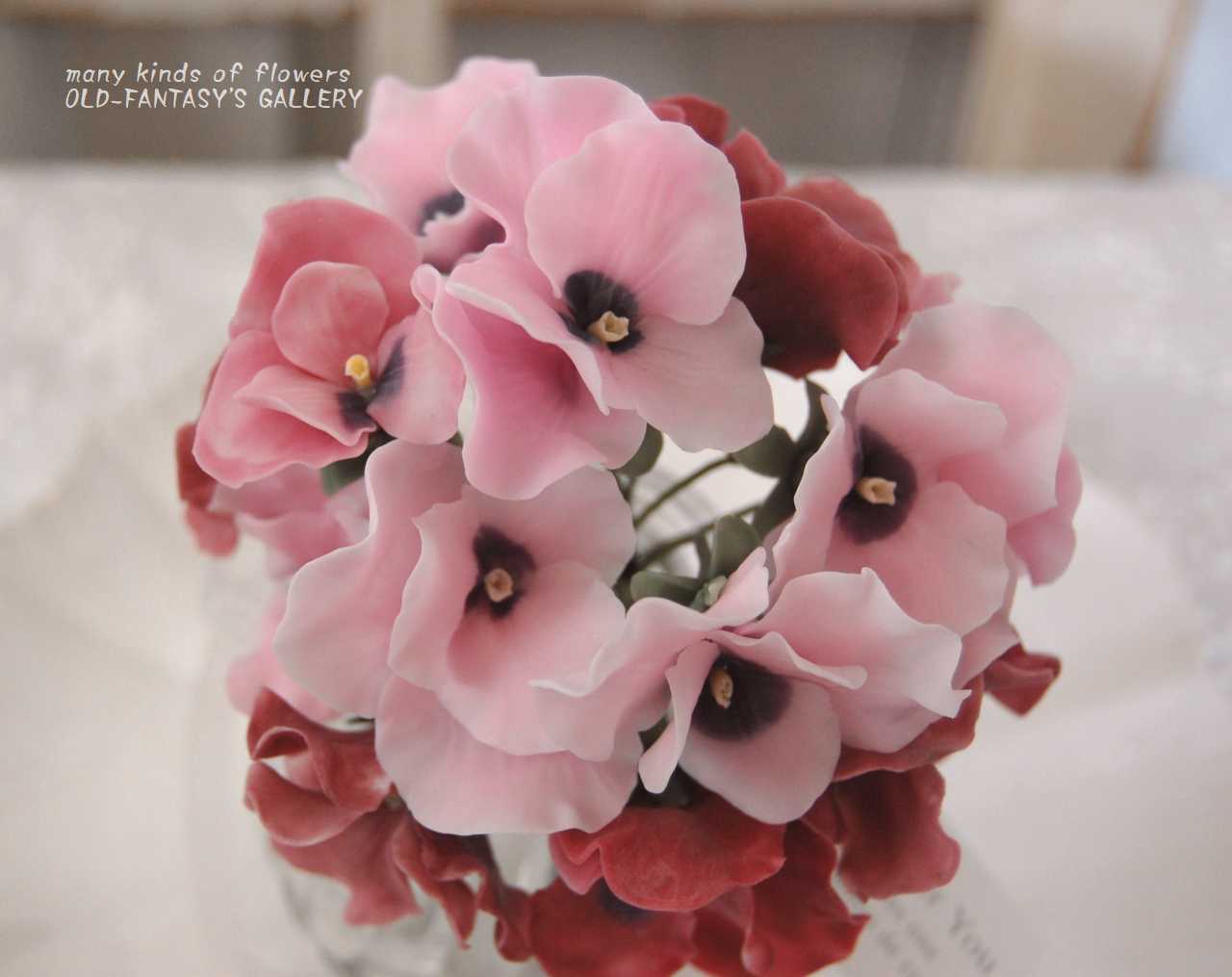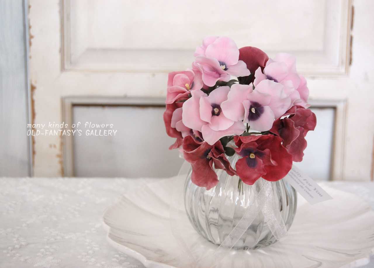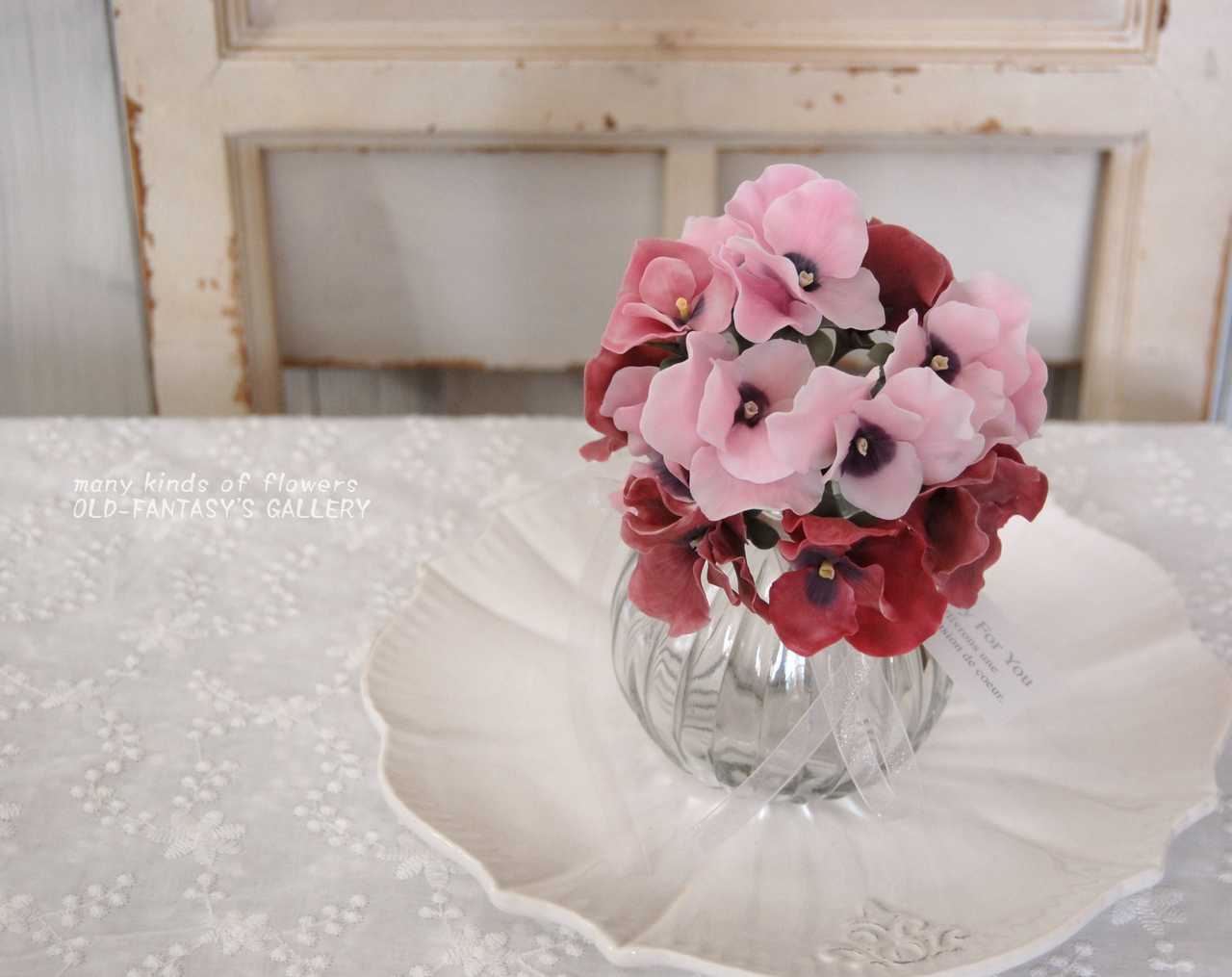 ビオラをぽってりガラスボトルに飾って・・・ピンク&ダークレッド B426