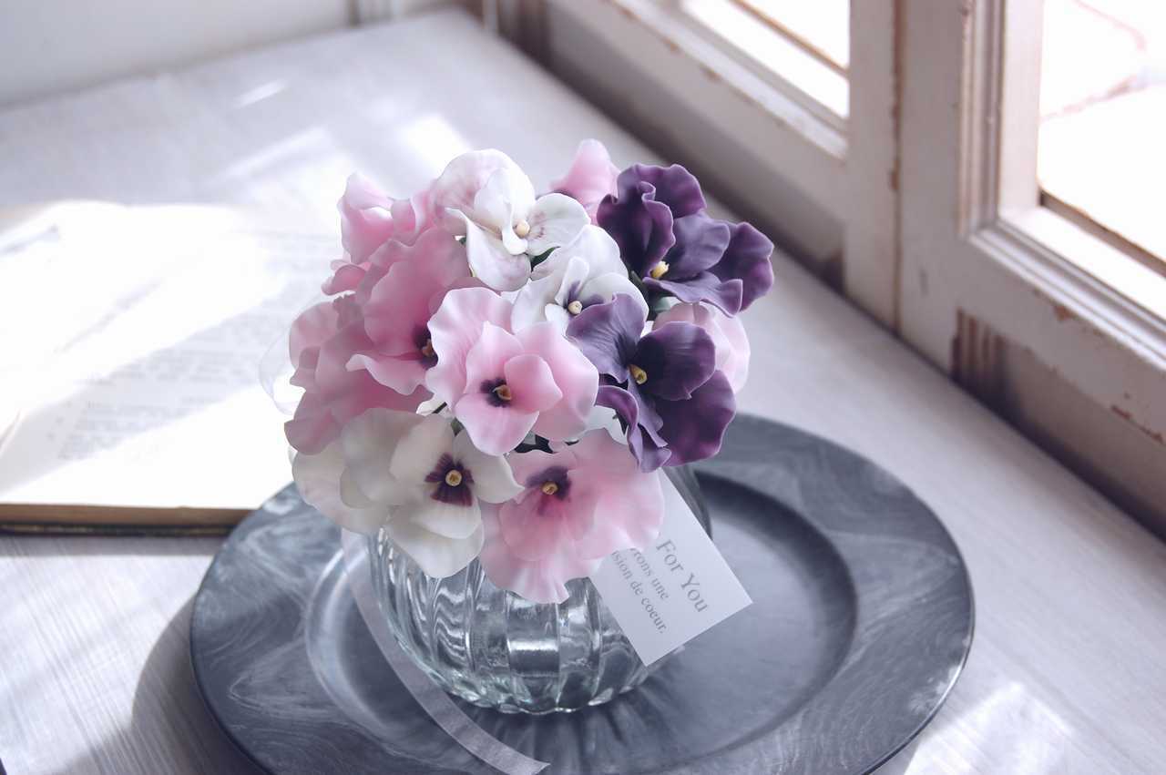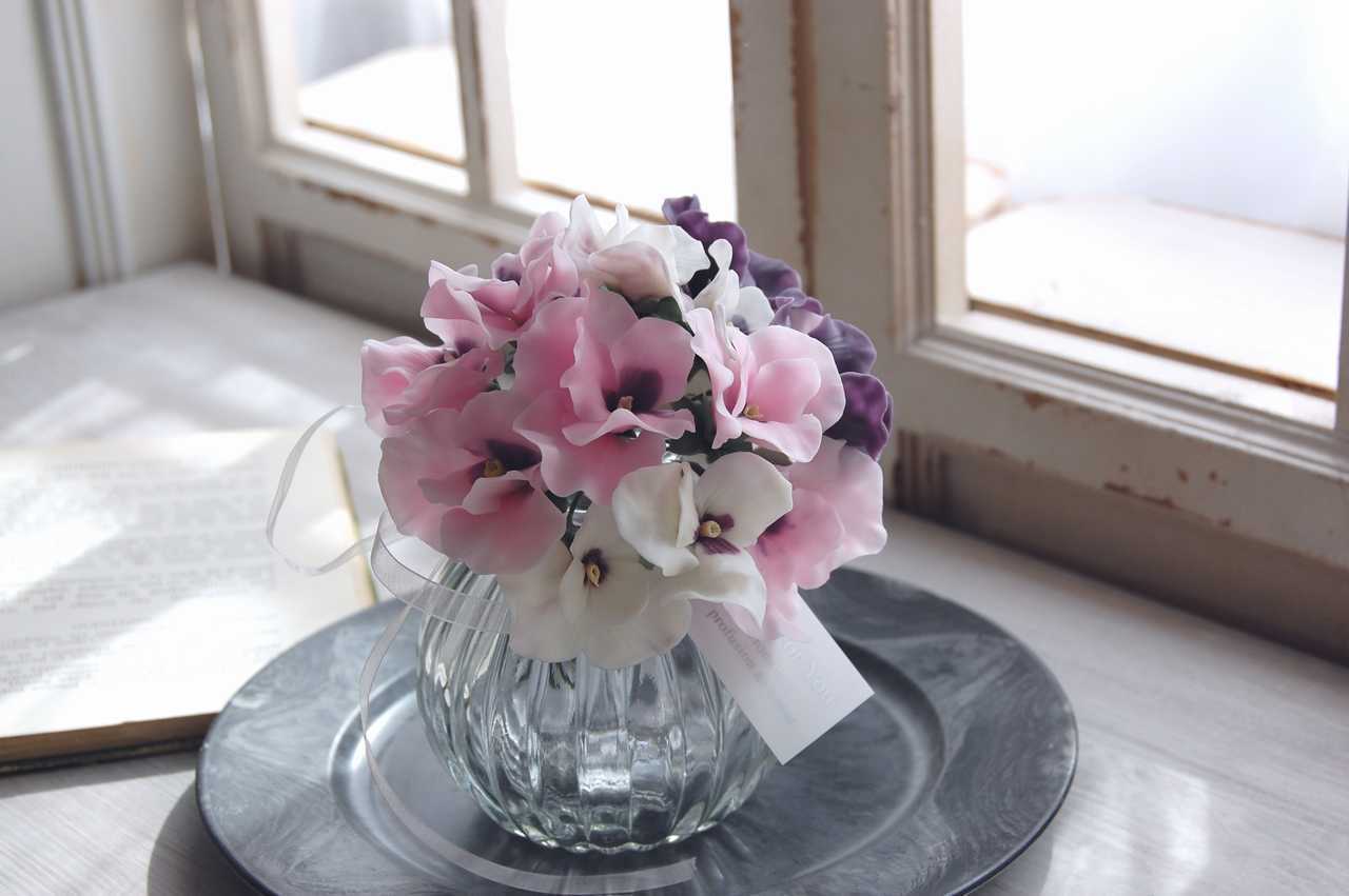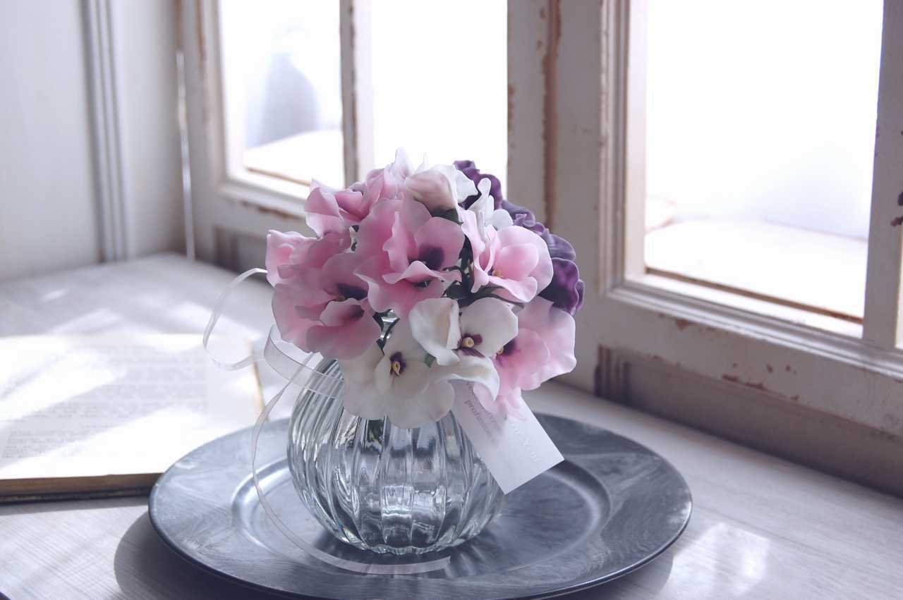 ビオラをぽってりガラスボトルに飾って・・・ピンク&ホワイト&パープル B427