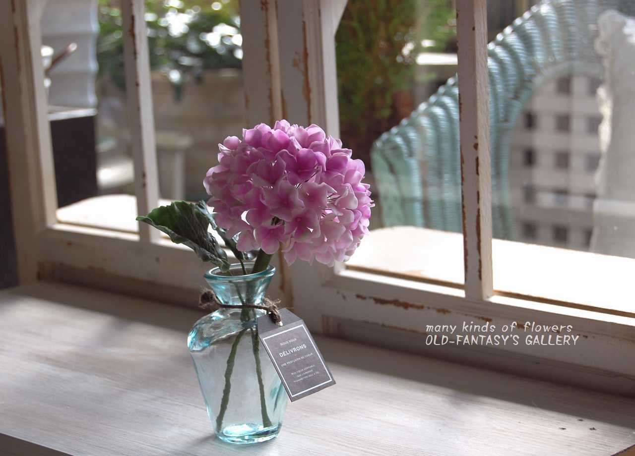 紫陽花をガラスボトルに飾って・・・ピンクパープル 高さ約19センチ A432
